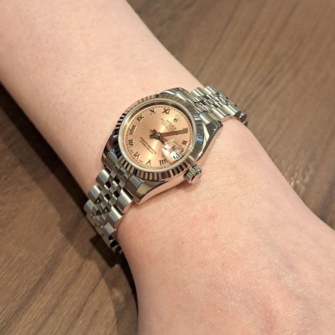 フラッシュフィットやブレスレットに薄っすらとペン先程度の小さな打ち傷が僅かにございますが、どれも大きく目立つものではありません。