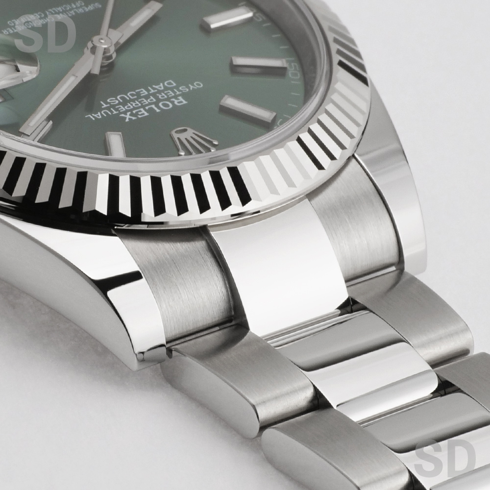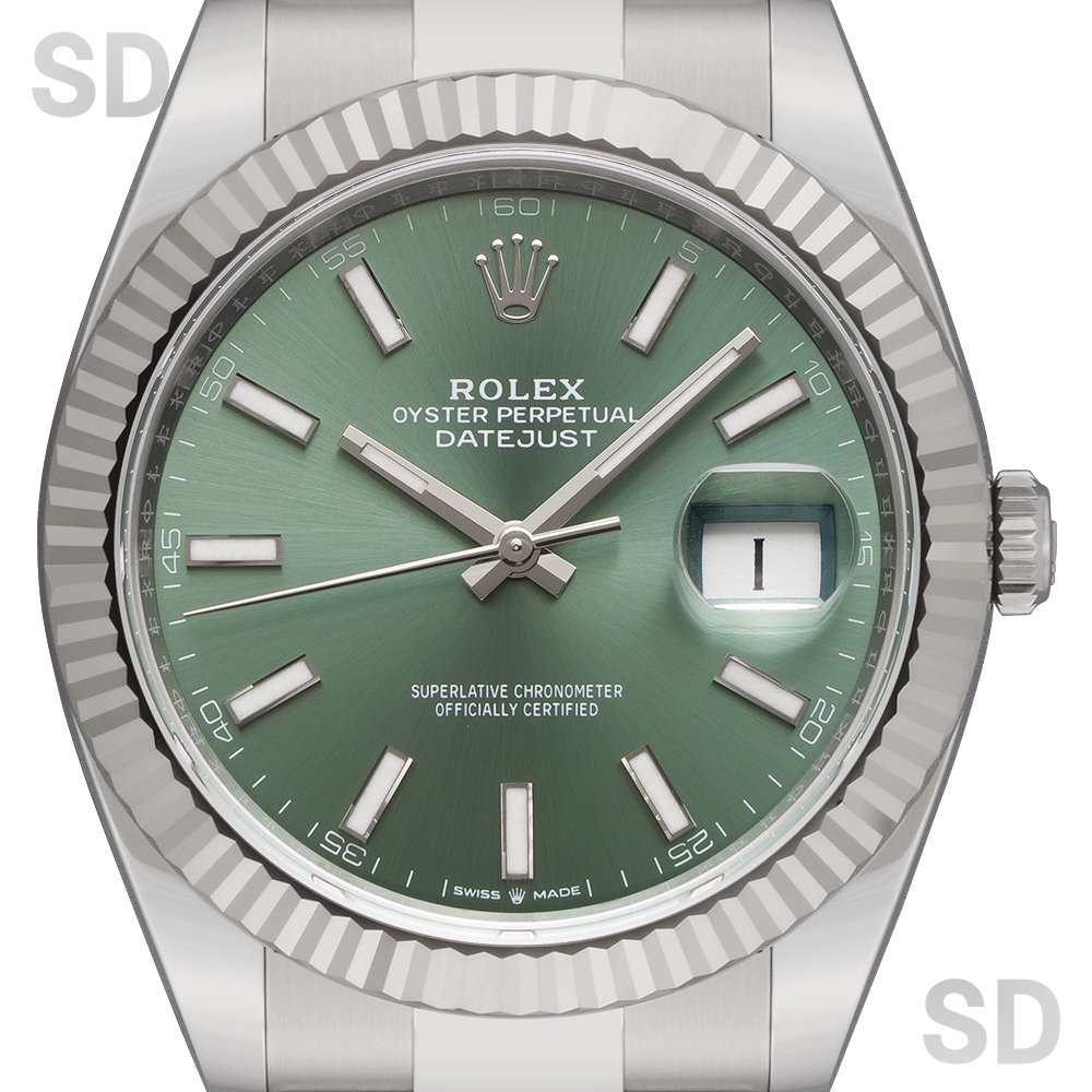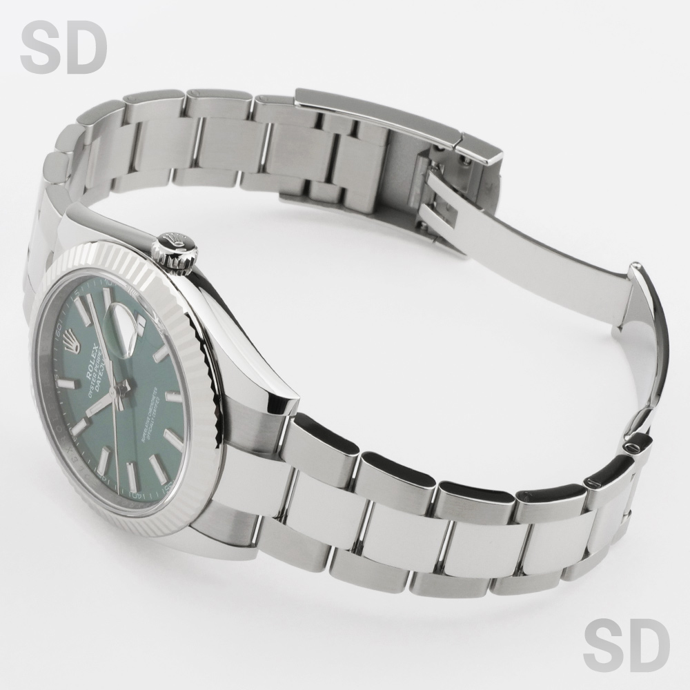 デイトジャスト41 ホワイトゴールドベゼルモデル 126334 が入荷いたしました。こちらの個体は、2022年に新たにコレクションへ加わった話題のミントグリーンダイヤルを採用した一本でございます。爽やかでありながら上品なグリーンの色調は、光の加減によって多彩な表情を見せ、ステンレススチールとホワイトゴールドのコンビネーションと相まって、知的かつ華やかな印象を演出いたします。また、ブレスレットにはオイスターブレスレットを装備しており、デイトジャストならではの気品と快適な装着感を両立しております。