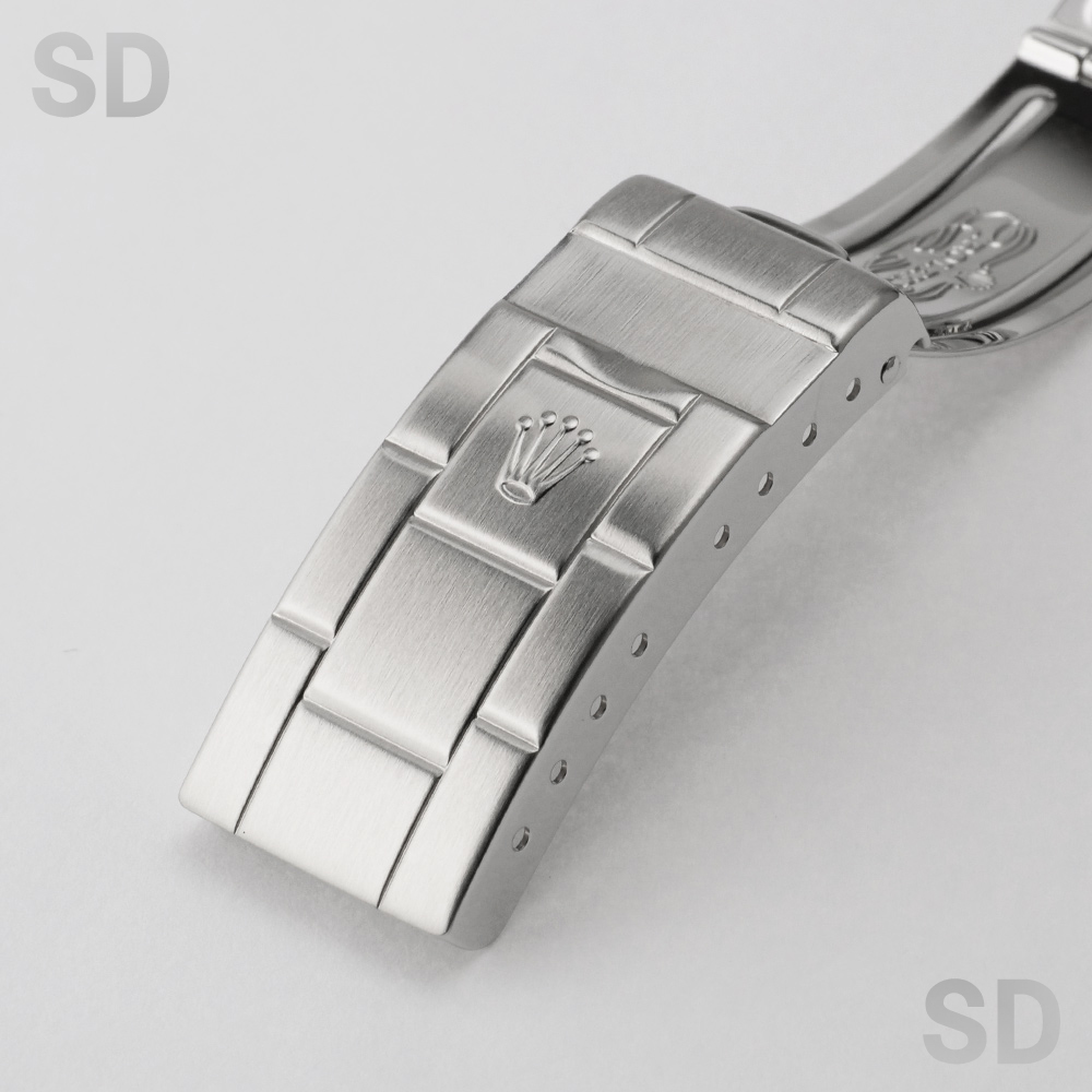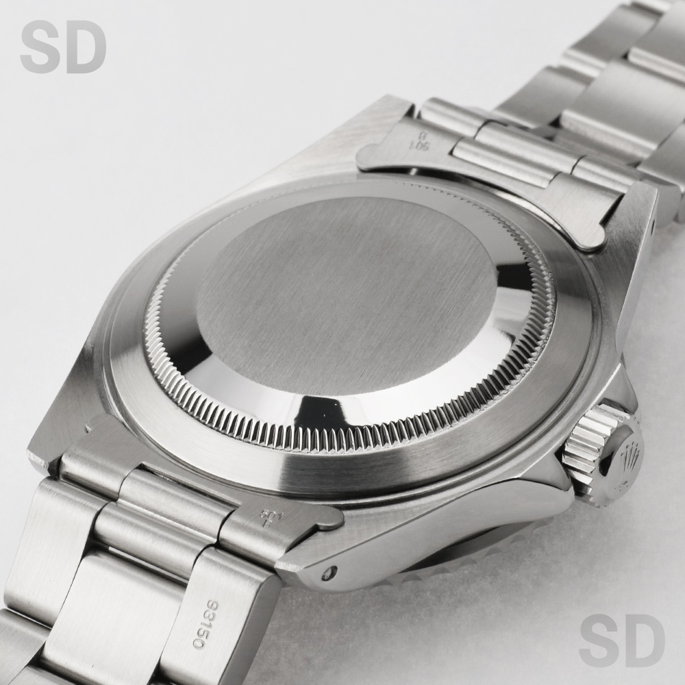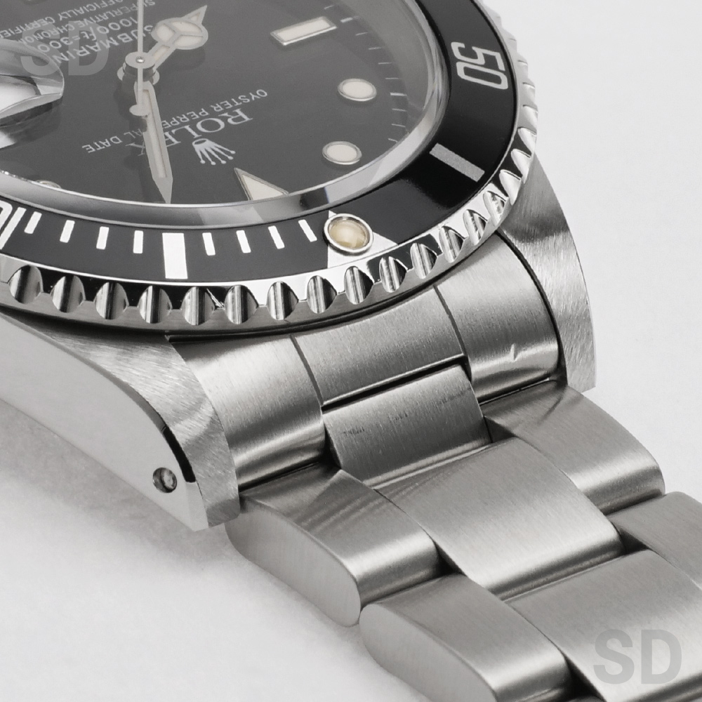 外装に関しましては、当店提携の修理工房にて研磨を施しております。ベゼル外周やリューズ、フラッシュフィット部分にわずかに取り切れない小傷が残る程度で、特筆すべき大きなダメージは一切ございません。ブレスレットの伸びも少なく、年式を考慮すれば美しいコンディションといえる仕上がりです。