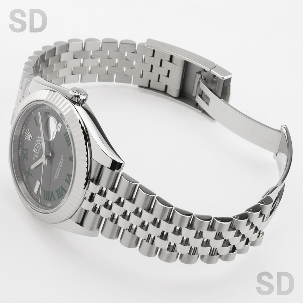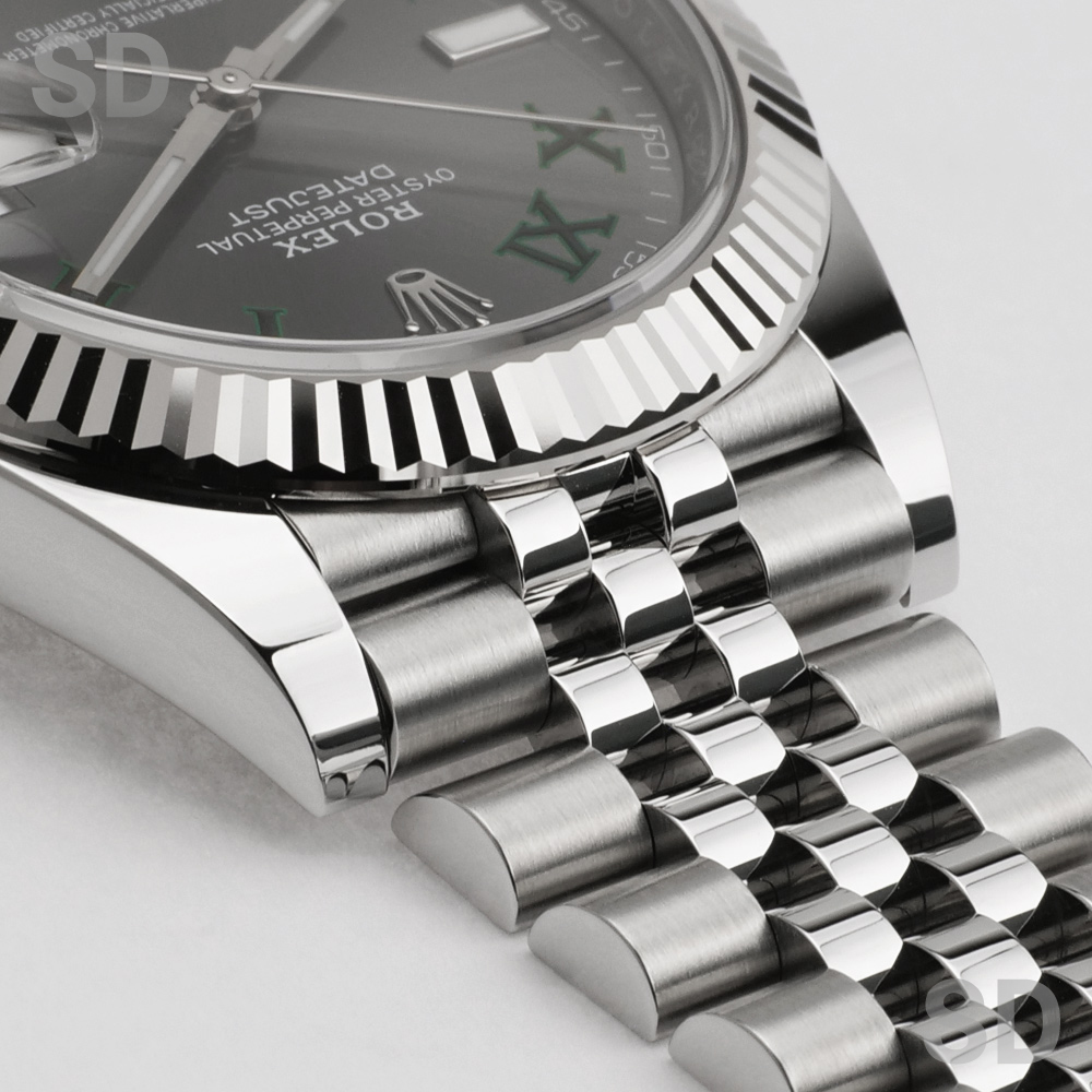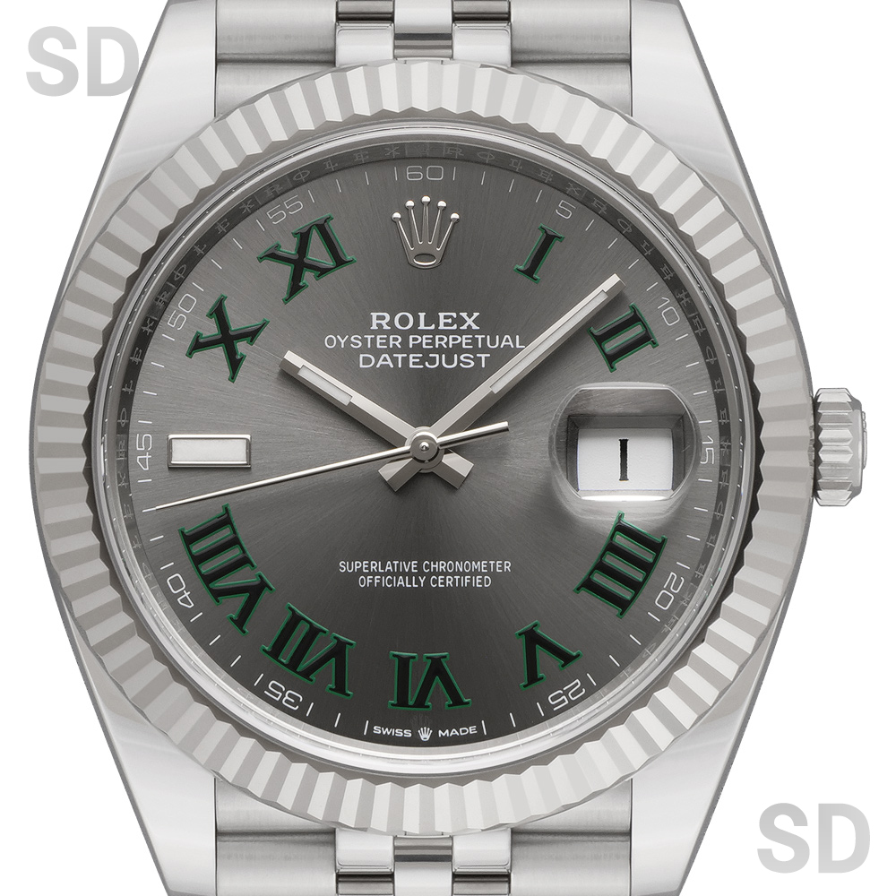 こちらの個体は濃いグレーカラーのスレート文字盤に、グリーンに縁取られたローマインデックスが特徴の、ウィンブルドン・ダイアルがセットされたモデル。ジュビリーブレスレットが装着されております。