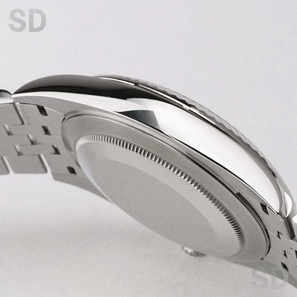 状態です。外装につきましては、ベゼルおよびケースサイドに、展示に伴うごく僅かな擦り傷や小傷が見受けられますが、いずれも極めて軽微なものでございます。研磨などによる傷取り処理を施す必要がないほど、全体として非常に美しいコンディションを維持しております。金属面の艶やエッジの立ち上がりも良好で、丁寧に扱われてきた個体であることがうかがえます。