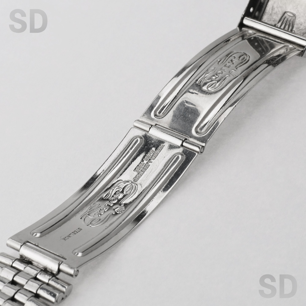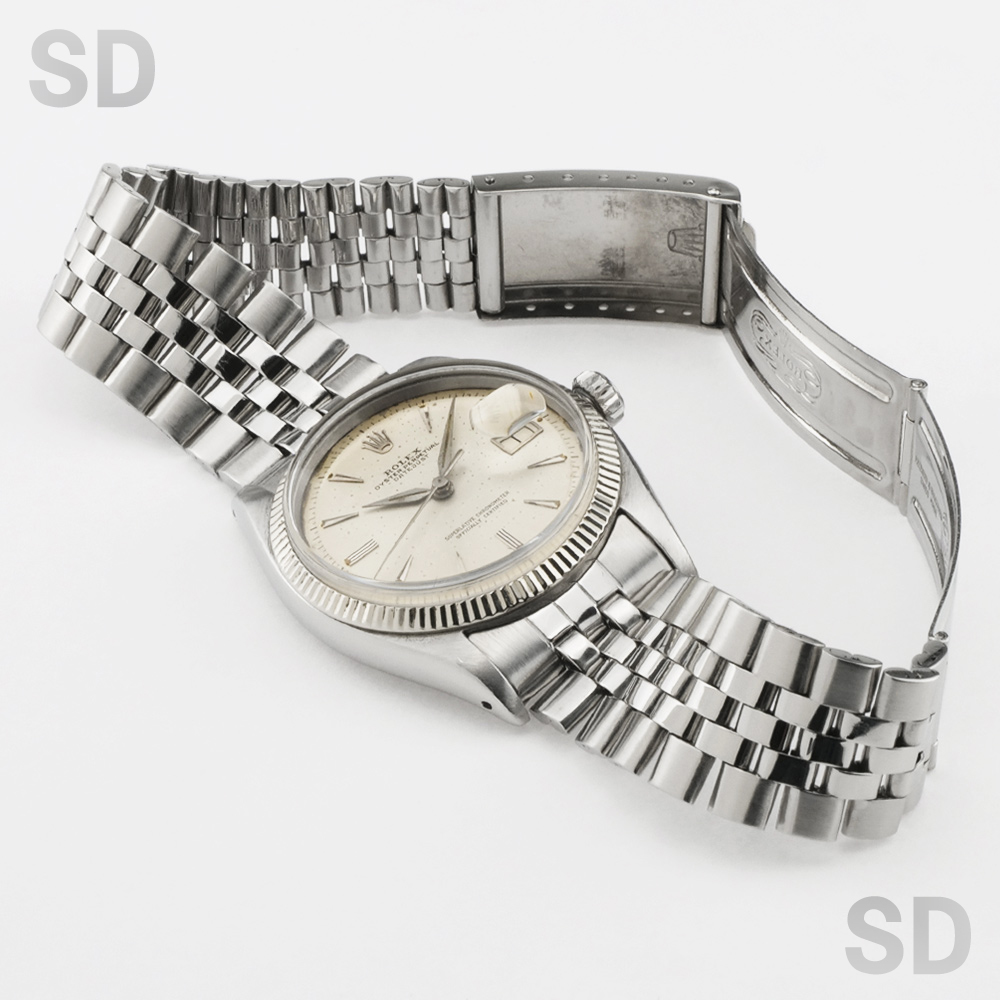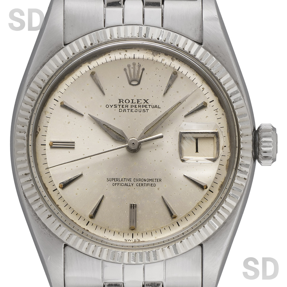 こちらはデイトジャスト第2世代とされるRef.1601の前身モデル。おおよそ1956年〜1959年の3年間程度しか製造されていない貴重なモデルです。当時特有となるクサビインデックスとアルファハンドに、細かな刻みのフルーテッドベゼル。ムーブメントはバタフライローターを搭載した自動巻きCal.1066というヴィンテージ感溢れる1本。Ref.6605の中でも最終に近しい個体な為、カレンダーディスクは黒黒表記となりますが、ヴィンテージテイストが詰まったマニアには堪らない1本です。