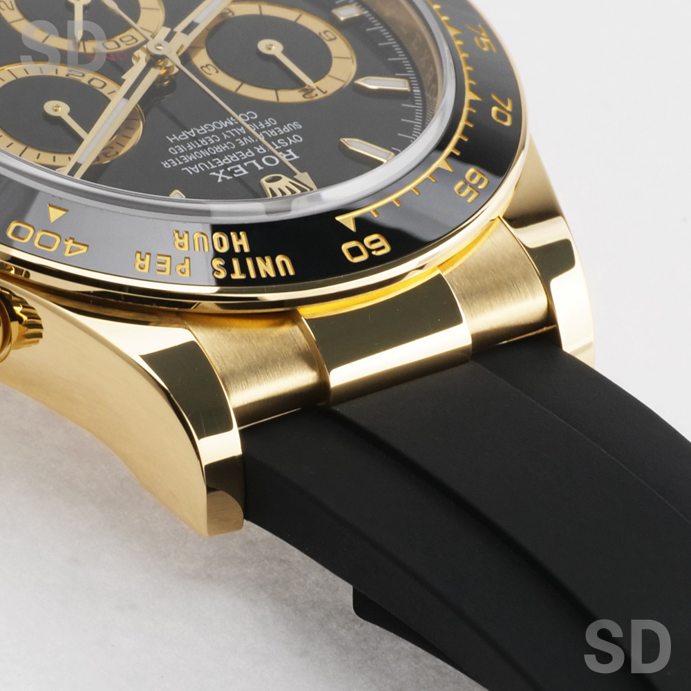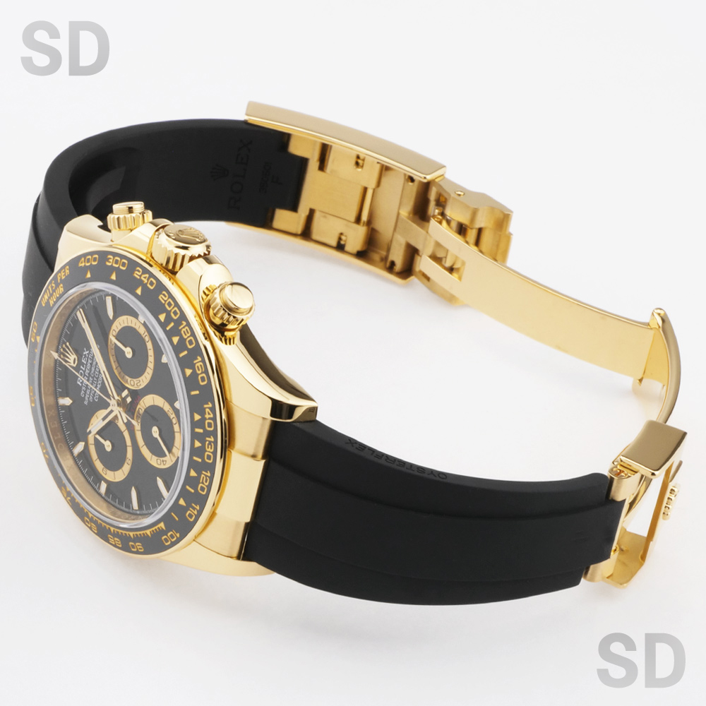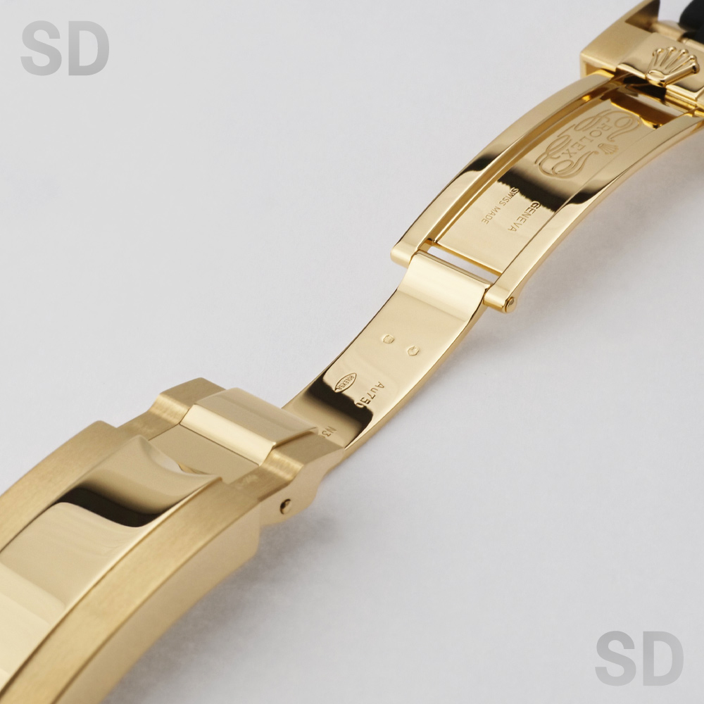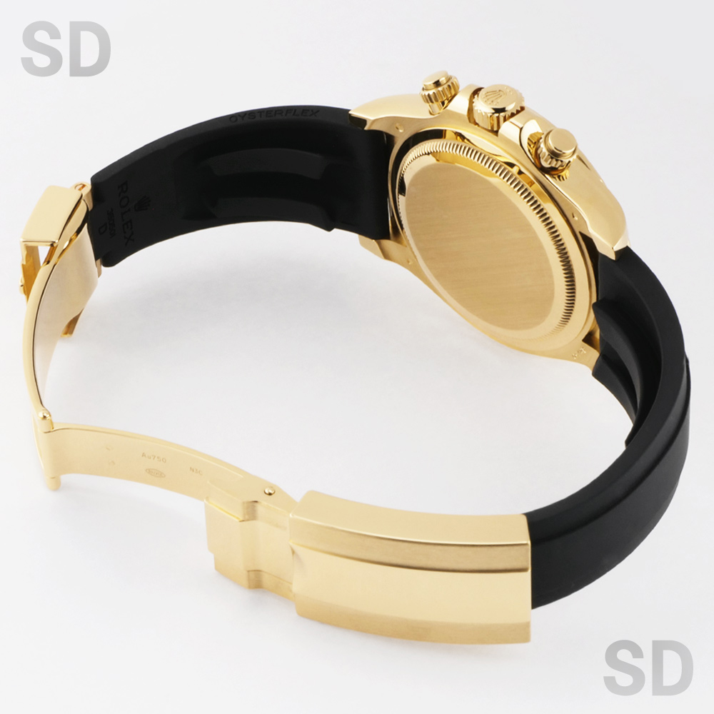 イエローゴールド製ケースとブラックセラクロムベゼルの組み合わせに加え、現代的で快適なオイスターフレックスブレスレットを備えた、極めて洗練されたスポーツクロノグラフです。ダイアルは新たに採用されたブラック、ゴールデンカウンターリングがセットされております。