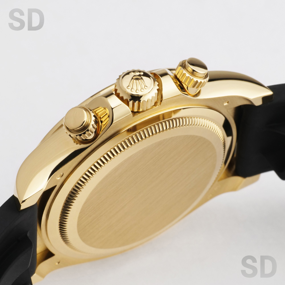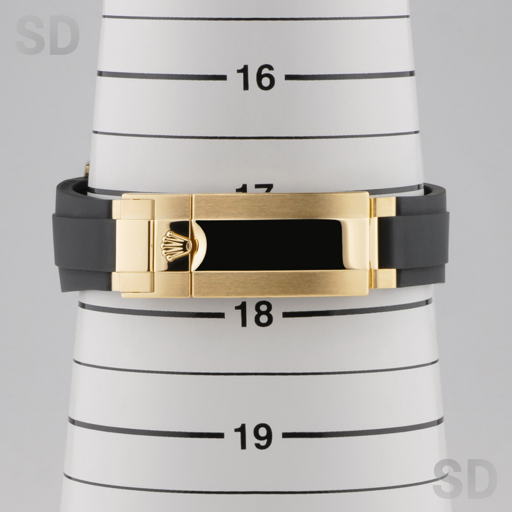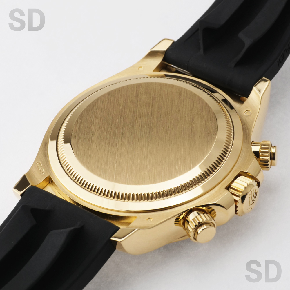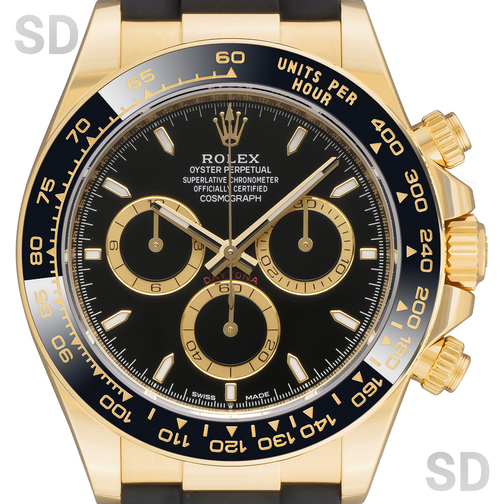 イエローゴールド製ケースとブラックセラクロムベゼルの組み合わせに加え、現代的で快適なオイスターフレックスブレスレットを備えた、極めて洗練されたスポーツクロノグラフです。ダイアルは新たに採用されたブラック、ゴールデンカウンターリングがセットされております。