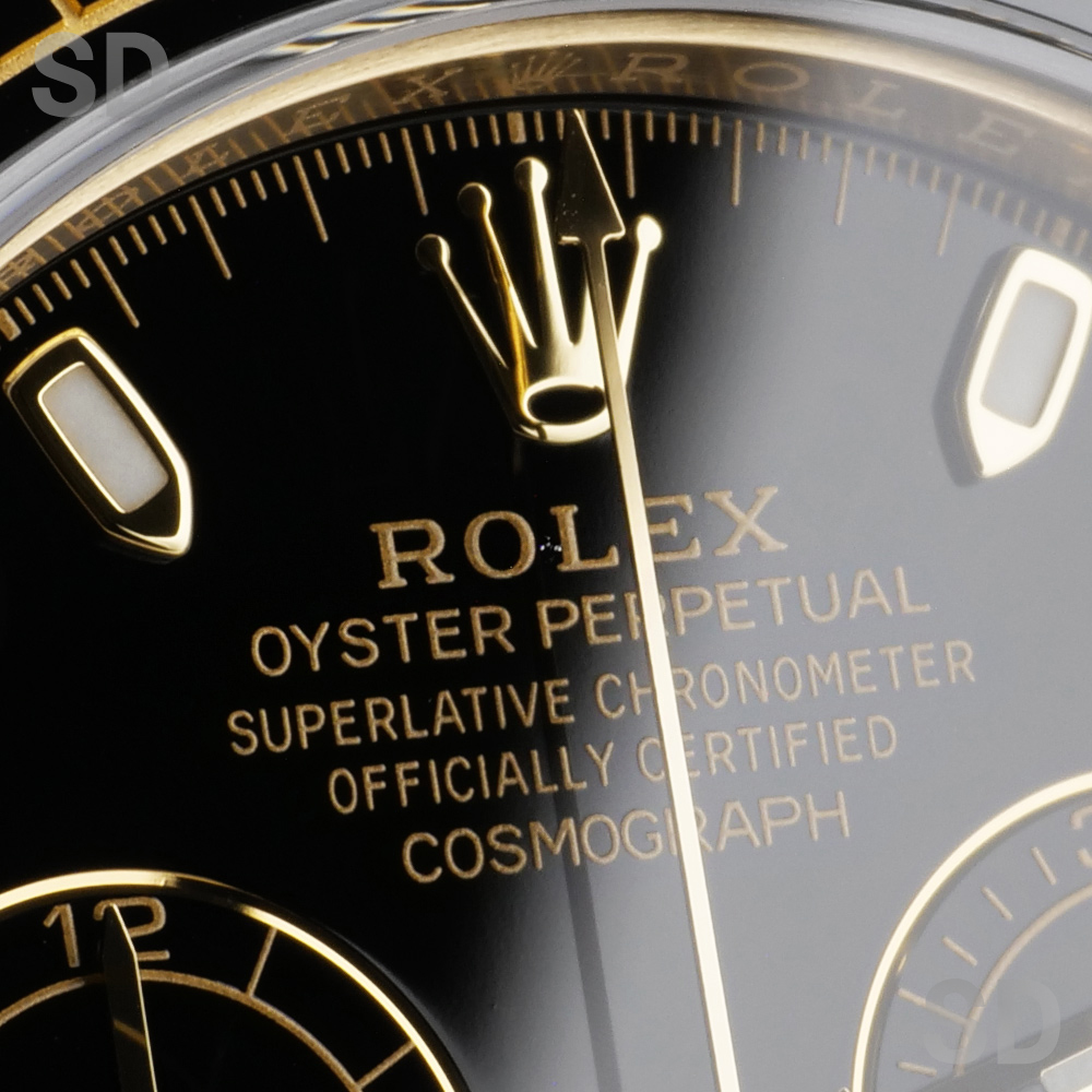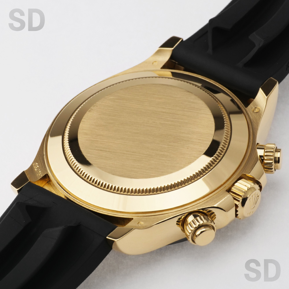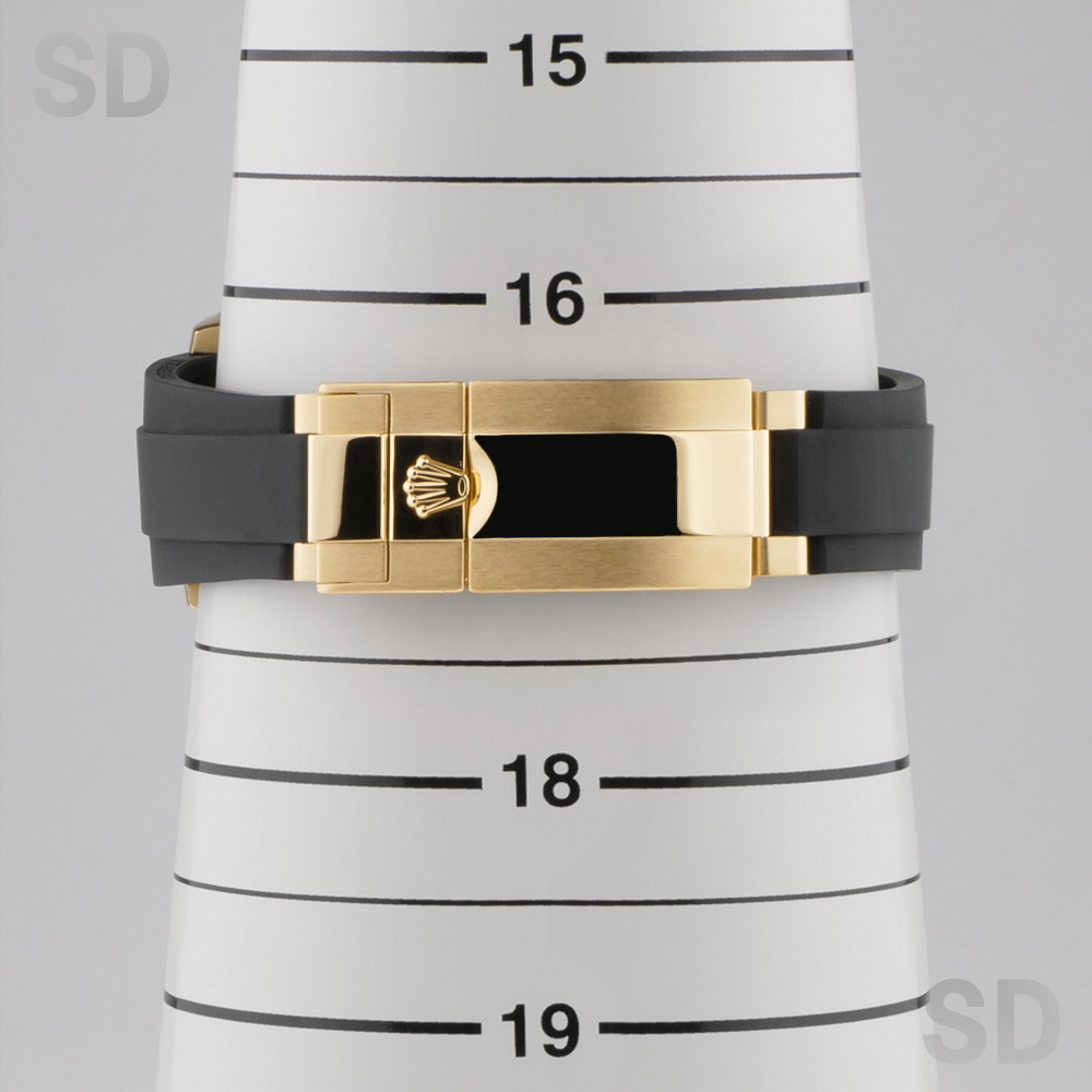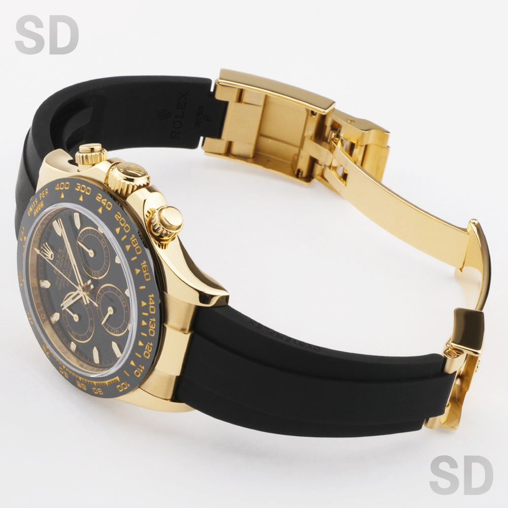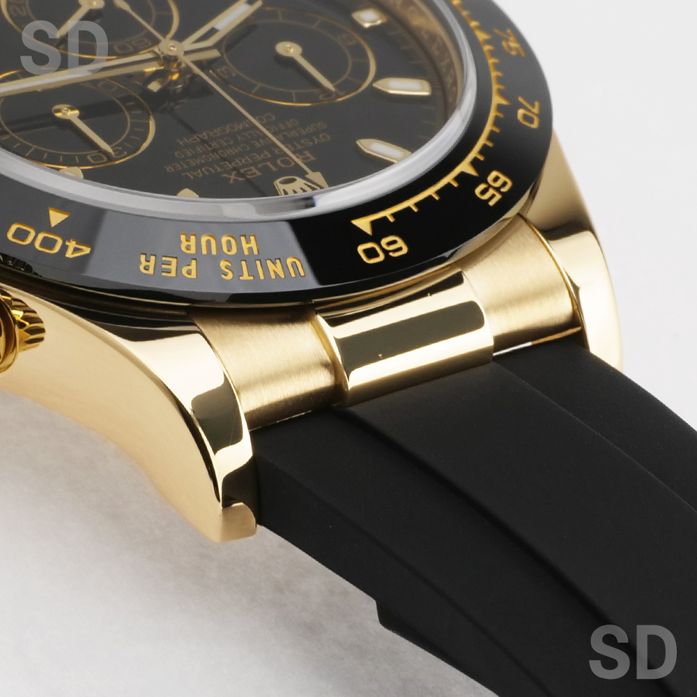 イエローゴールド製ケースとブラックセラクロムベゼルの組み合わせに加え、現代的で快適なオイスターフレックスブレスレットを備えた、極めて洗練されたスポーツクロノグラフです。ダイアルは人気の高いブラックがセットされております。