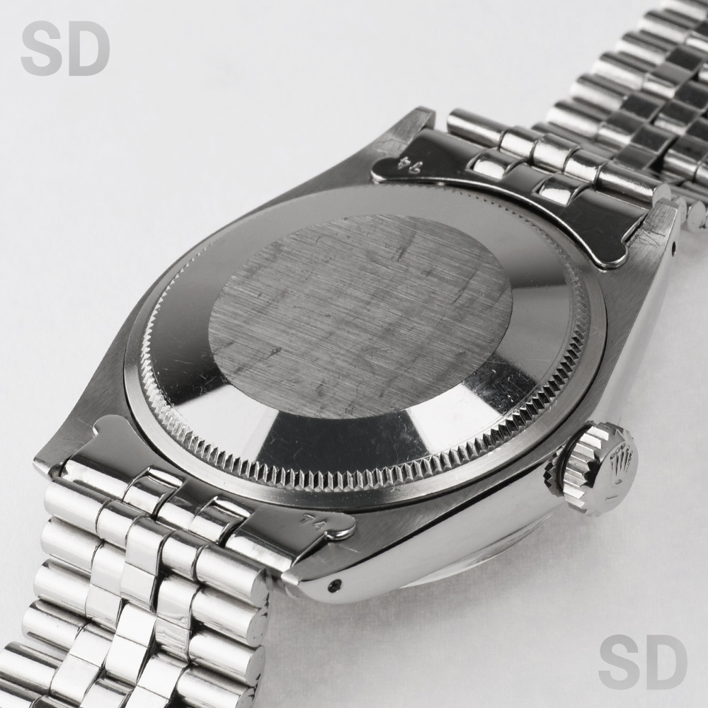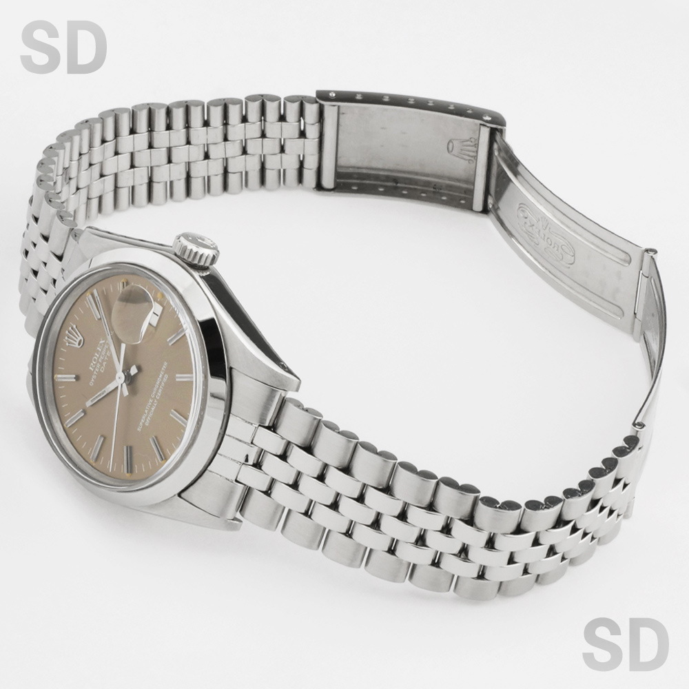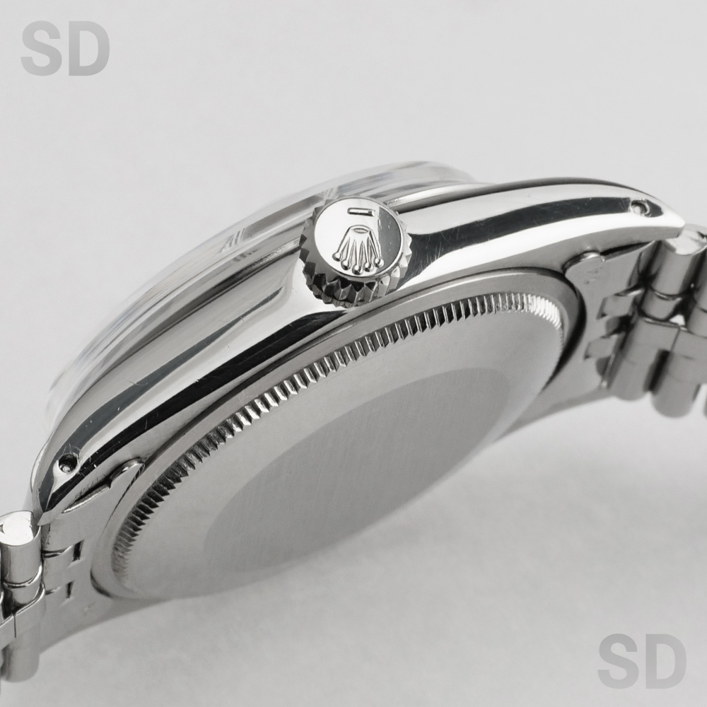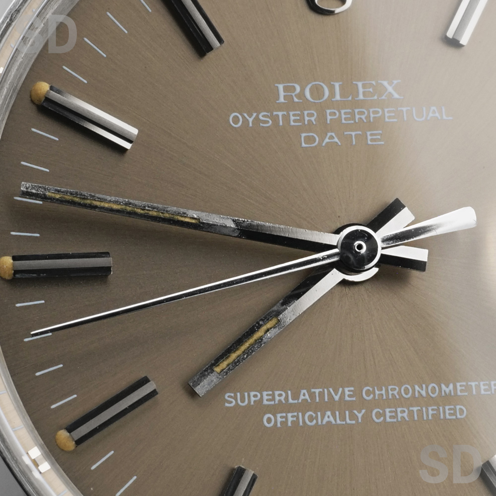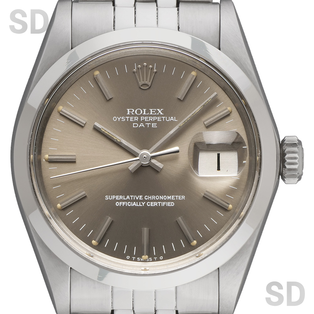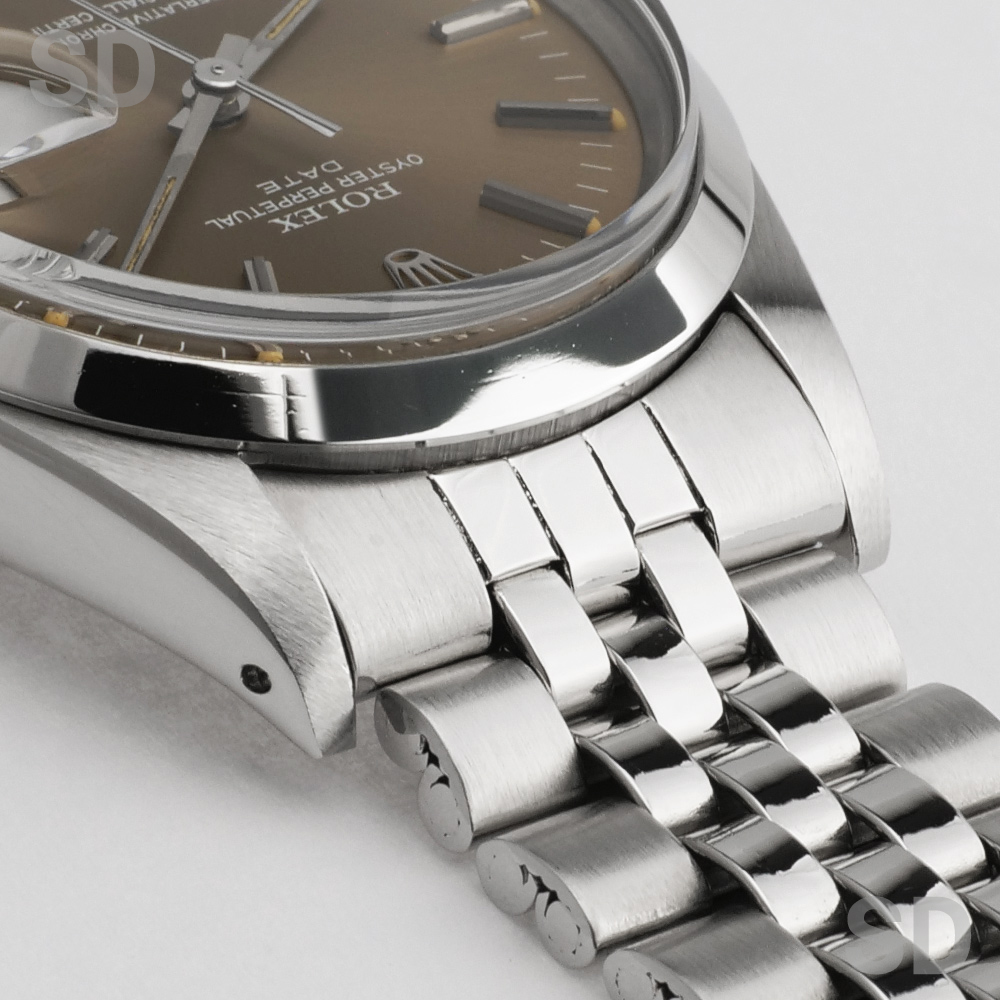 34mmの現代でいえば少々小振りサイズとなるパーペチュアルデイト。その分普段使いするには邪魔にならず、使い勝手は抜群です。こちらの個体は、グレーダイヤルが経年劣化によりブラウンのような色彩へカラーチェンジしています。このカラーチェンジしたダイヤルは、当初のグレーカラー独特の濁りが残る為、その色彩から”雨がよく降るイギリスの曇り空模様を連想させる”としてロレックスのヴィンテージマニアから「ロンドンスカイ」と呼ばれ評価されているダイヤルです。また、インデックスにゴールドを使用しているマーク「σ(シグマ)」ダイヤルでもあり、とても渋くよりヴィンテージ感が味わえるとして人気の1本。エイジング感も含め年代特有の雰囲気をご堪能いただけます。