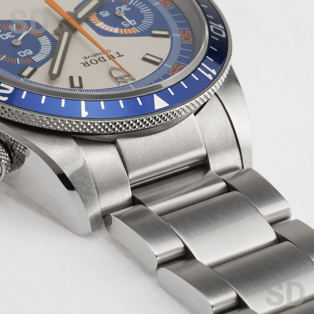 ヴィンテージテイストなデザインではあるものの、ケースは現在仕様として大きく厚みがあり、サファイヤクリスタルガラスに防水性能は150m。スーパールミノバを使用しスペックはアップデートされています。個性あるデザインが一昔前のチュードルらしいモデルです。