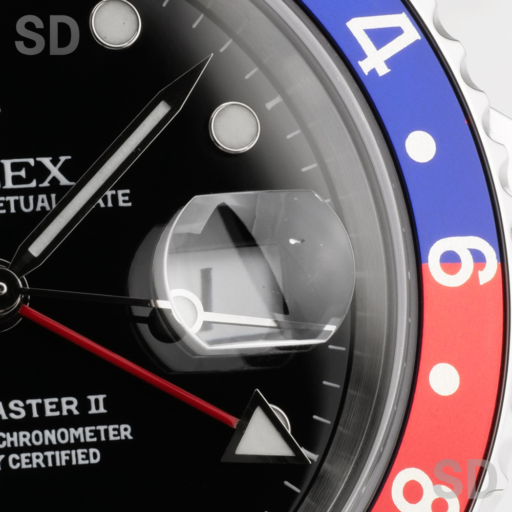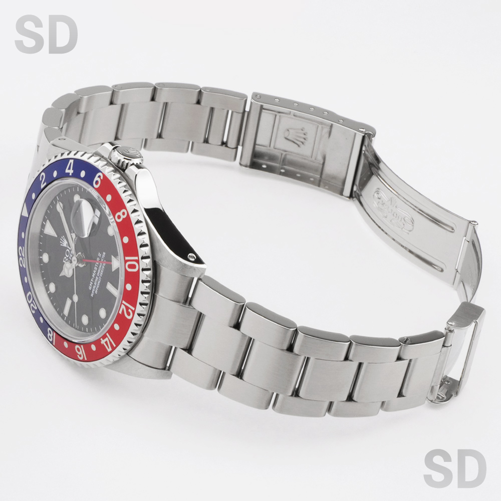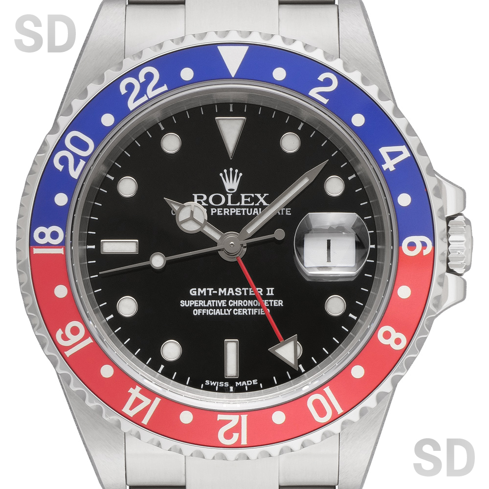 現行モデルから数え2世代前のGMTマスターIIシリーズ。赤と青のベゼルカラーによりファンからは「ペプシ」と呼ばれており、現在GMTマスターコレクションの中では一番人気の高いカラーリングとなっています。5桁モデル特有のケースのシャープさとブレスレットの軽さにより普段使いとしてもとても扱いやすく、末永く愛用出来る1本です。