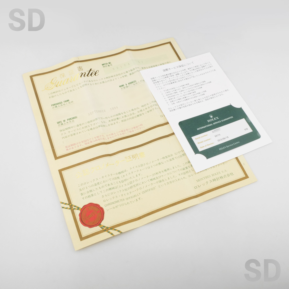 さらに、本品は2015年6月に日本ロレックスにてオーバーホールを含むメンテナンスを受けており、その際に発行されたサービス保証書も付属しております。これにより、過去の整備履歴が明確である点も、本個体の大きな魅力の一つでございます。また、付属している国内席保証書ですが、個人情報部分は消し込みを行っております。保証書としての価値に変わりありません。