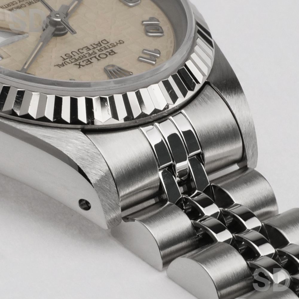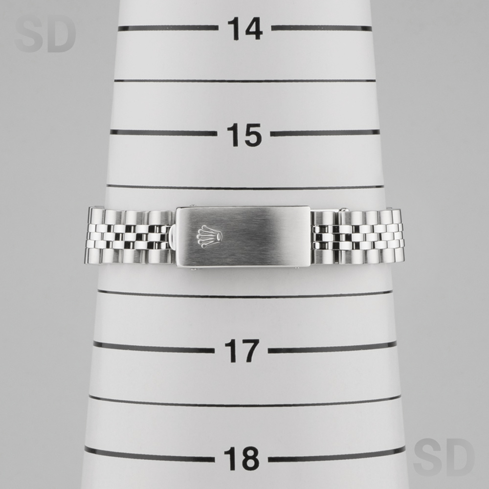 本個体には、希少性の高いアイボリー彫りコンピューターアラビアダイアルが採用されており、全体として上品でクラシカルな雰囲気を湛えております。ダイアルのデザイン性はもちろん、ブランド特有の立体感と視認性の高さが共存した、魅力あふれる個体でございます。