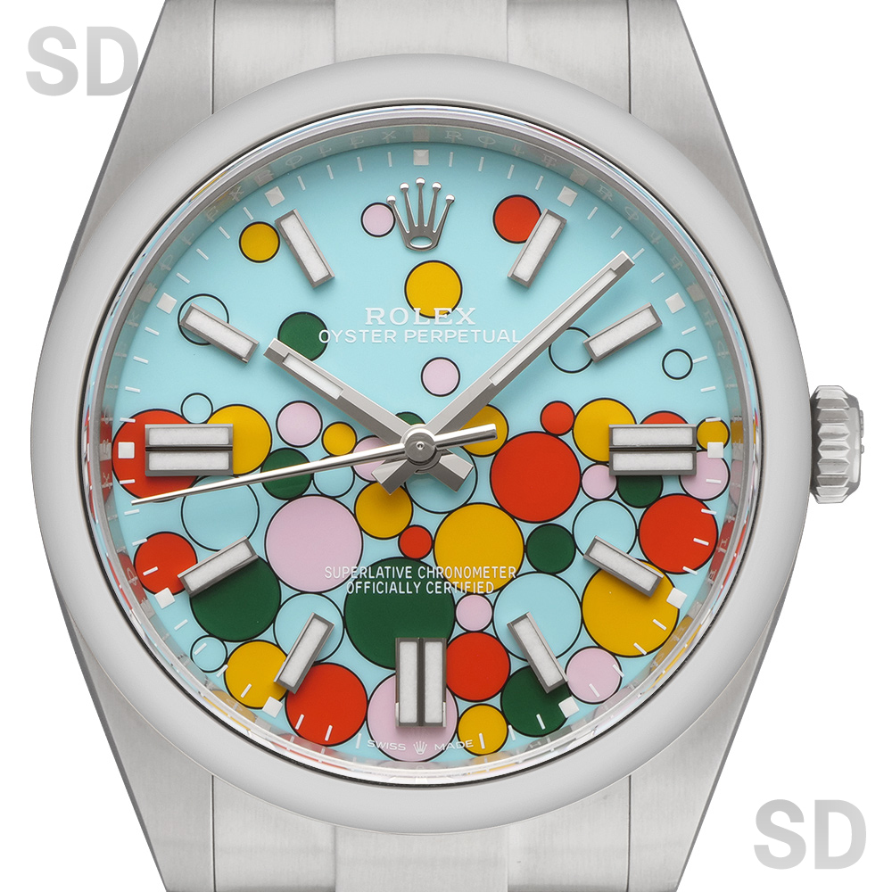 こちらはディスコンとなったセレブレーションモチーフダイアルです。ターコイズブルーを基調に、キャンディピンク、コーラルレッド、イエロー、グリーンの色彩が施された独創的なダイアルは、遊び心と高級感を兼ね備えた仕様でございます。