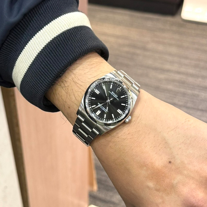31mmという大きすぎず小さすぎずの絶妙なサイズ感のデイトジャスト。当時は男女兼用サイズとされており、少し大きめの腕時計をお求めの女性や、腕が華奢と感じる男性へ是非オススメしたいモデル。スッキリとしたスムースベゼルとオイスターブレスレットのセットアップにより、スタイルを選ばずラフにお使いいただける1本。定番のブラックダイヤルが落ち着きある雰囲気を醸しだし、末永くお使い頂く上でも流行り廃りもなく飽きのこないモデルです。