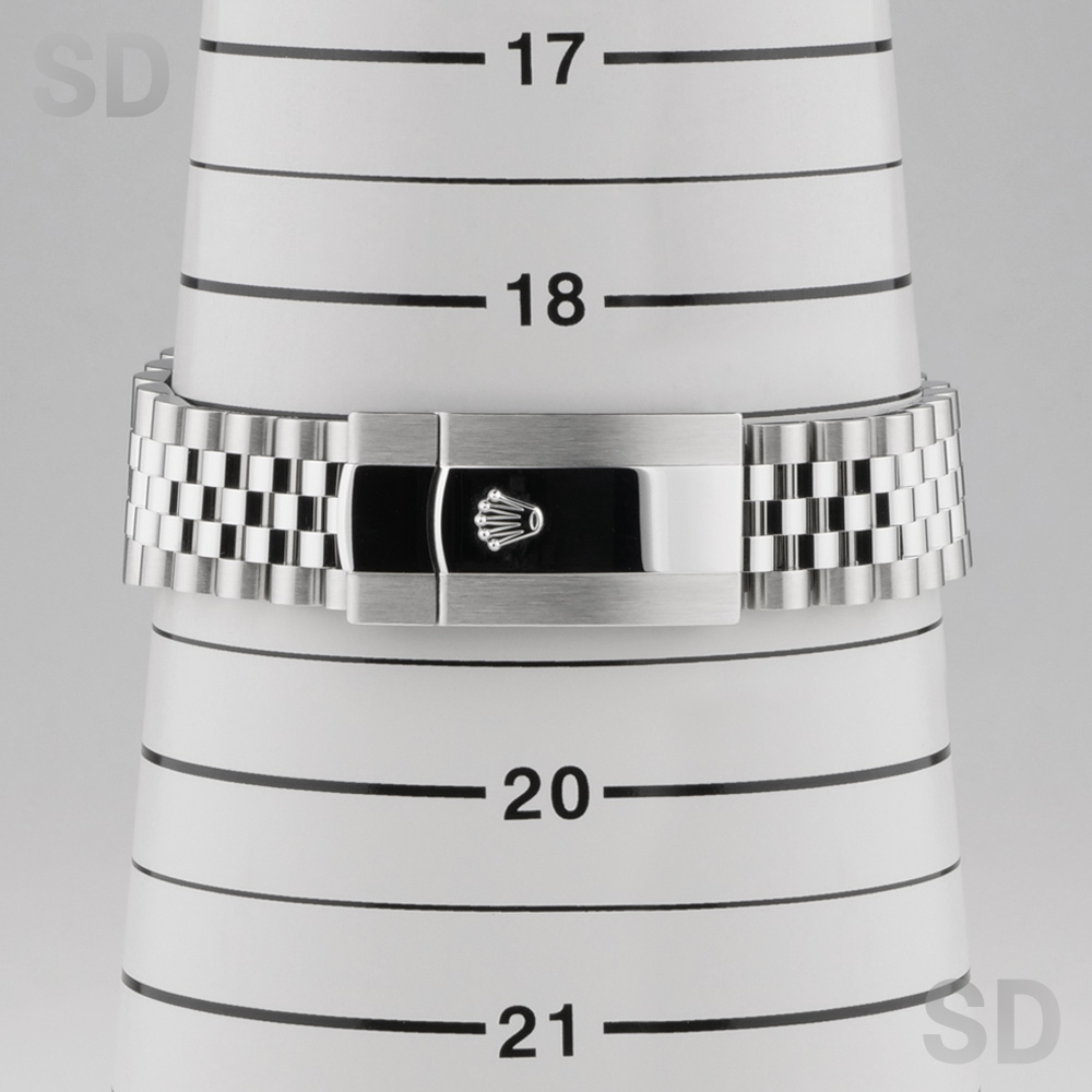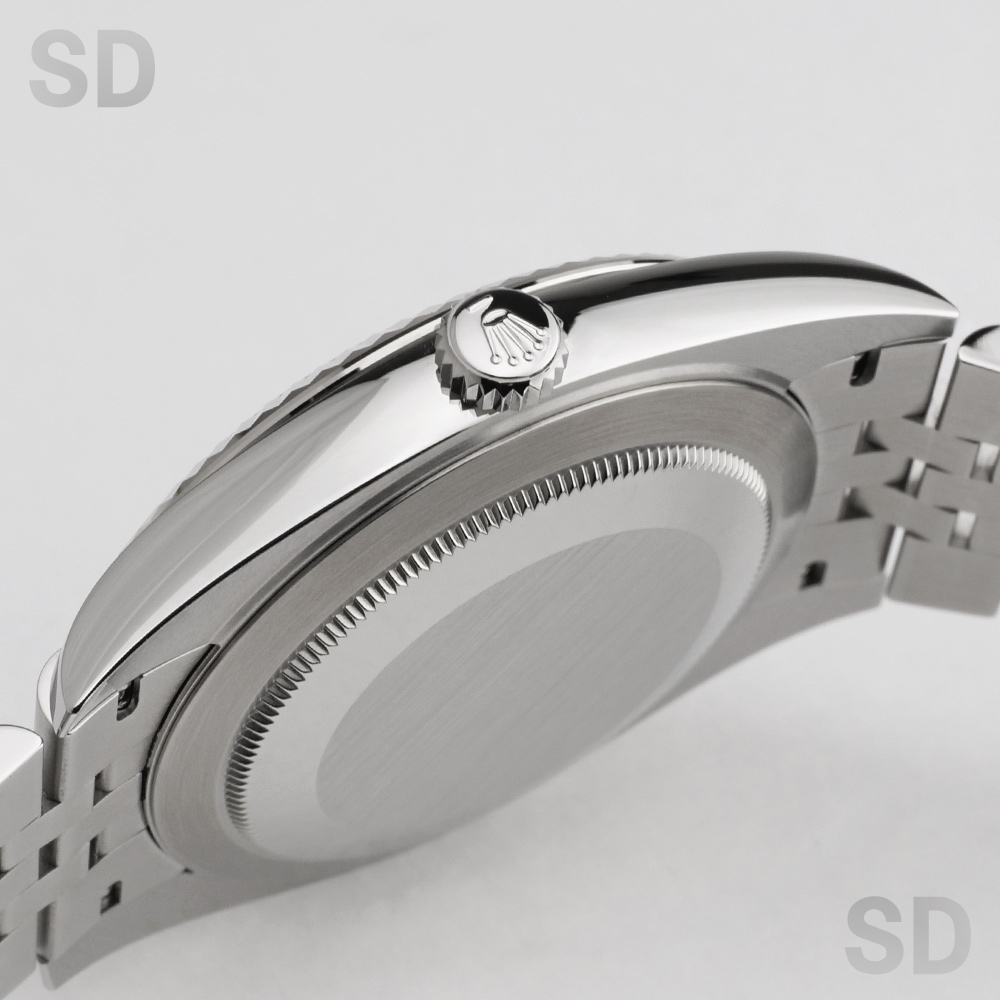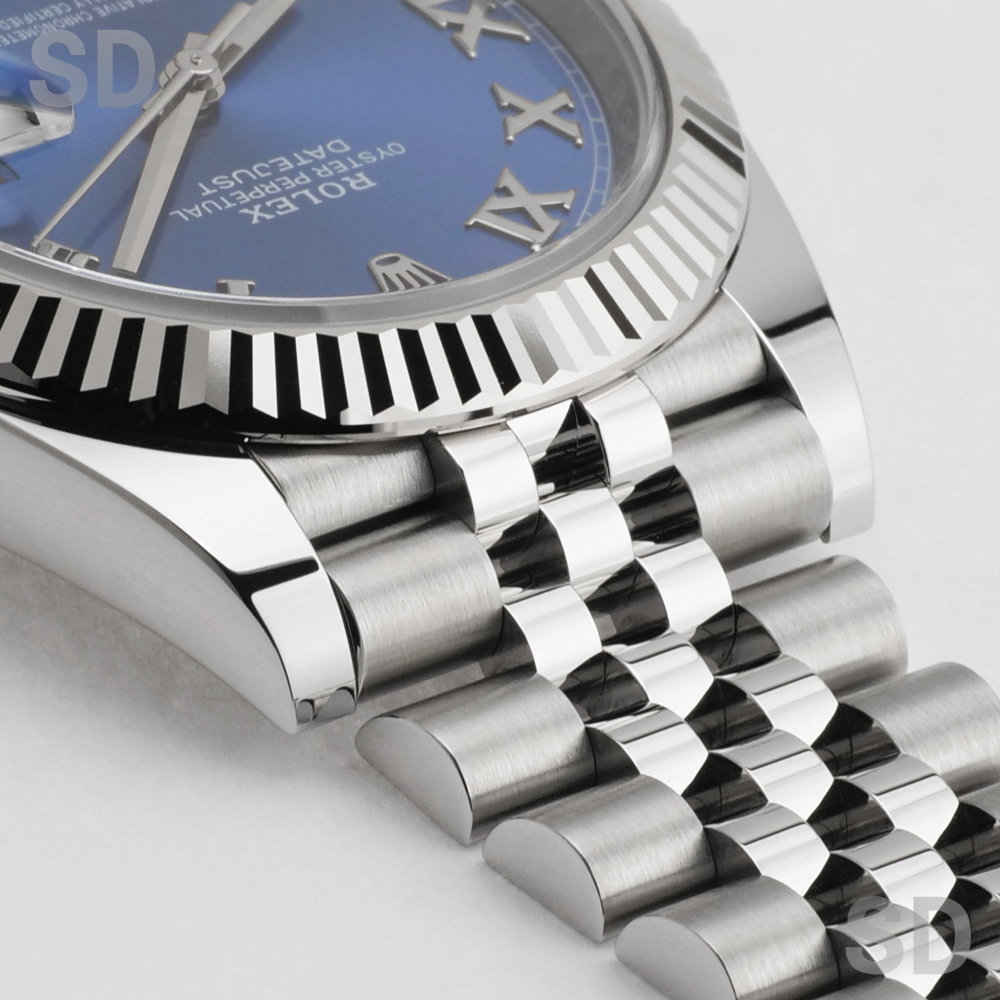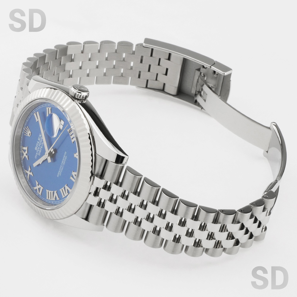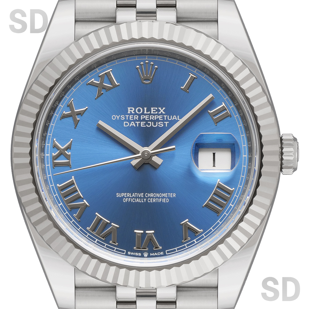 本モデルは、存在感のあるホワイトゴールド製フルーテッドベゼルとステンレススチールのコンビネーションが特徴で、ダイアルは上品で深みのあるアズーロブルーにローマンインデックスを組み合わせた仕様で、落ち着きと華やかさを兼ね備えた大変人気の高い一本でございます。
