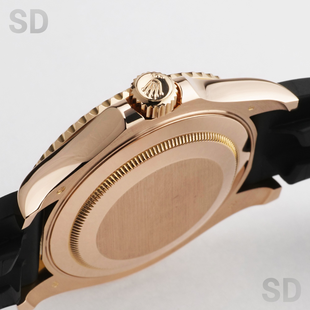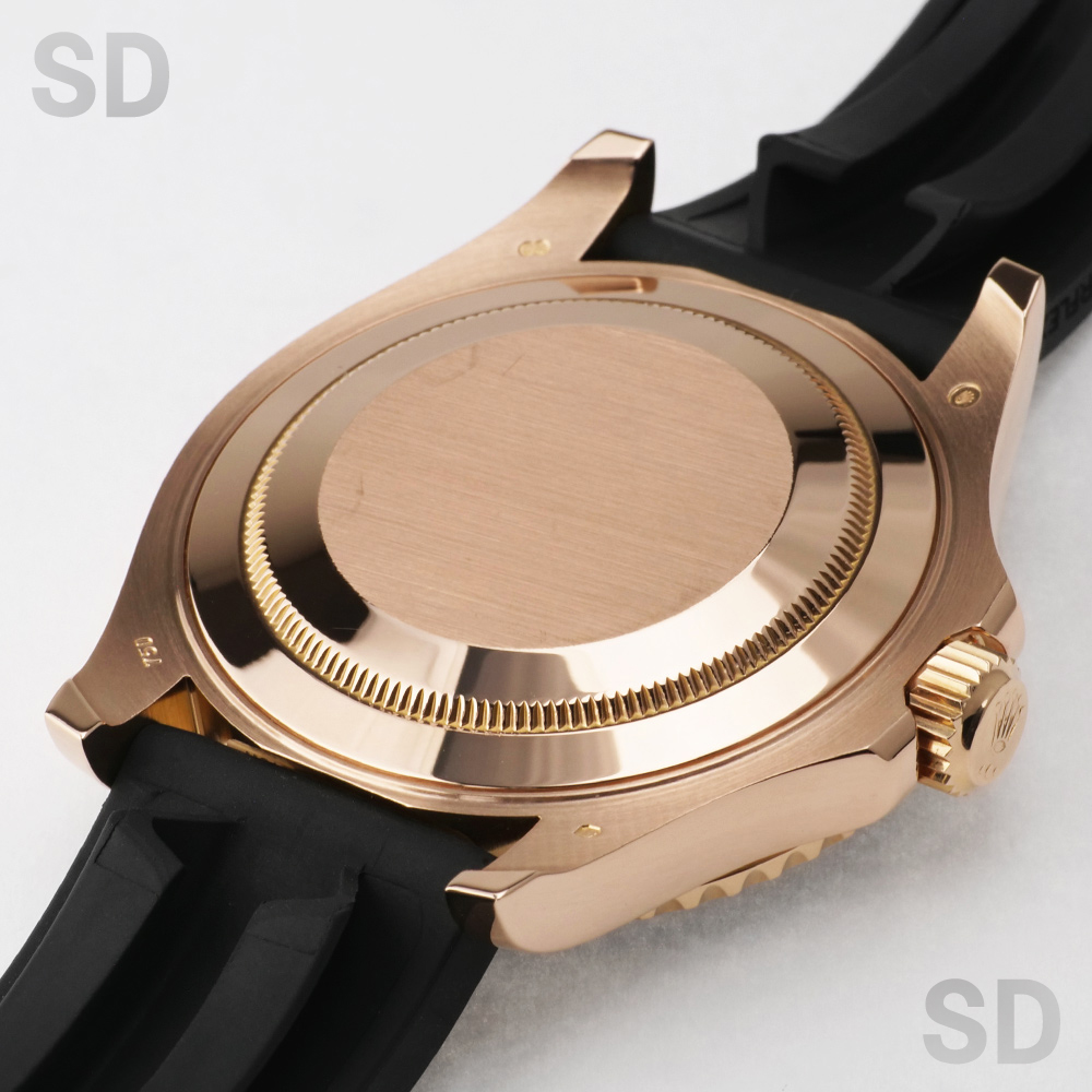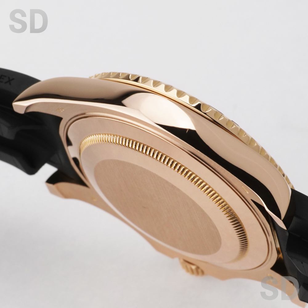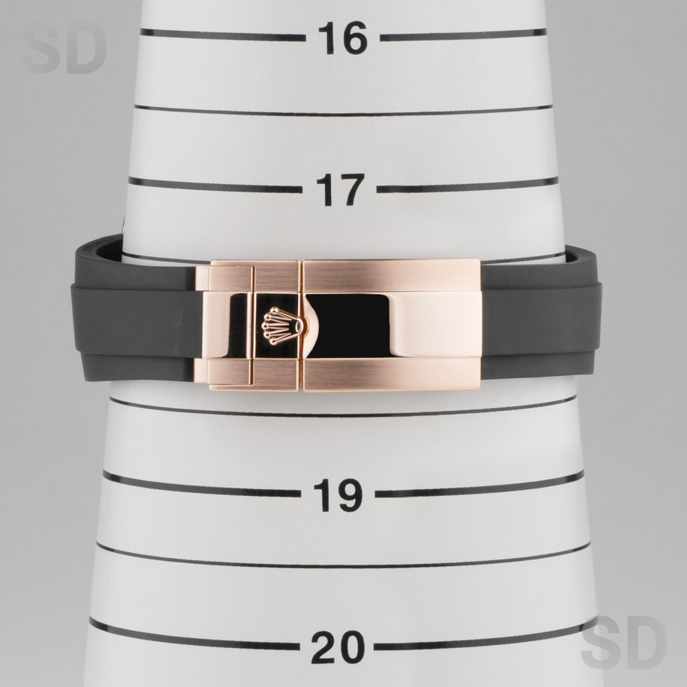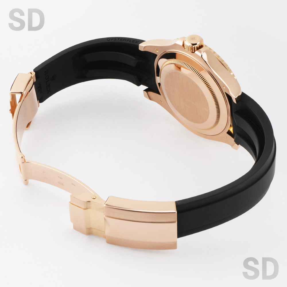 エバーローズゴールド特有の上品で深みのある輝きと、マットブラックのセラクロムベゼルが絶妙に調和した一本であり、ロレックス独自開発の高性能ラバーブレスレットであるオイスターフレックスを搭載することで、優れたフィット感とスポーティーな雰囲気を併せ持つ、極めて人気の高いモデルでございます。
