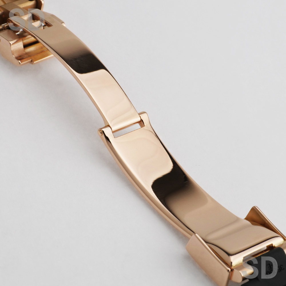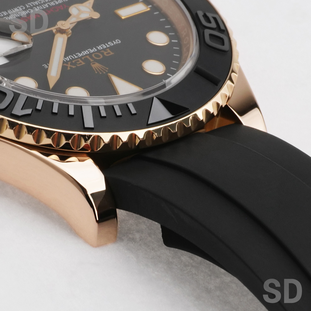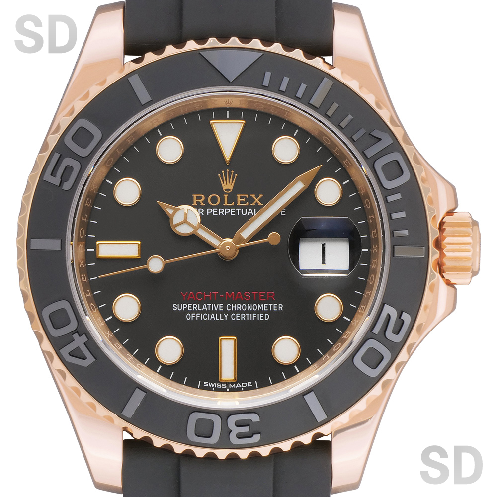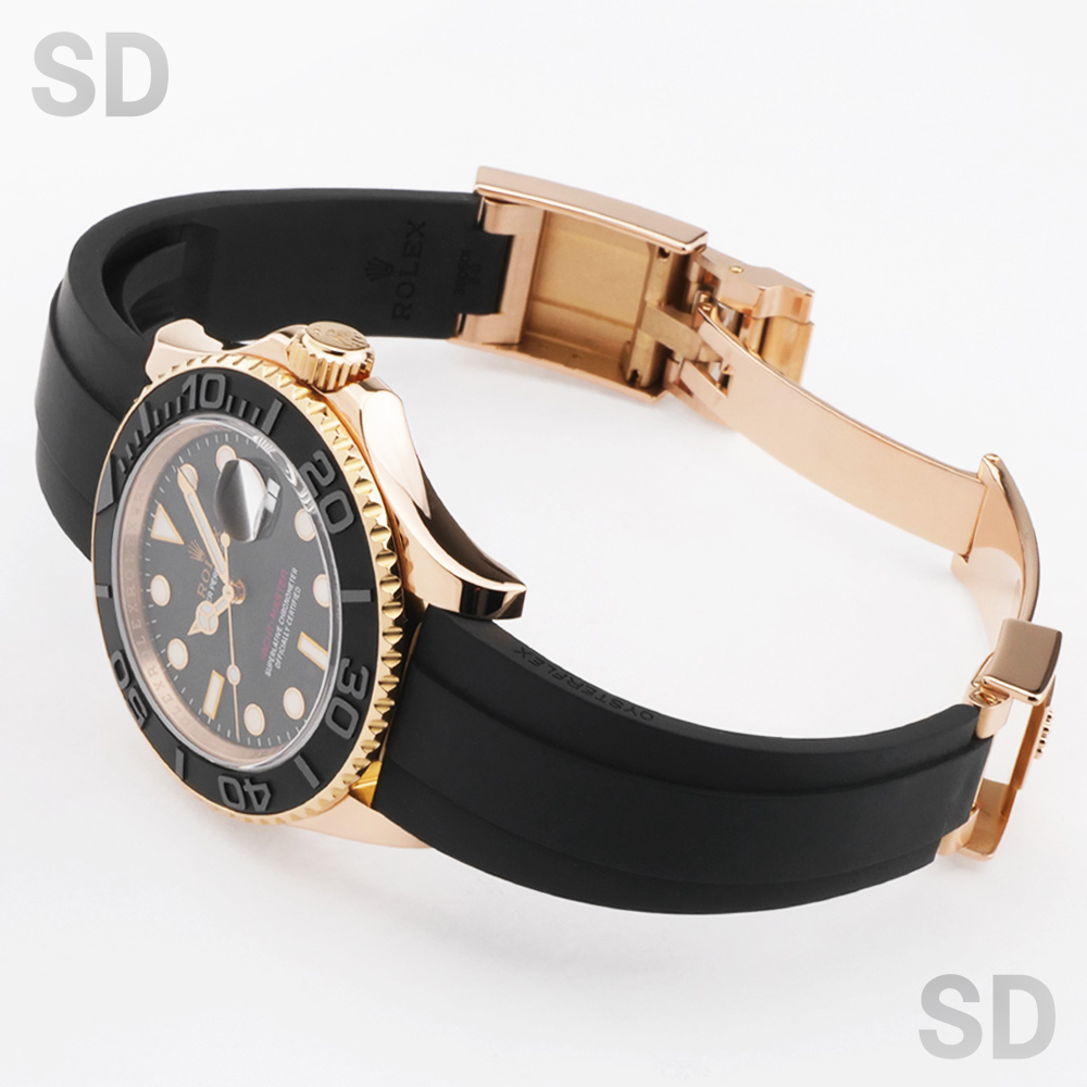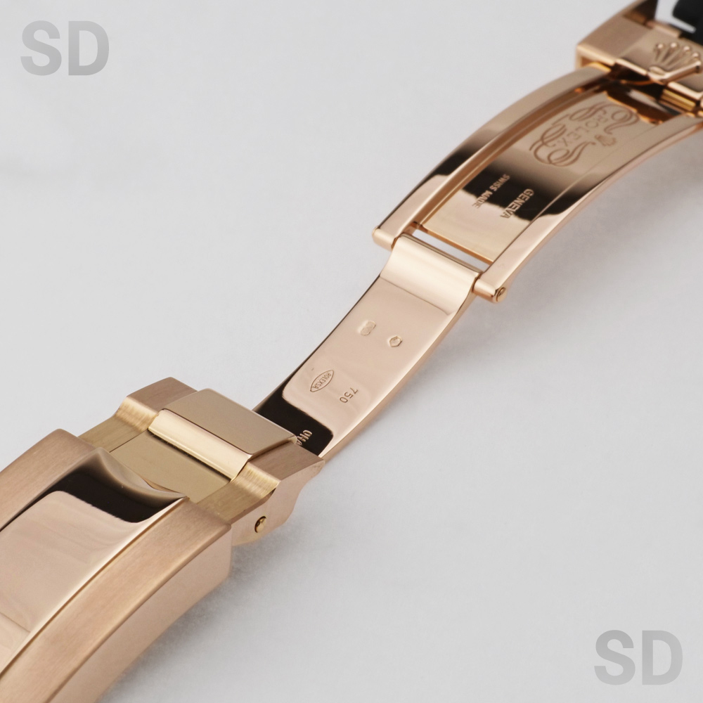エバーローズゴールド特有の上品で深みのある輝きと、マットブラックのセラクロムベゼルが絶妙に調和した一本であり、ロレックス独自開発の高性能ラバーブレスレットであるオイスターフレックスを搭載することで、優れたフィット感とスポーティーな雰囲気を併せ持つ、極めて人気の高いモデルでございます。