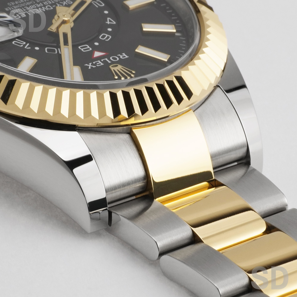 18Kイエローゴールドとオイスタースチールのコンビネーション(ロレゾール)が美しく調和した、洗練された佇まいが魅力の一本でございます。2023年に登場した最新リファレンスであり、ロレックス独自の年次カレンダー機構「サロス」と、双方向回転ベゼルを用いた操作システム「リングコマンド」を搭載。ビジネスシーンから旅先まで、あらゆる場面で信頼と機能性を発揮します。