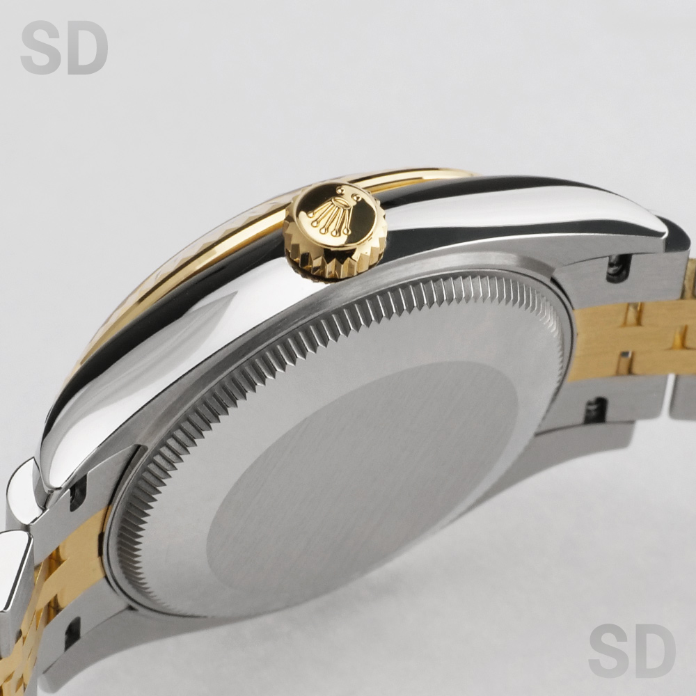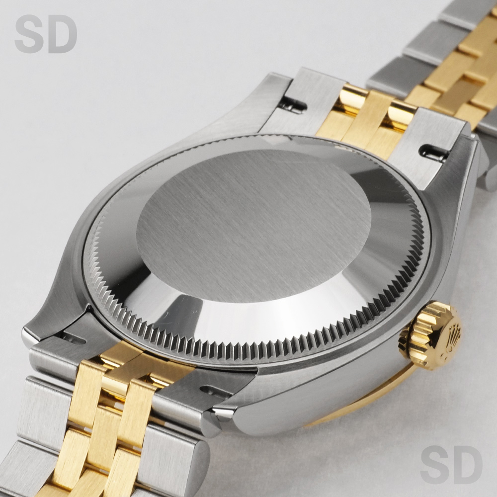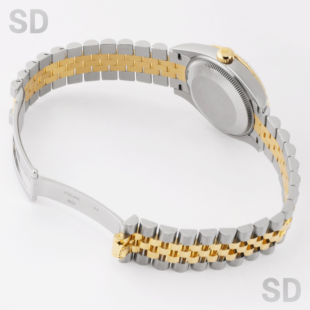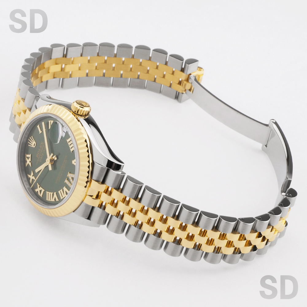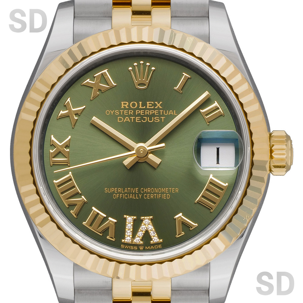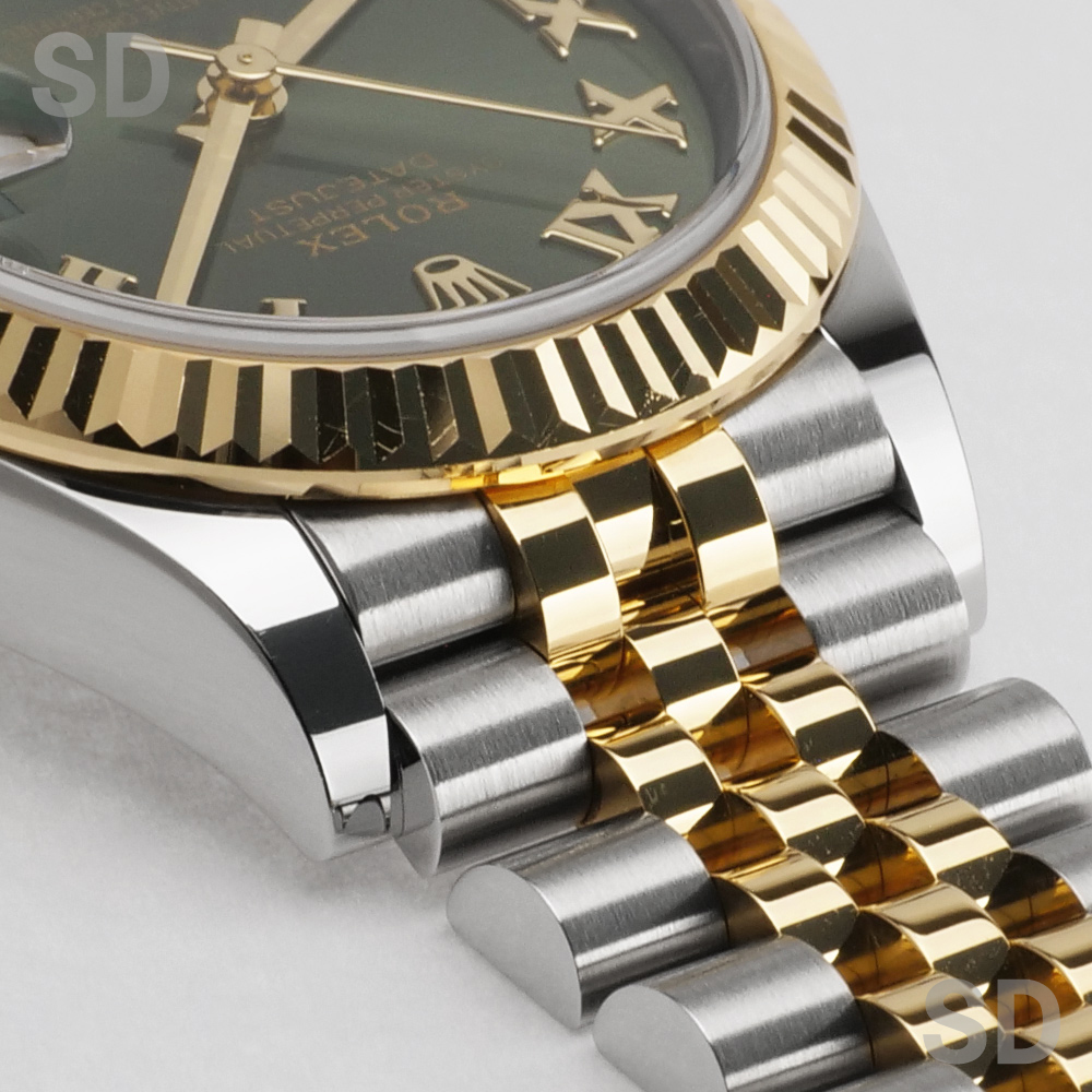 フルーテッドベゼルにジュビリーブレスレットを装備したこちらのモデルは、古くから愛されるデイトジャストを象徴するデザイン。こちらの個体にセットされている落ち着きあるオリーブグリーンの文字盤には、6時位置にローマ数字の「VI」を模ったダイヤモンドがセッティングされています。さり気なく輝き、腕元を華やかに彩るアクセサリーとしても最高のモデル。ファッションの一部としても着用出来、上品で美しい1本です。