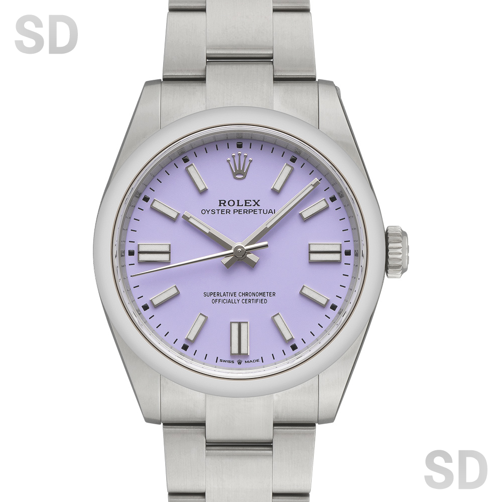 本モデルはホワイトゴールド製のフルーテッドベゼルに、バックル部分が目立たないコンシールドクラスプのジュビリーブレスレットを備えた仕様になっており、文字盤にはホワイトマザーオブパールをベースに、ローマ数字のインデックスがセットされております。シェルの模様は薄っすら波状に入っており、光の当たり方や光量によっては極僅かにグリーンやピンクの色味を見えます。