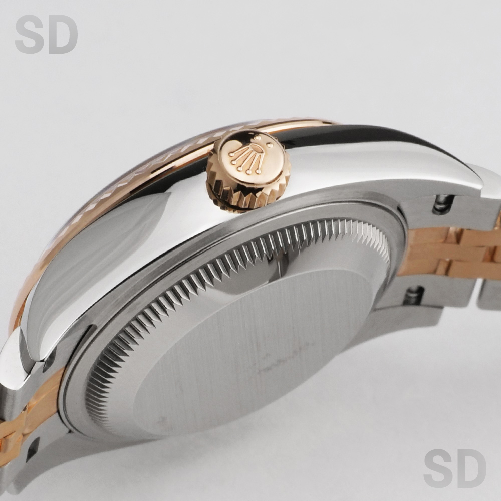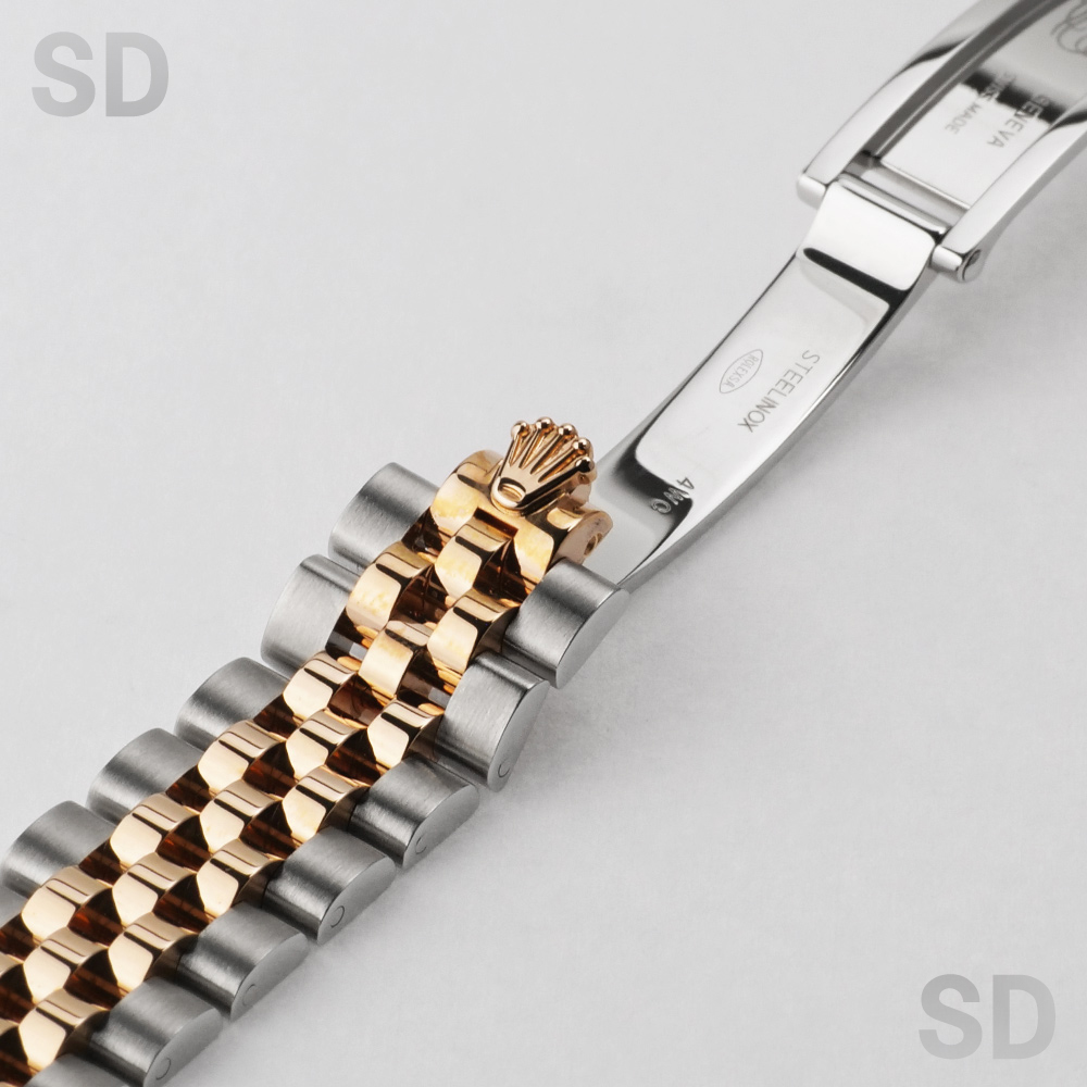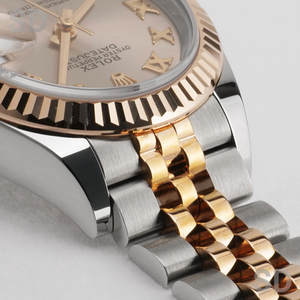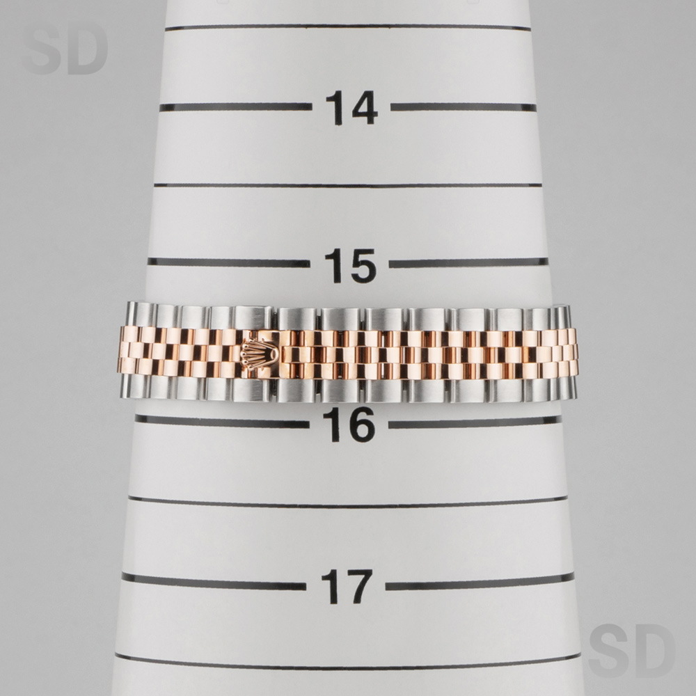 本モデルはステンレススチールとエバーローズゴールドを組み合わせたロレゾール(コンビ)仕様で、ブランドを象徴するフルーテッドベゼルに、しなやかな装着感とエレガントなデザインが特徴のジュビリーブレスレットが装着。文字盤には繊細な輝きを放つサンダストローマを採用しております。