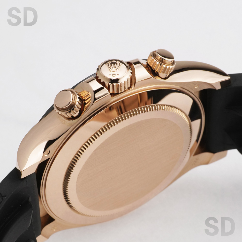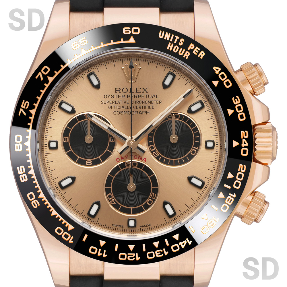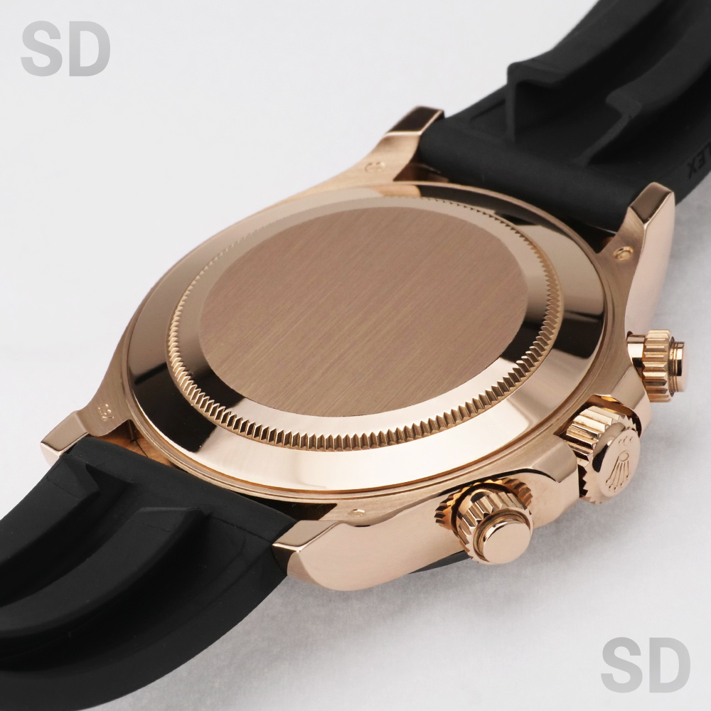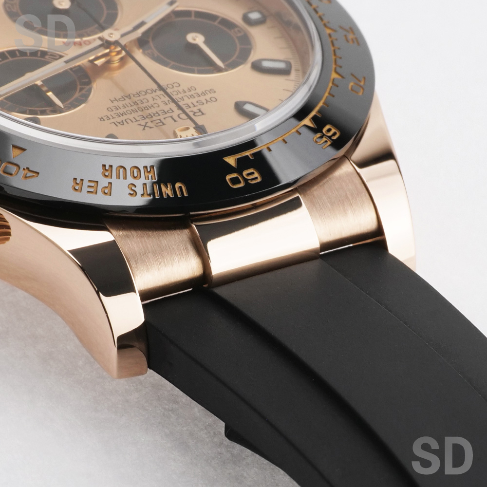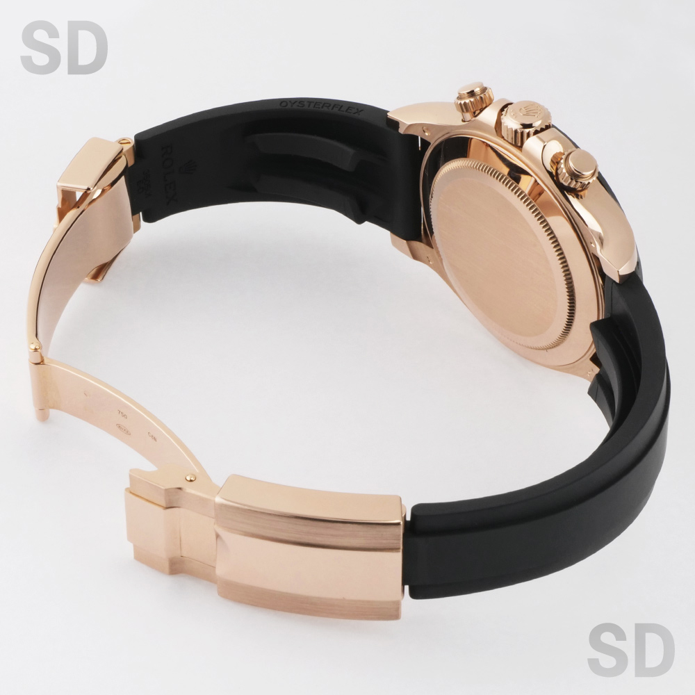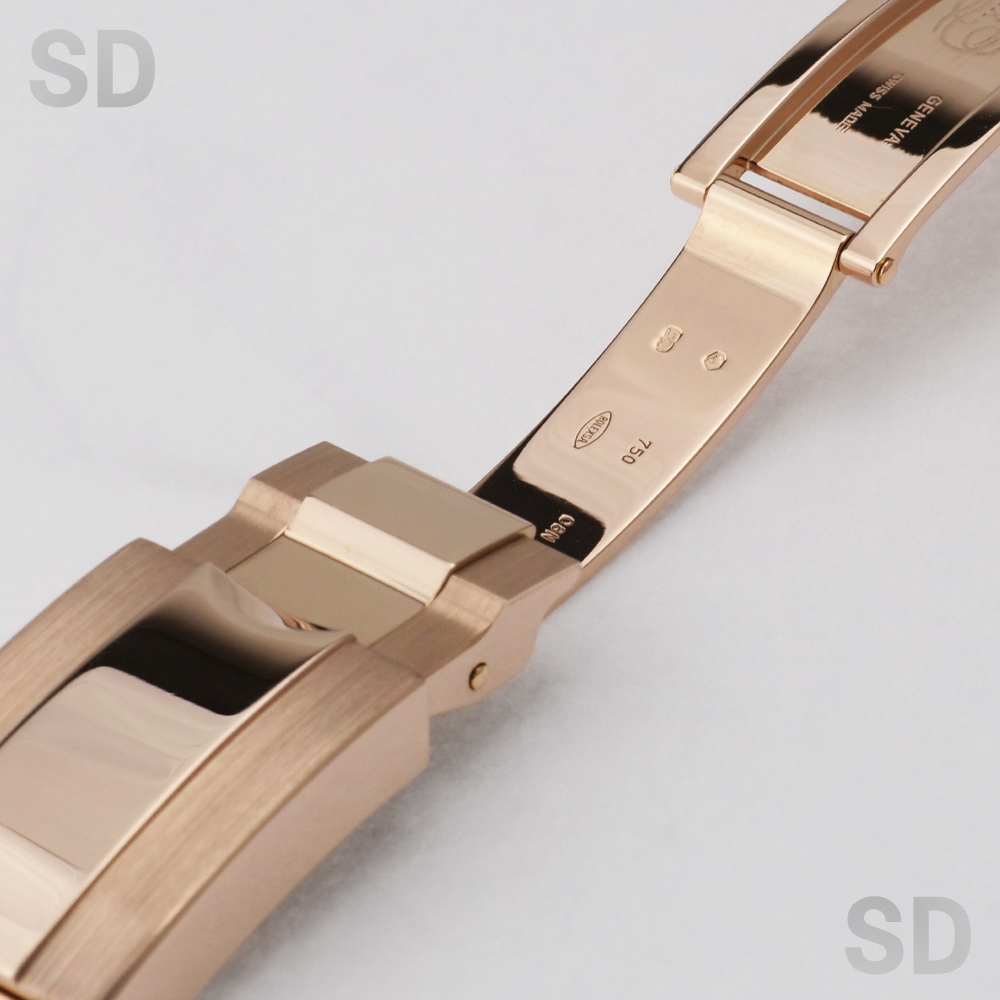 エバーローズゴールド(ピンクゴールド)製ケースとブラックセラクロムベゼルの組み合わせに加え、現代的で快適なオイスターフレックスブレスレットを備えた、極めて洗練されたスポーツクロノグラフです。ダイアルはシックなピンク/ブラックダイアルを備え、スポーティーでありながらも落ち着いた印象を与える、極めてバランスの取れた一本となっております。