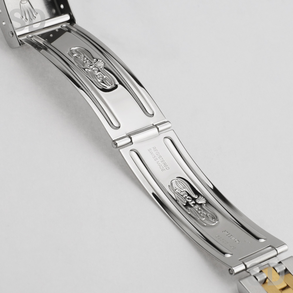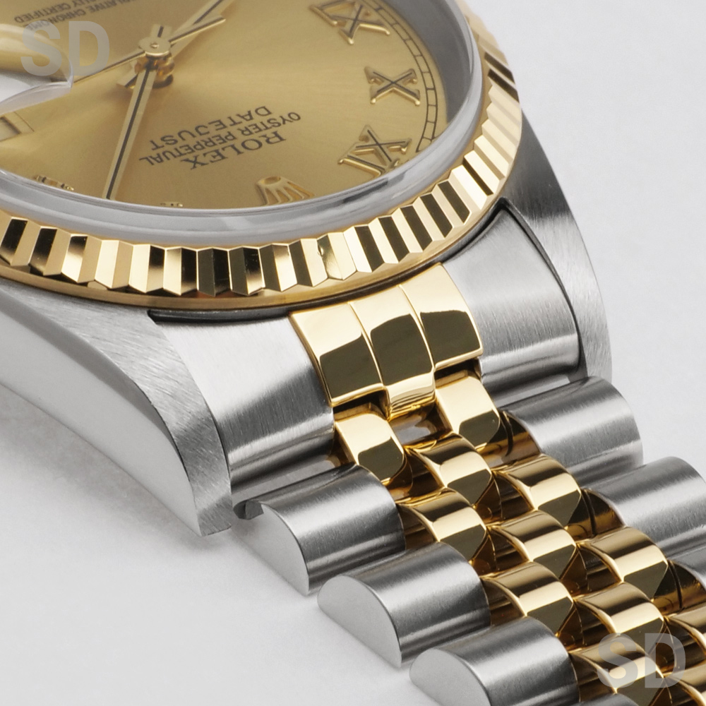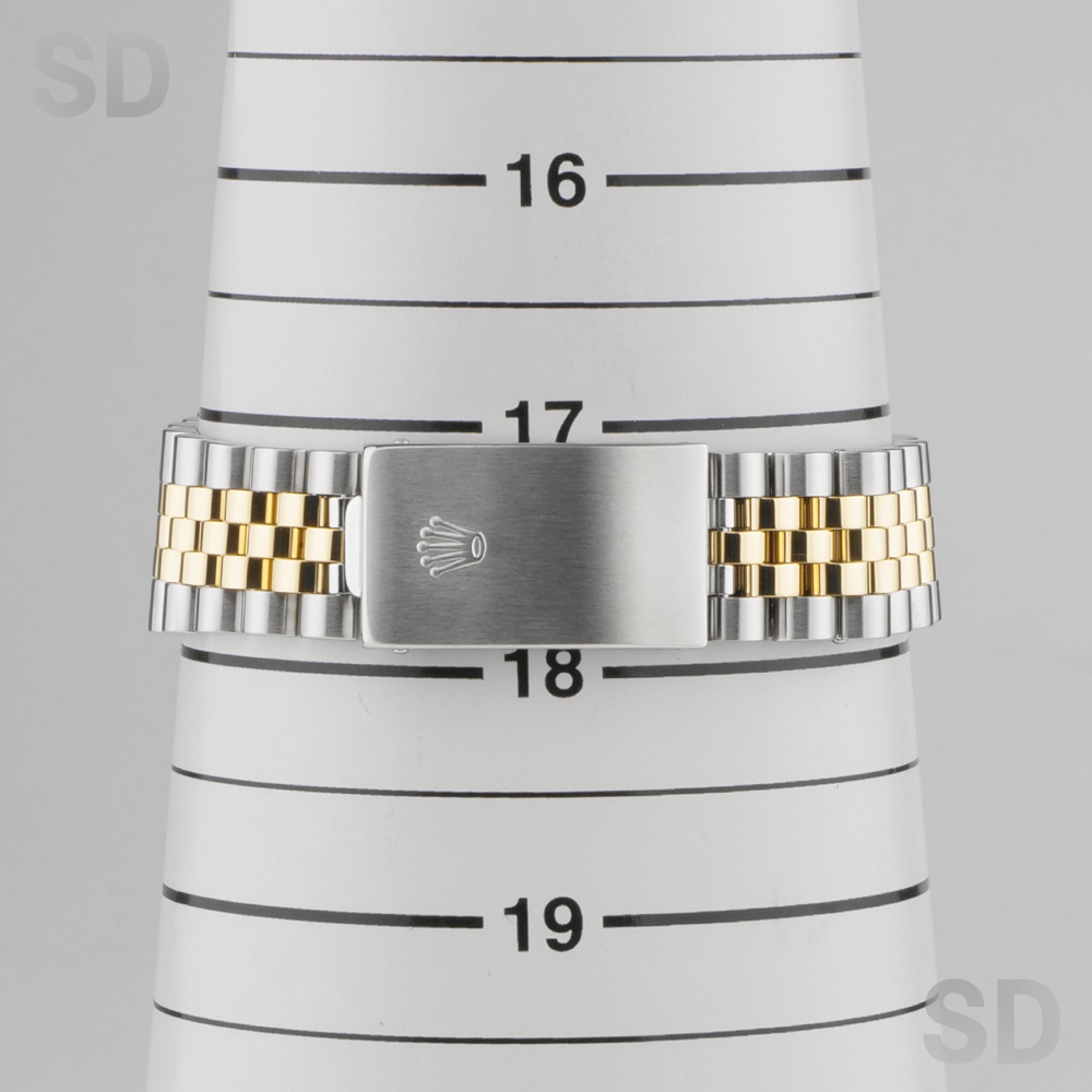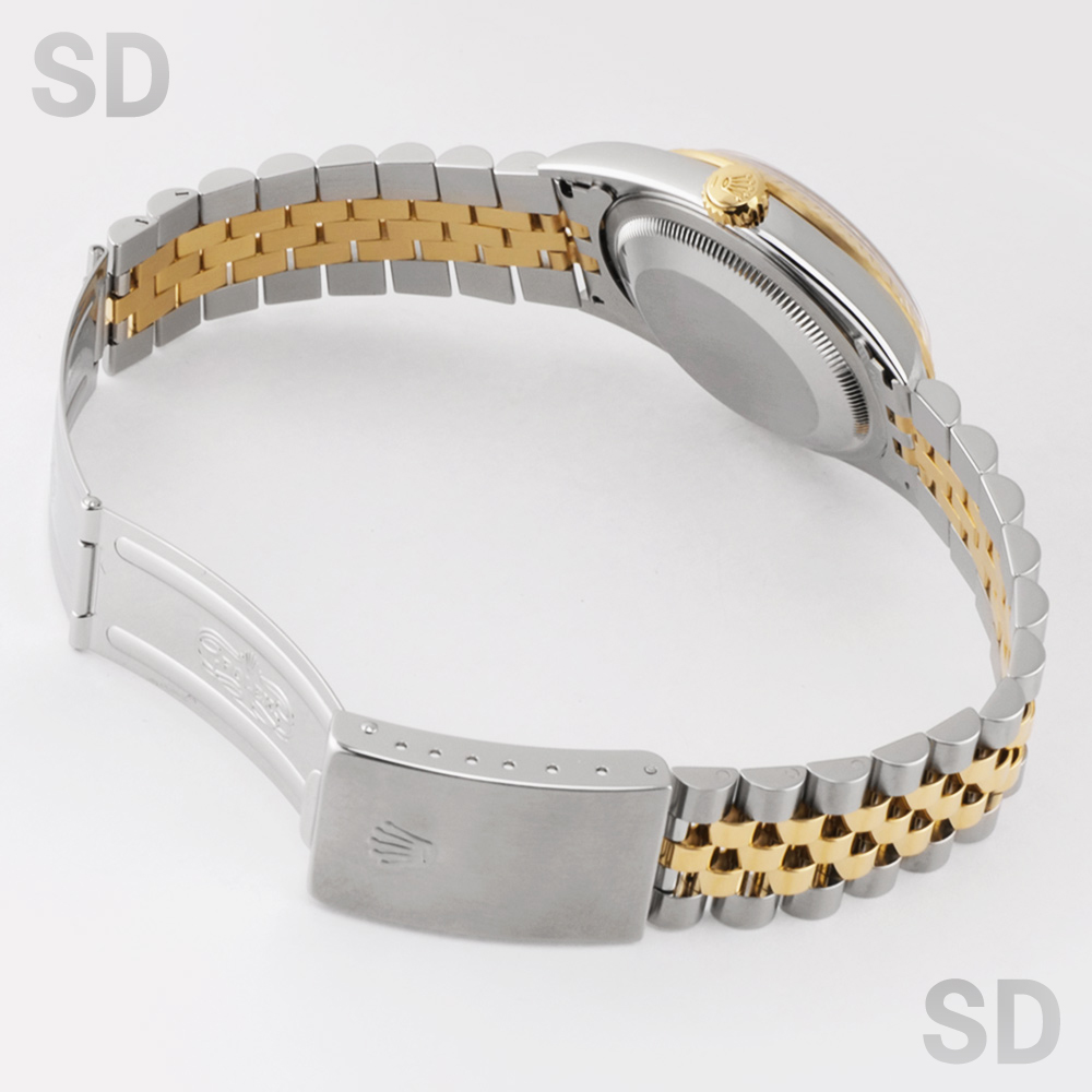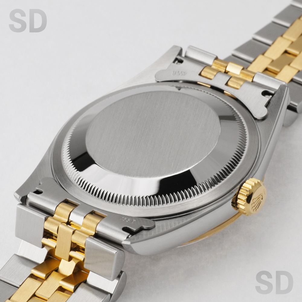 フルーテッドベゼルにジュビリーブレスレットをセットしたイエローゴールドコンビはデイトジャストの中でも代表格とされるデザイン。1990年代初期に”ロレックス×コンビ”から「ロレコン」と呼ばれ一世を風靡したこちらのモデルは、世代を超えて現在でも愛される定番モデルとなりました。現行モデルから数え2世代前のモデルではありますが、旧式モデルとはいえロレックスの代表的な最高ムーブメントとされるCal.3135搭載で精度にも定評がありケースのシャープさとブレスレットの軽さにより普段使いとしても扱いやすく、あえて旧型を選ばれる方も多いほど、当店一番人気のモデルです。