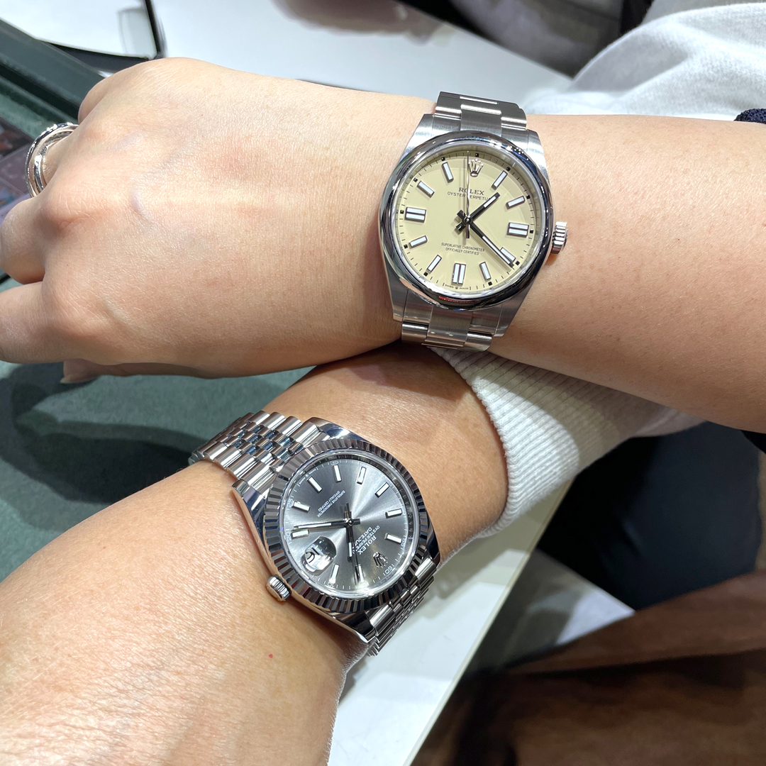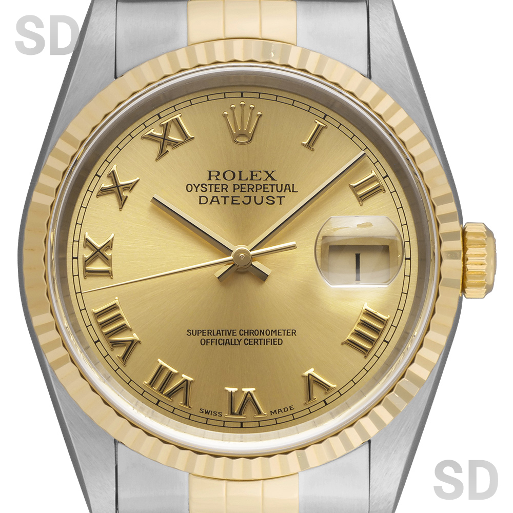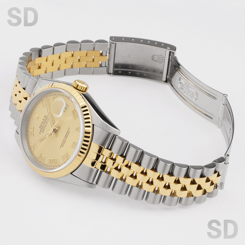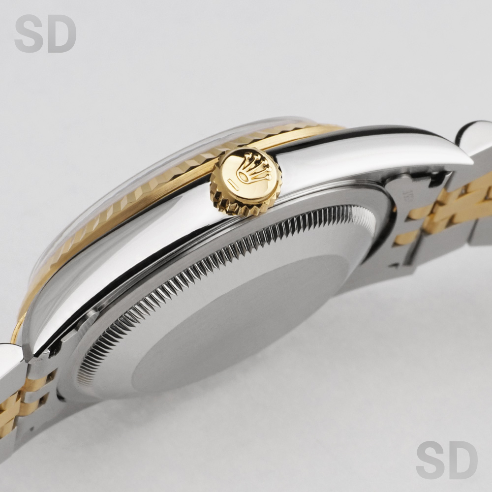 フルーテッドベゼルにジュビリーブレスレットをセットしたイエローゴールドコンビはデイトジャストの中でも代表格とされるデザイン。1990年代初期に”ロレックス×コンビ”から「ロレコン」と呼ばれ一世を風靡したこちらのモデルは、世代を超えて現在でも愛される定番モデルとなりました。現行モデルから数え2世代前のモデルではありますが、旧式モデルとはいえロレックスの代表的な最高ムーブメントとされるCal.3135搭載で精度にも定評がありケースのシャープさとブレスレットの軽さにより普段使いとしても扱いやすく、あえて旧型を選ばれる方も多いほど、当店一番人気のモデルです。