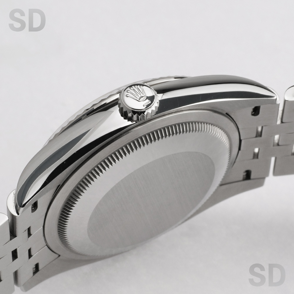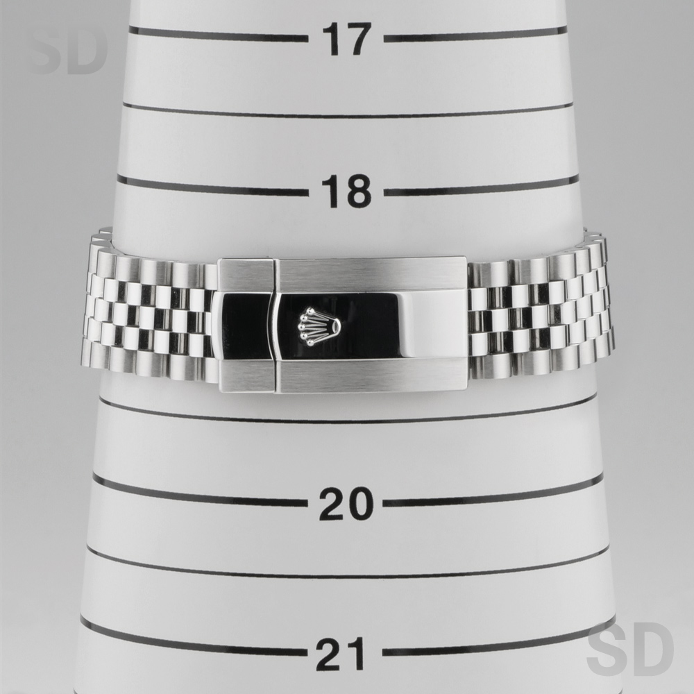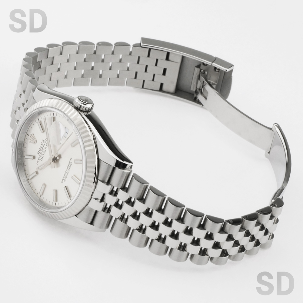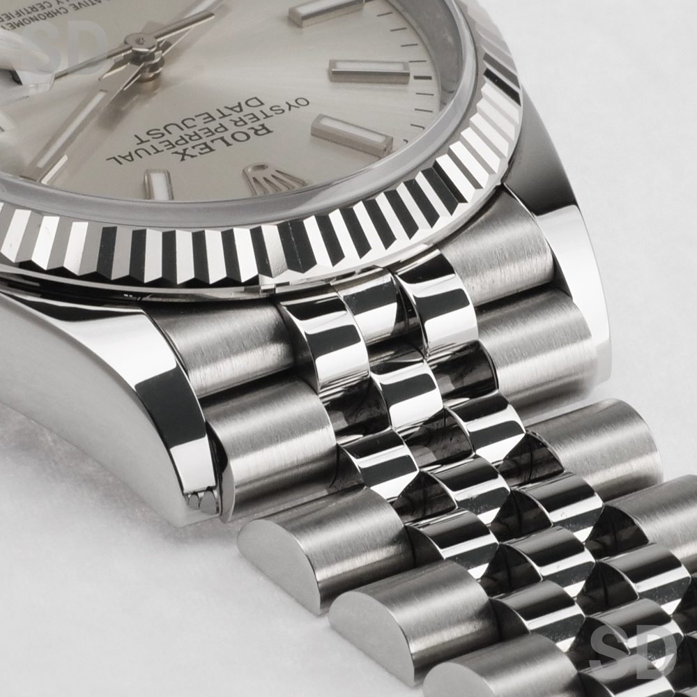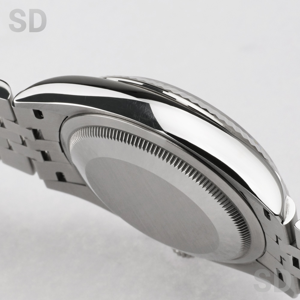 本個体には、端正な印象を与えるシルバー文字盤に、繊細かつ上品な輝きを放つホワイトゴールド製フルーテッドベゼルを組み合わせた仕様となっており、控えめでありながらも確かな品格を感じさせる、完成度の高いモデルでございます。さらに、ブレスレットにはロレックスを象徴するジュビリーブレスレットが装着されており、優れた装着感と洗練されたデザイン性を兼ね備えた統一感のある美しい一本です。