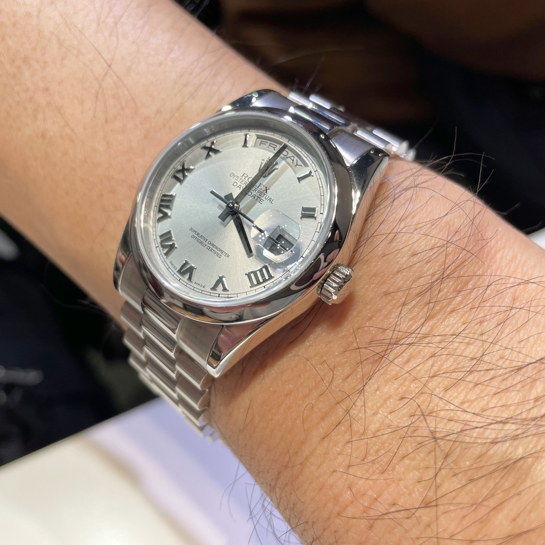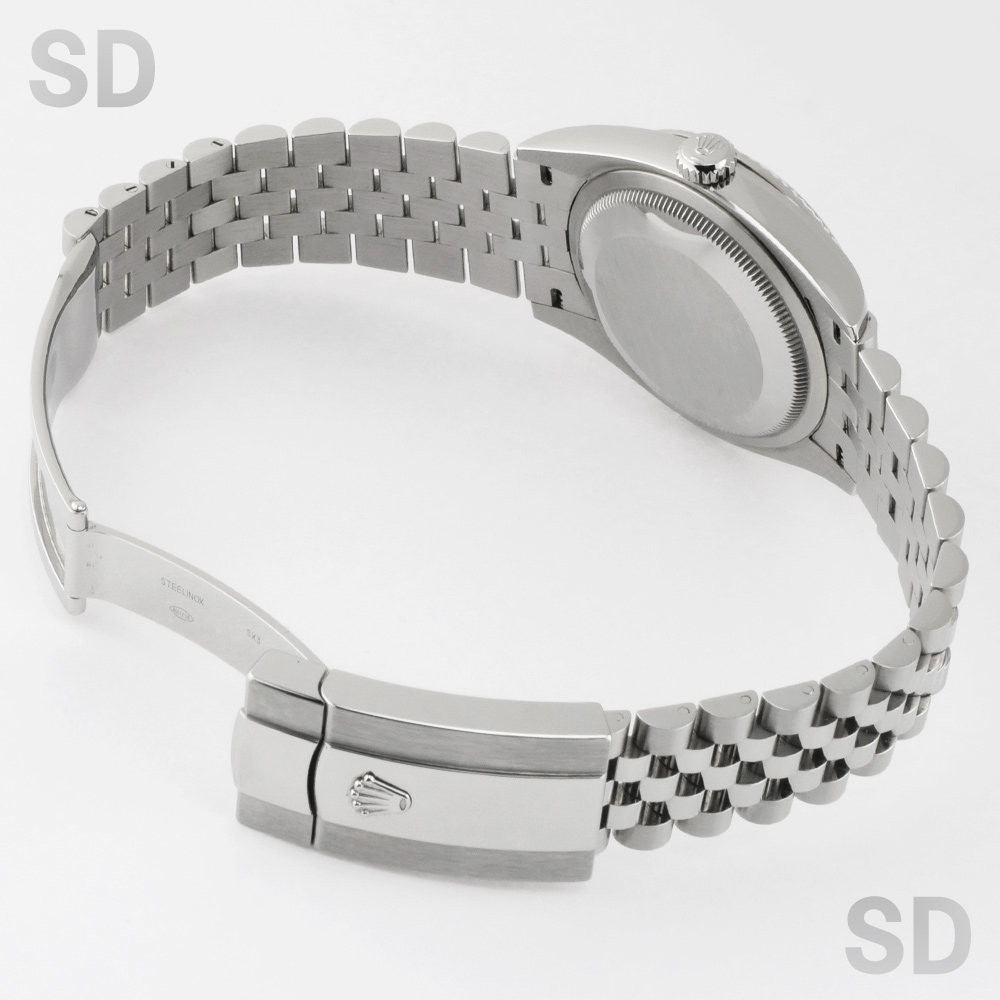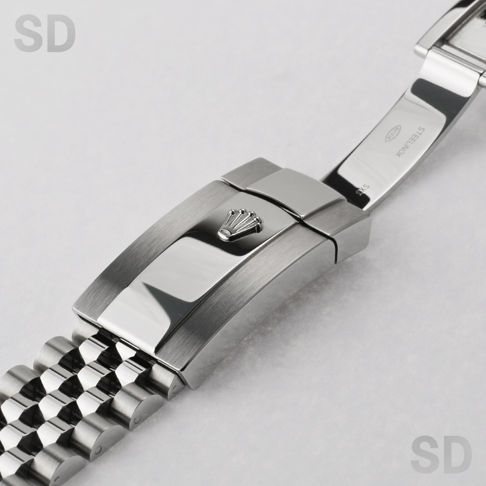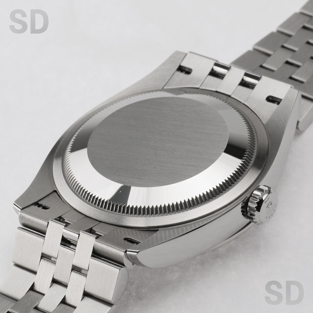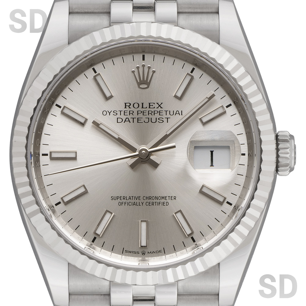本個体には、端正な印象を与えるシルバー文字盤に、繊細かつ上品な輝きを放つホワイトゴールド製フルーテッドベゼルを組み合わせた仕様となっており、控えめでありながらも確かな品格を感じさせる、完成度の高いモデルでございます。さらに、ブレスレットにはロレックスを象徴するジュビリーブレスレットが装着されており、優れた装着感と洗練されたデザイン性を兼ね備えた統一感のある美しい一本です。