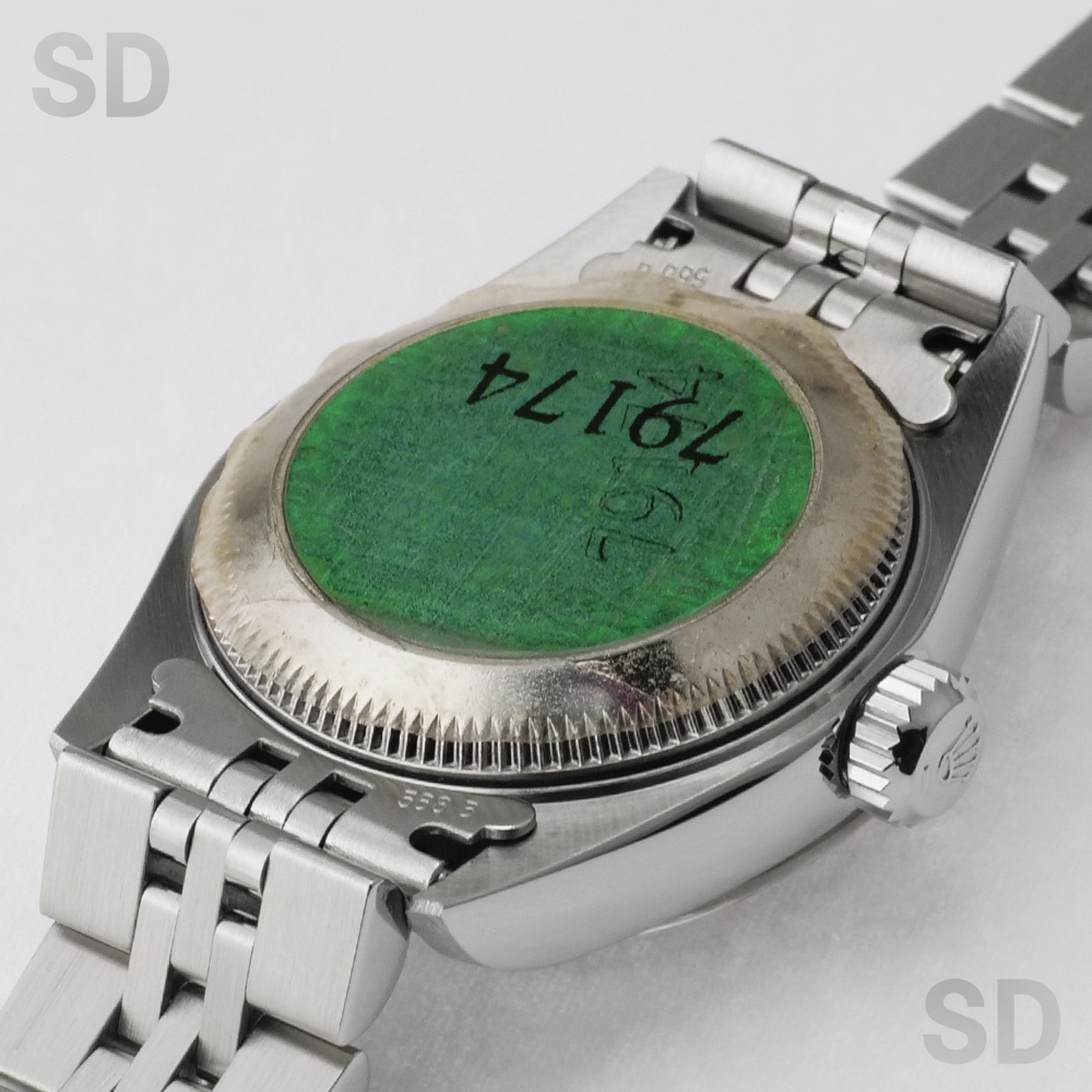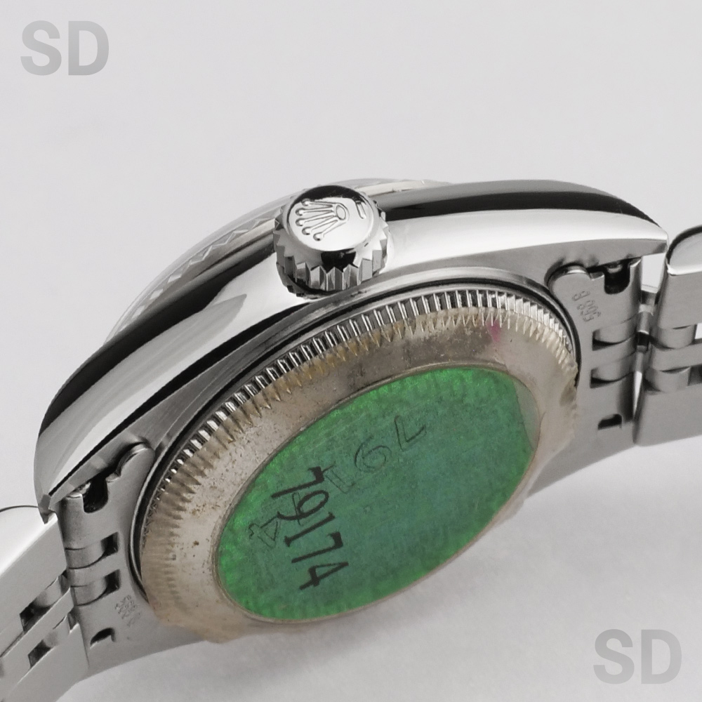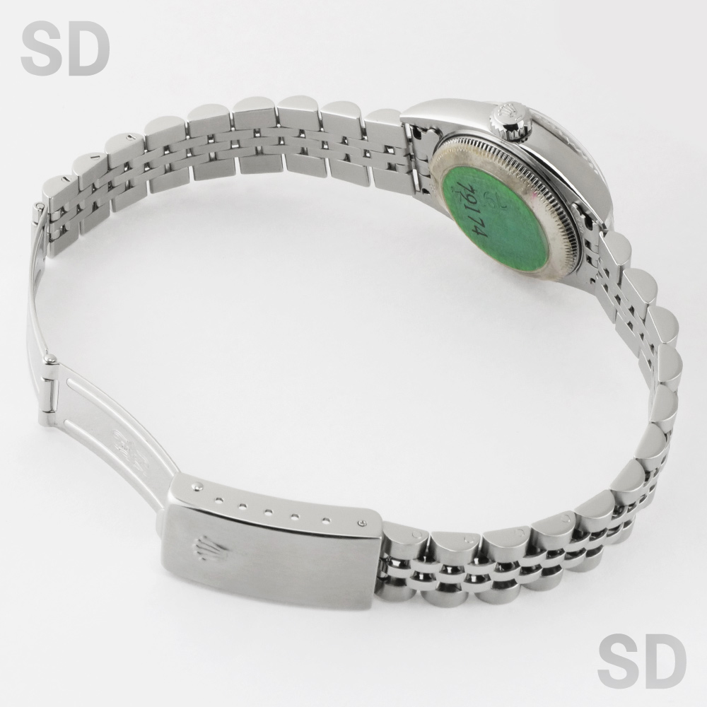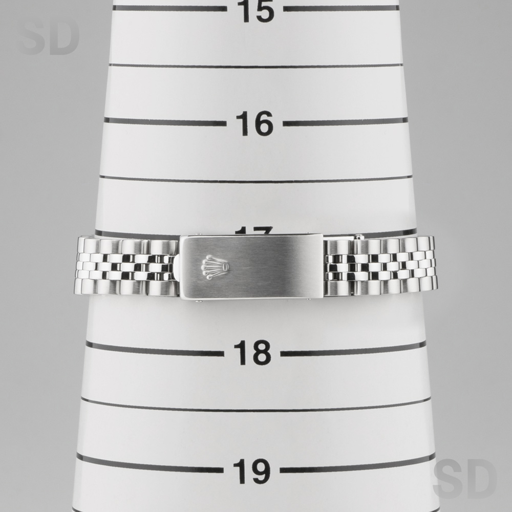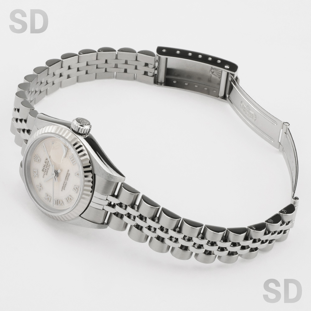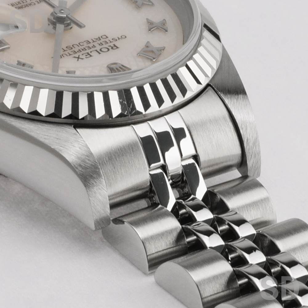 現在は生産が終了してしまった本個体は、ケース径26mmのレディースサイズに、ホワイトゴールド製のフルーテッドベゼルを備え、ロレックスの象徴であるジュビリーブレスレットと、ピンクシェルのデコレーションローマダイアルが華やかさと優雅さを演出する、気品ある佇まいが魅力のモデルです。ラグ表面のサテン仕上げや中空構造のブレスレットにより、後継モデルと比べて軽やかな装着感を実現しつつ、必要十分な堅牢性も確保しており、ロレックスを日常的に気軽に楽しみたい方や、重さのある時計が苦手な方にもおすすめできる一本です。