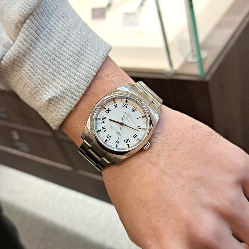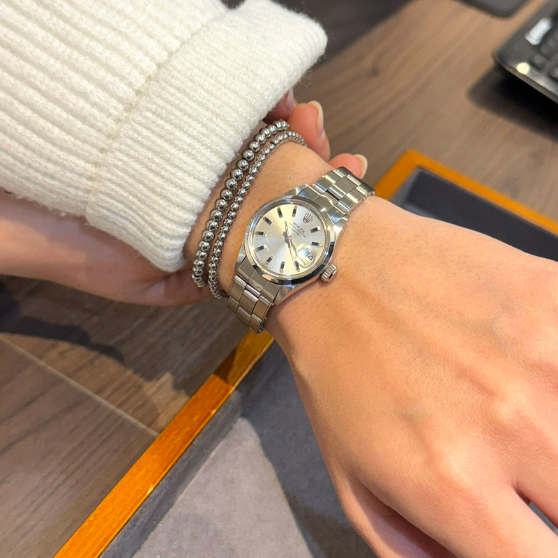 現在は生産が終了している本モデルは、ケース径26mmのレディースサイズに、イエローゴールドとステンレススチールによるロレゾール(コンビ)仕様で、外観上バックルの存在を主張しないコンシールドクラスプ仕様のジュビリーブレスレットを備えております。文字盤には、定番のシャンパンカラーを基調にバーインデックスを配し、華やかさと気品を兼ね備えた、洗練された表情をお楽しみいただける一本です。