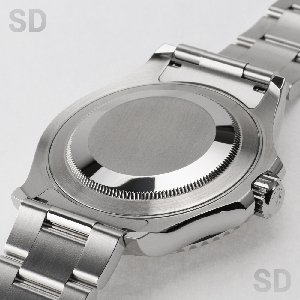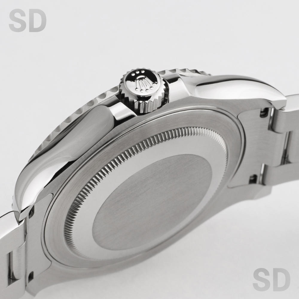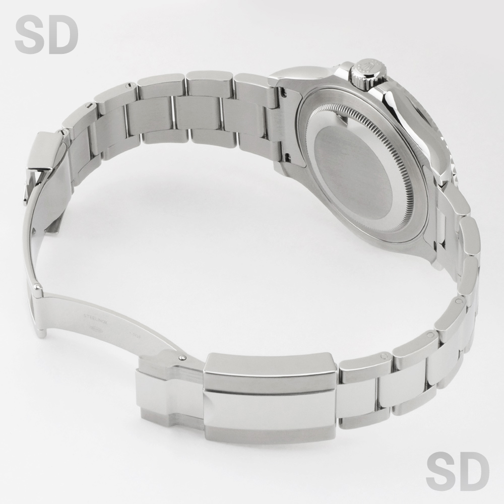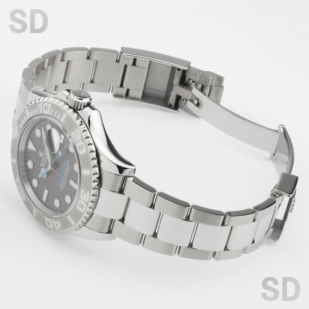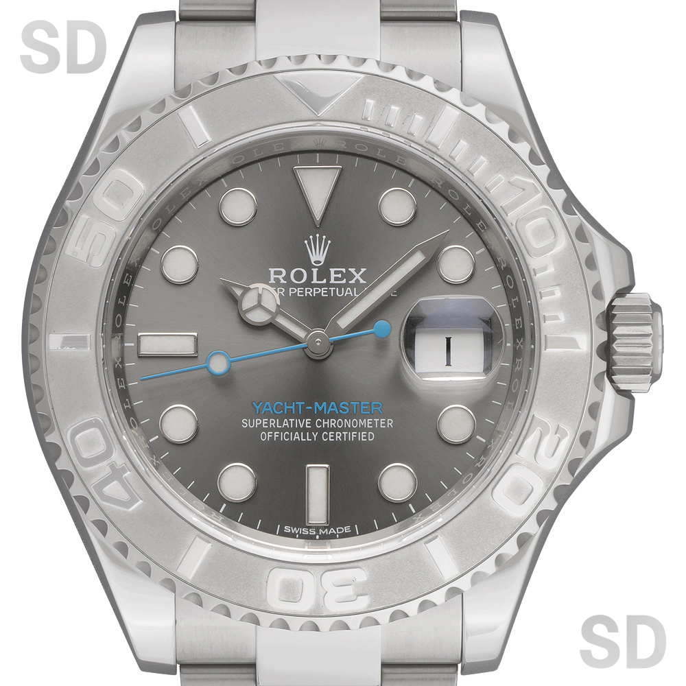 ロレックスで唯一のロレジウム(プラチナとステンレスのコンビ)モデルとなるヨットマスター。ベゼル全体にプラチナを使用しており、表面にブラスト仕上げ、数字と目盛りはポリッシュ仕上げが施されております。また、こちらの文字盤は当時ダークロジウムと表記されていた現行スレート文字盤同様のカラーです。モデル名および秒針が水色で、お洒落なダイヤルとして現在でも人気。エレガントながらにスポーティでオンオフ問わず活用できるモデルです。
