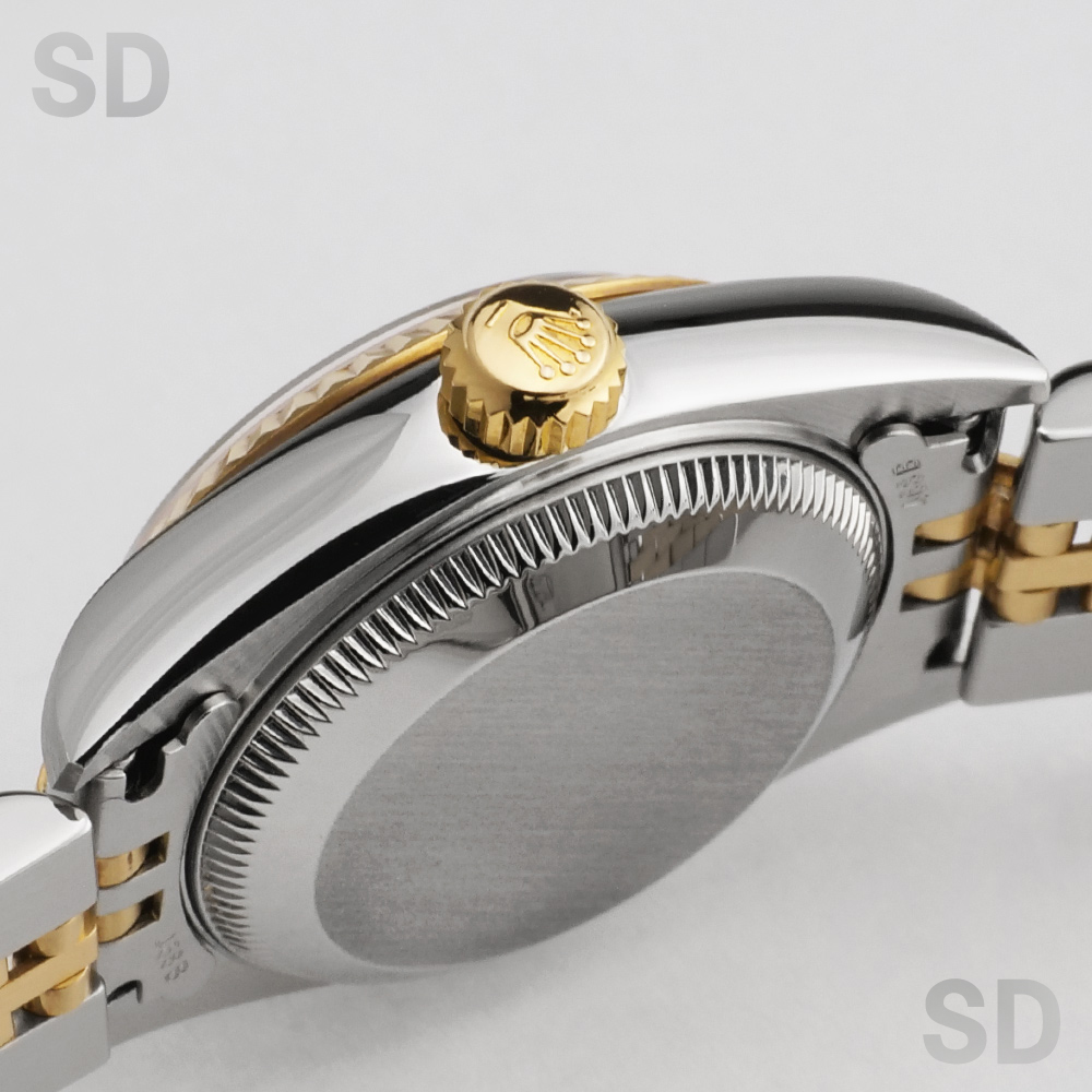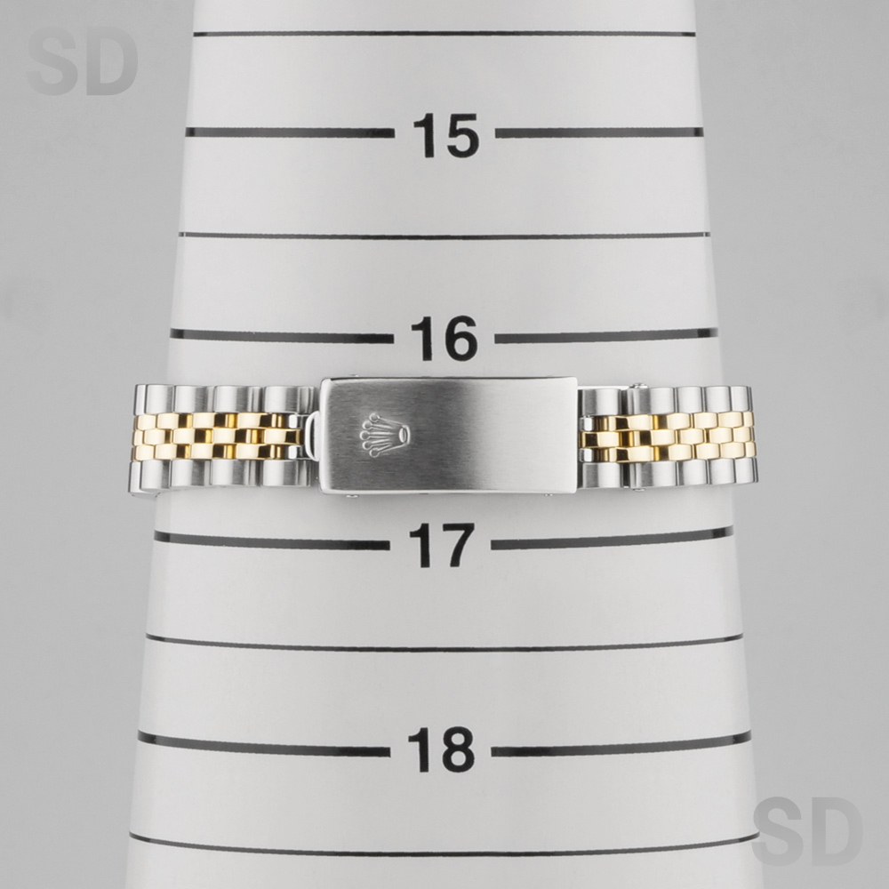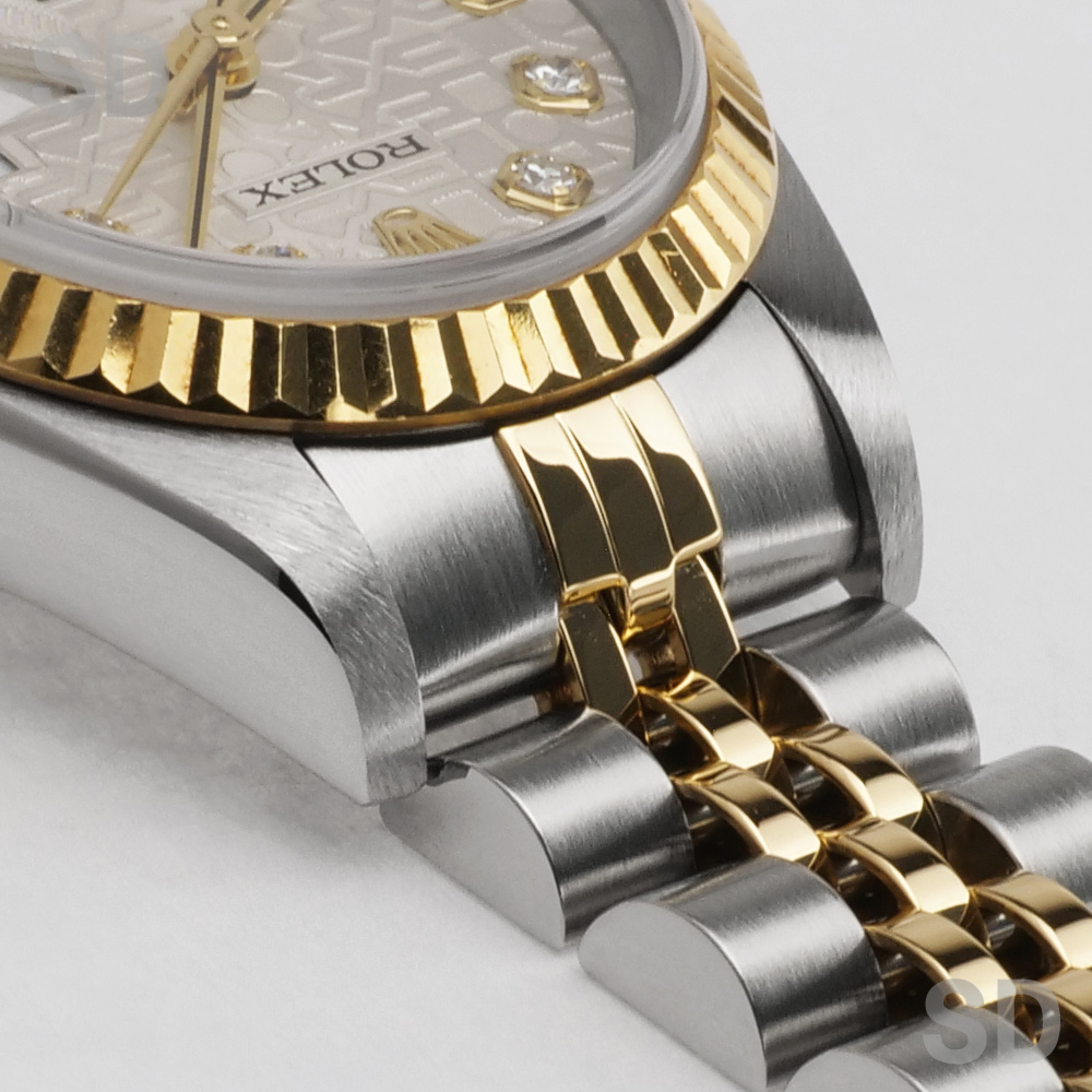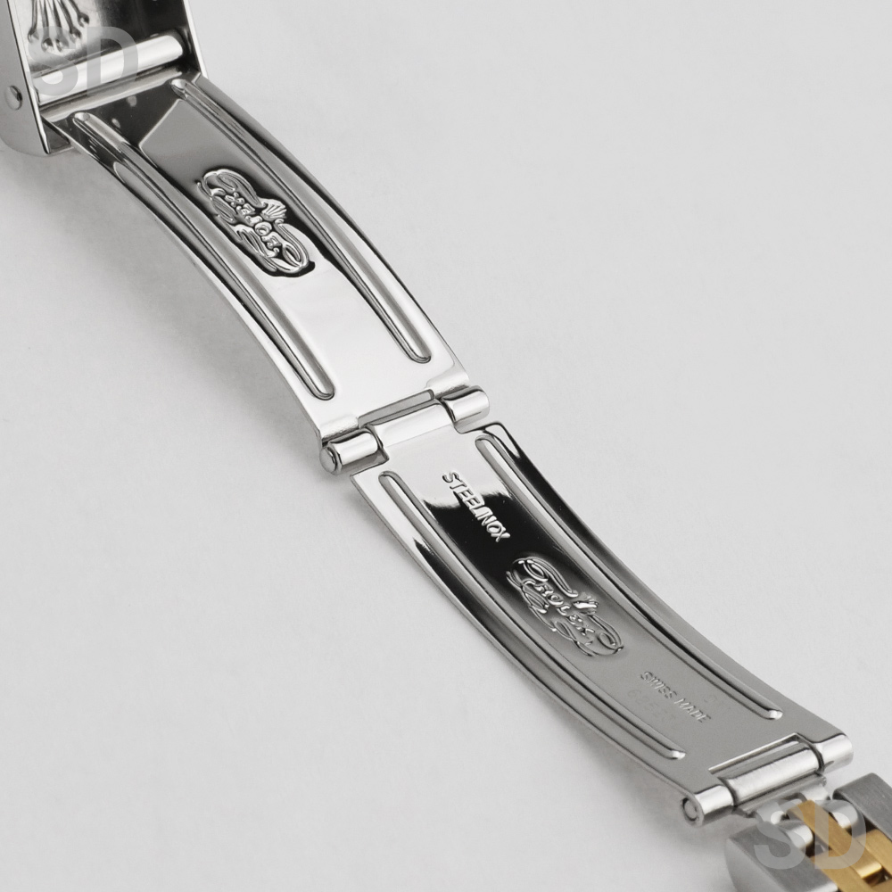 現在は生産が終了している本モデルは、ケース径26mmのレディースサイズに、イエローゴールドとステンレススチールによるロレゾール(コンビ)仕様に、文字盤にはROLEXのパターンが刻まれたシルバーのコンピューターダイヤルを採用。さらに、インデックスには上質なダイヤモンドを贅沢にセッティングされております。現行モデルに比べてシャープなケースラインとサテン仕上げのラグが特徴で、落ち着いた印象を与えます。中空コマのブレスレットは軽量でしなやかであり、腕へのフィット感にも優れています。また、バックルは工具を使用する必要はあるものの、微調整がしやすく、自分の腕に合わせやすい点も旧型ならではの利点です。
