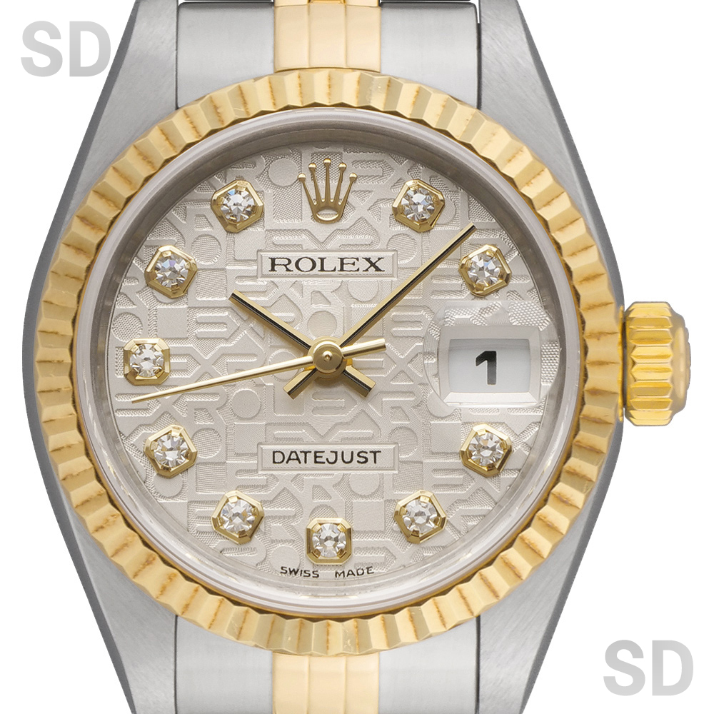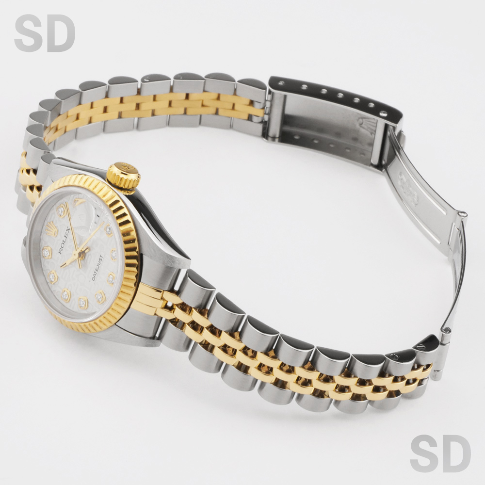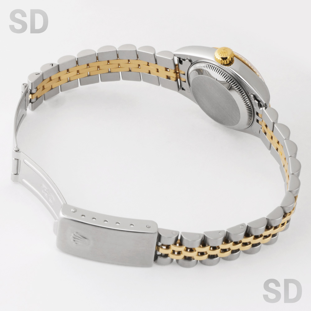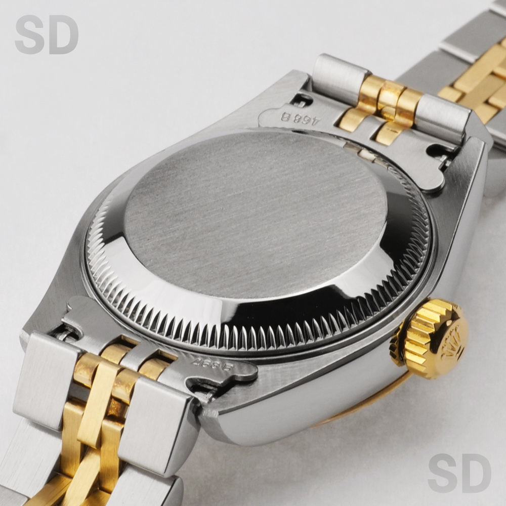 現在は生産が終了している本モデルは、ケース径26mmのレディースサイズに、イエローゴールドとステンレススチールによるロレゾール(コンビ)仕様に、文字盤にはROLEXのパターンが刻まれたシルバーのコンピューターダイヤルを採用。さらに、インデックスには上質なダイヤモンドを贅沢にセッティングされております。現行モデルに比べてシャープなケースラインとサテン仕上げのラグが特徴で、落ち着いた印象を与えます。中空コマのブレスレットは軽量でしなやかであり、腕へのフィット感にも優れています。また、バックルは工具を使用する必要はあるものの、微調整がしやすく、自分の腕に合わせやすい点も旧型ならではの利点です。