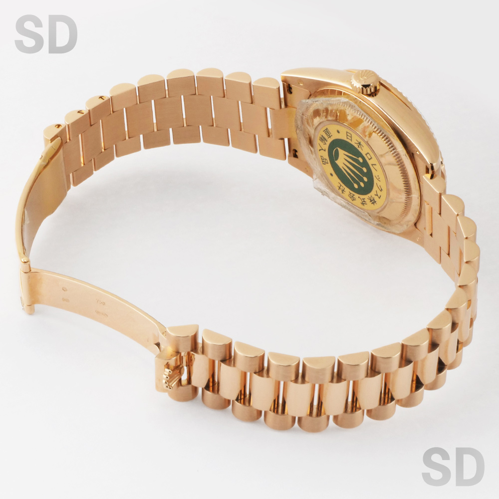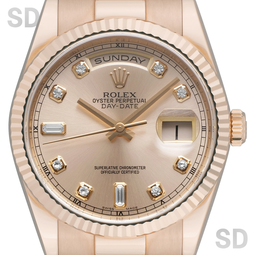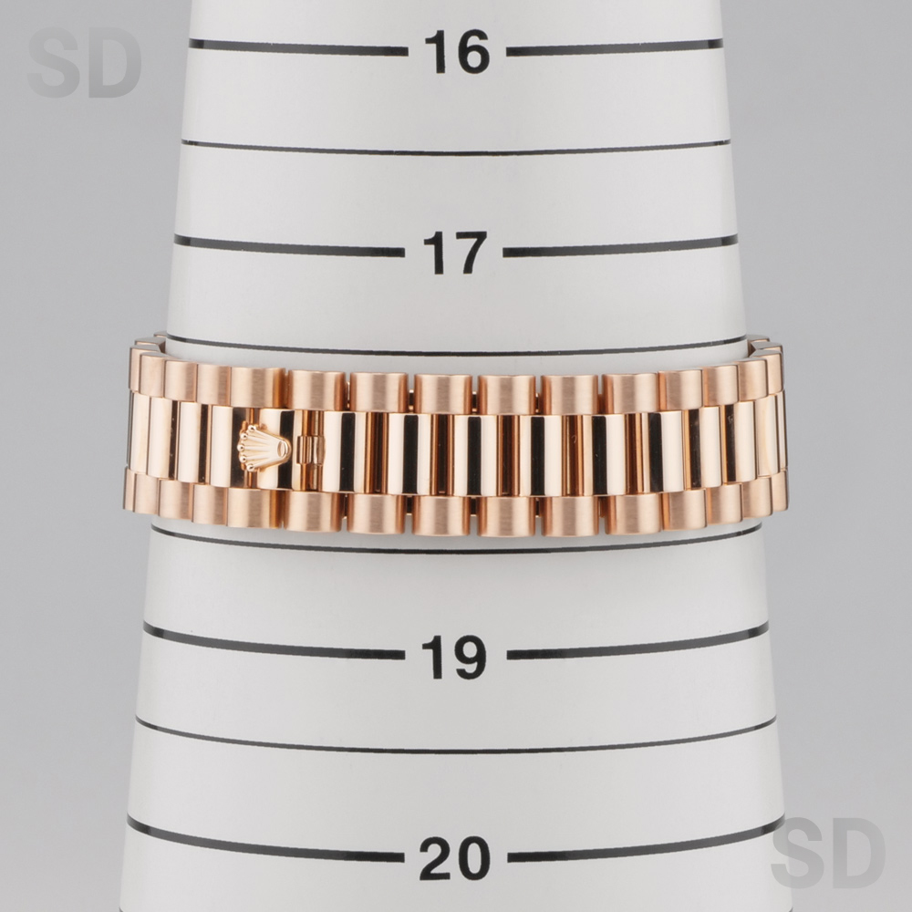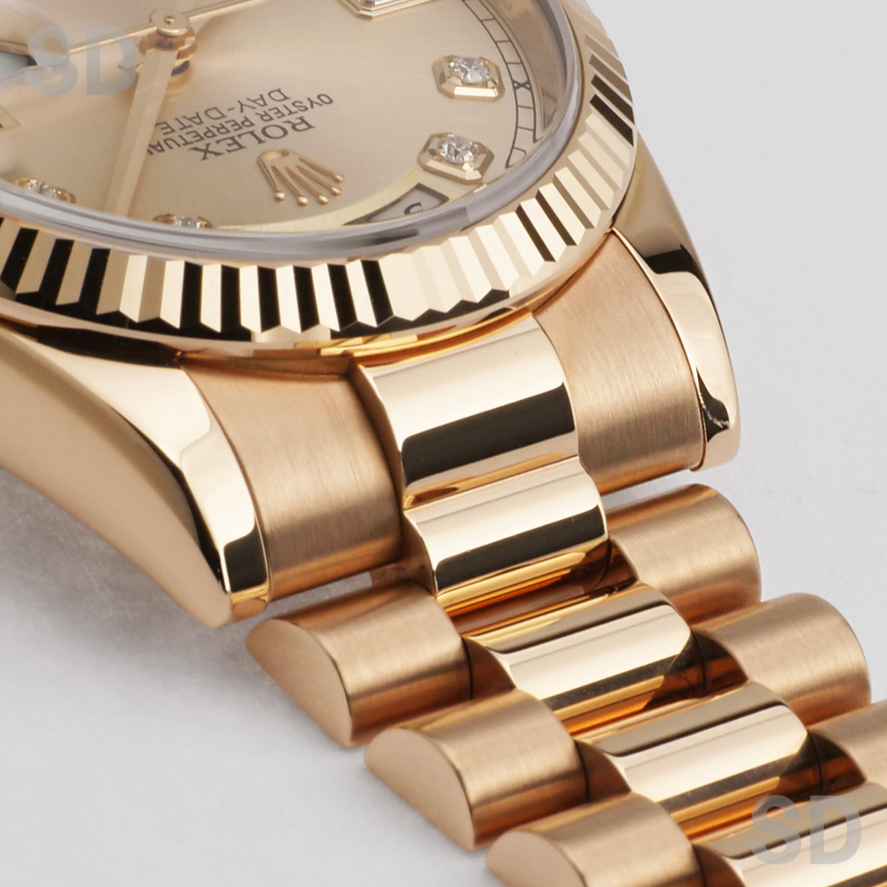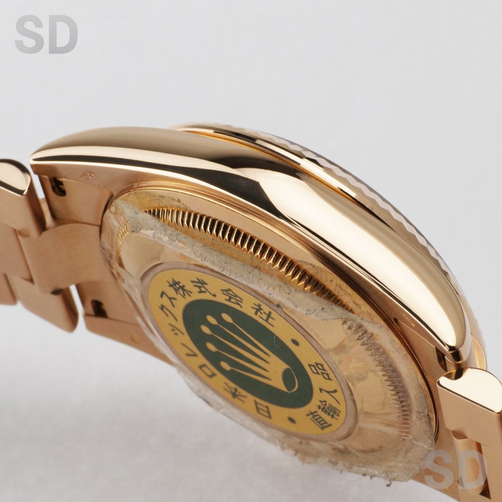 現在は生産が終了している本モデルは、ケース径36mmのケースおよびブレスレットにエバーローズゴールドを用い、ロレックスを象徴するフルーテッドベゼルと、デイデイト専用のプレジデントブレスレットを備えたモデルです。ダイアルには、素材の色調と美しく調和するピンクカラーを採用し、インデックスにはダイヤモンドをあしらっています。全体に統一感のある色彩設計により、気品と高級感を兼ね備えた仕上がりとなっています。