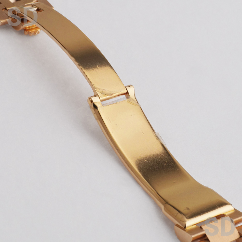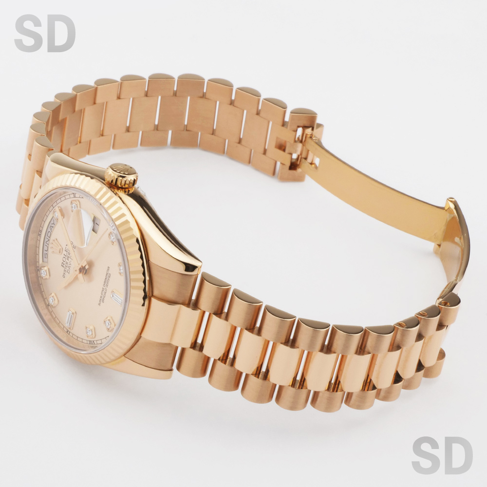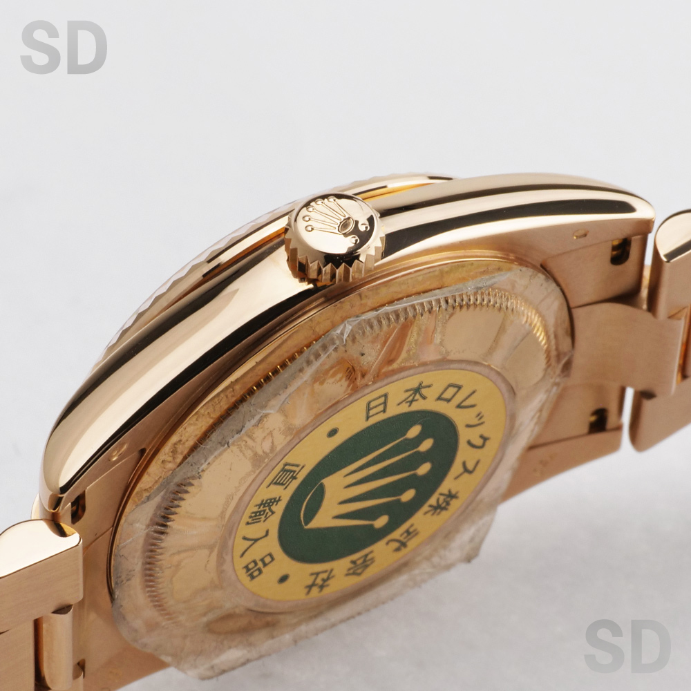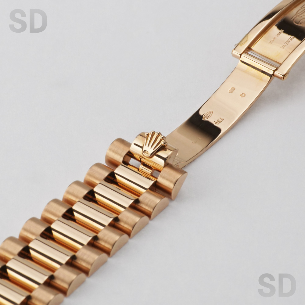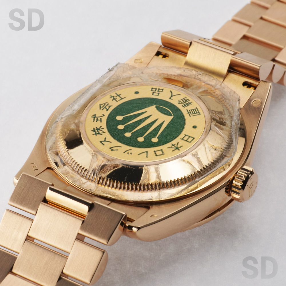 現在は生産が終了している本モデルは、ケース径36mmのケースおよびブレスレットにエバーローズゴールドを用い、ロレックスを象徴するフルーテッドベゼルと、デイデイト専用のプレジデントブレスレットを備えたモデルです。ダイアルには、素材の色調と美しく調和するピンクカラーを採用し、インデックスにはダイヤモンドをあしらっています。全体に統一感のある色彩設計により、気品と高級感を兼ね備えた仕上がりとなっています。