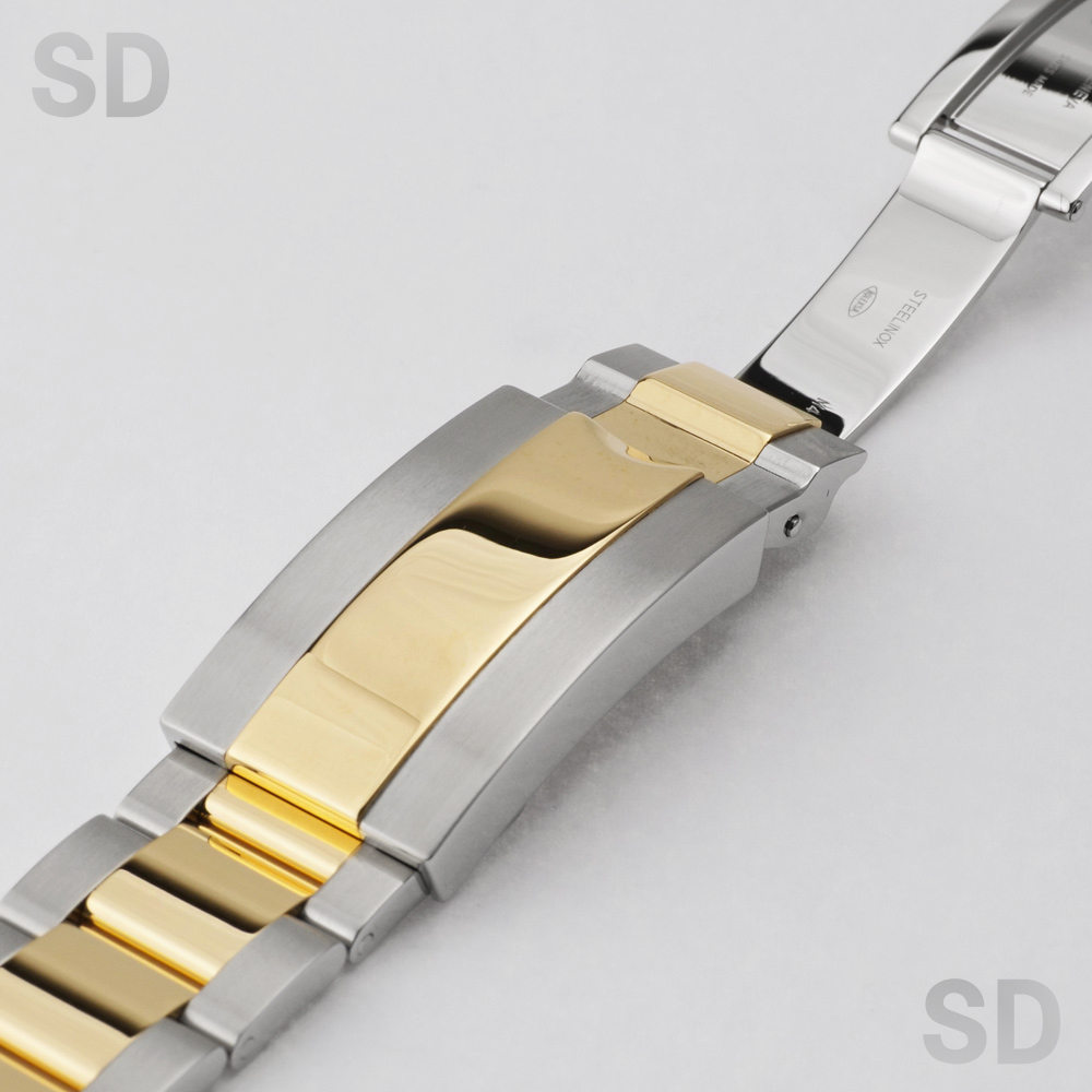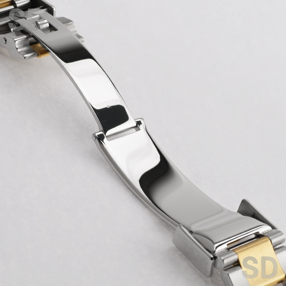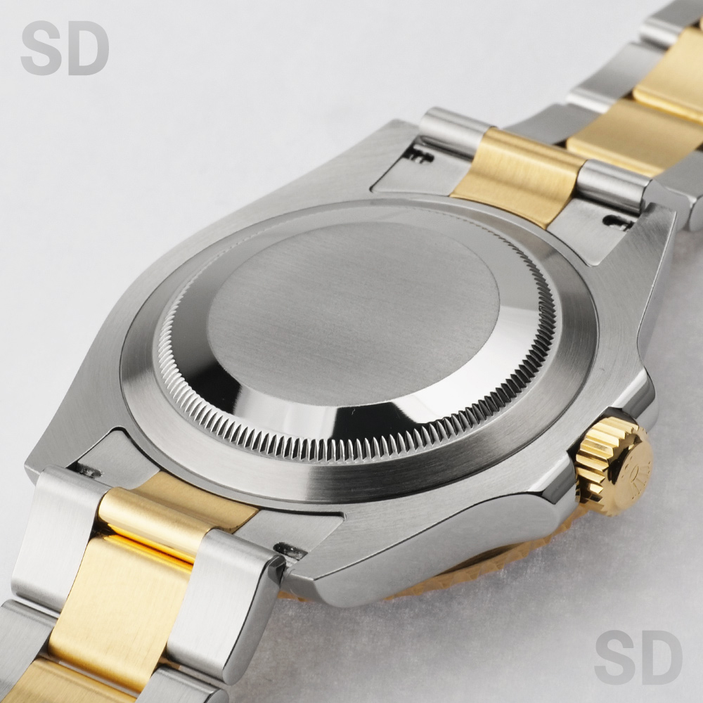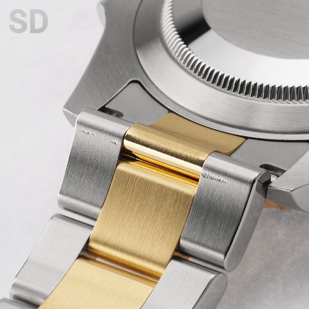 状態です。外装につきましては、提携の修理工房にて研磨処理が施されており、全体的に非常に良好な状態を保っております。僅かに研磨によって除去できなかった微細な擦り傷や小傷が、フラッシュフィット裏やリューズガードなどに残っておりますが、いずれも表面上のものであり、機能面や装着感に影響を及ぼすものではございません。総合的に判断いたしましても、全体的に大変綺麗な状態を保っている個体です。