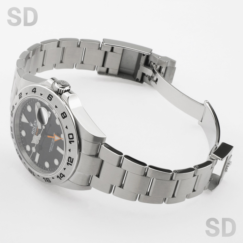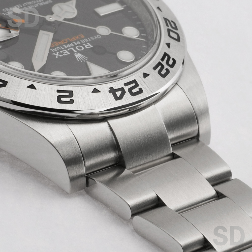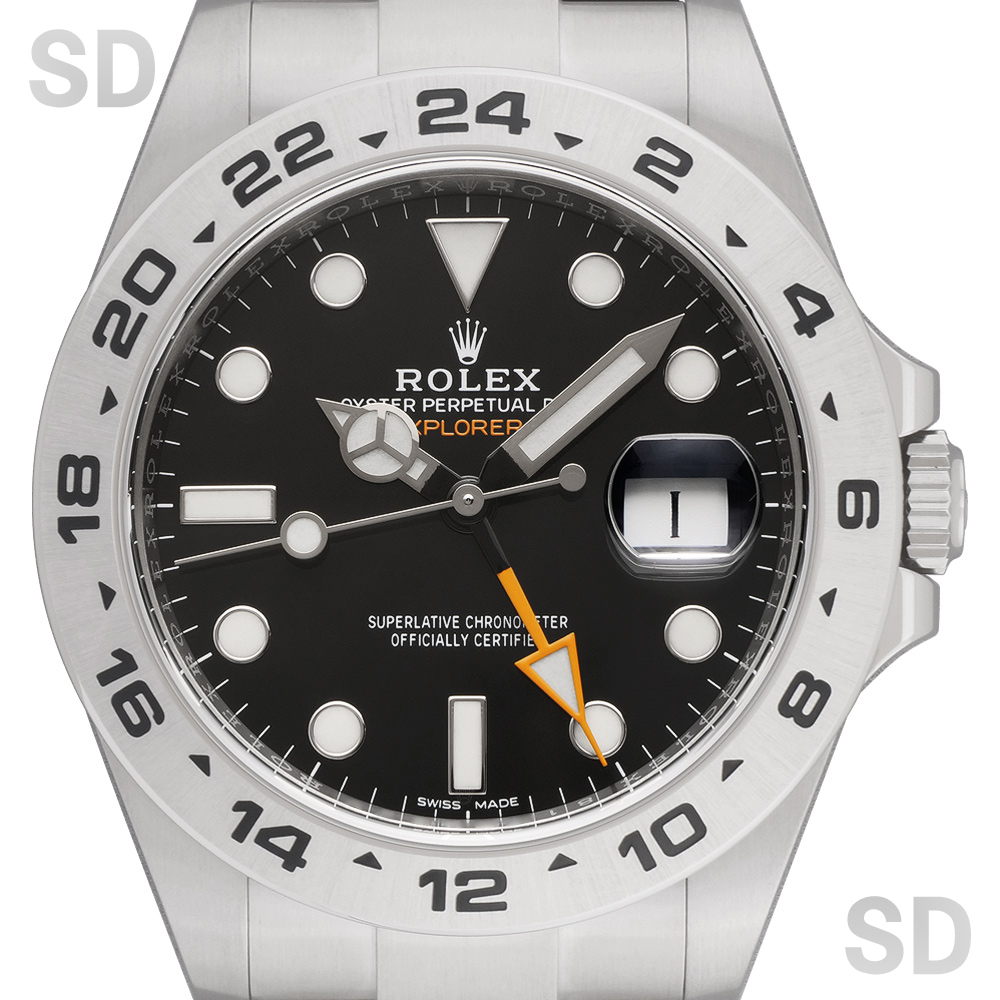 現在は生産終了となっている本モデルは、エクスプローラーIIとして初めて42mmケースを採用したモデルであり、確かな存在感と優れた視認性を兼ね備えている点が大きな魅力でございます。ブラックダイアル仕様は、精悍で落ち着いた印象を与えるデザインとなっており、オレンジの24時間針との鮮やかなコントラストが美しく、スポーティーさと上品さを兼ね備えた一本でございます。
