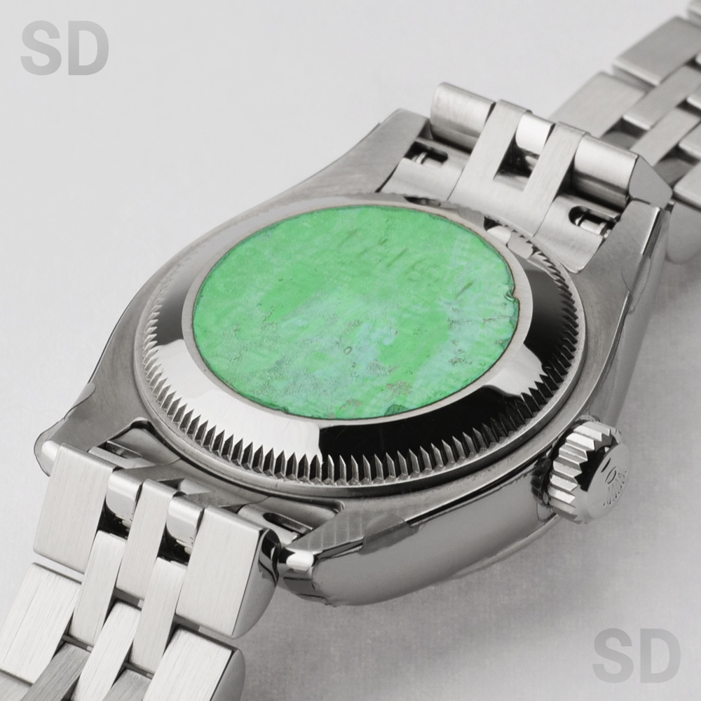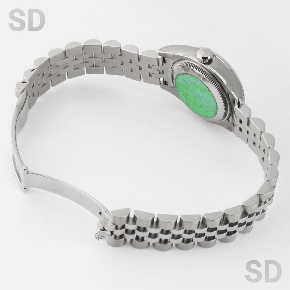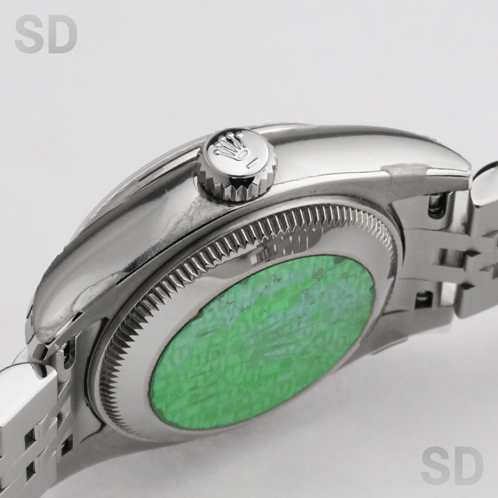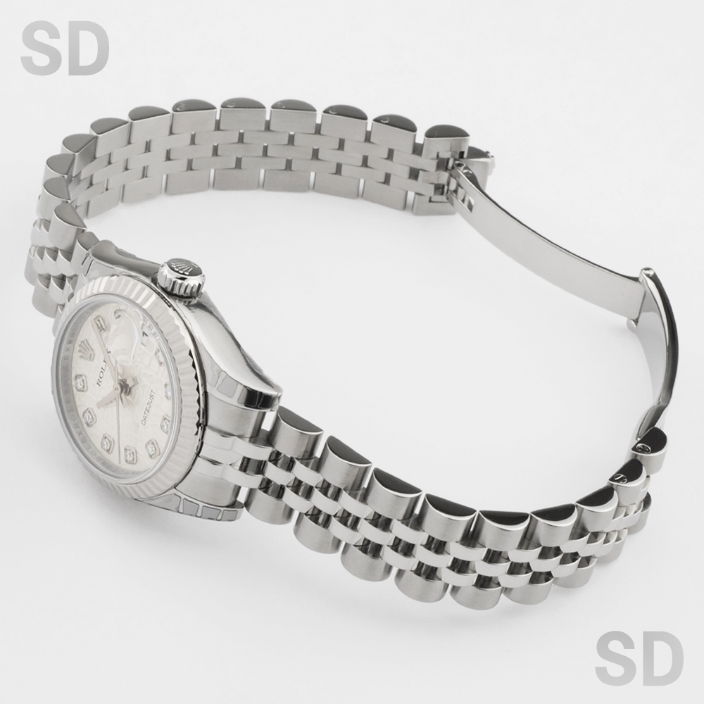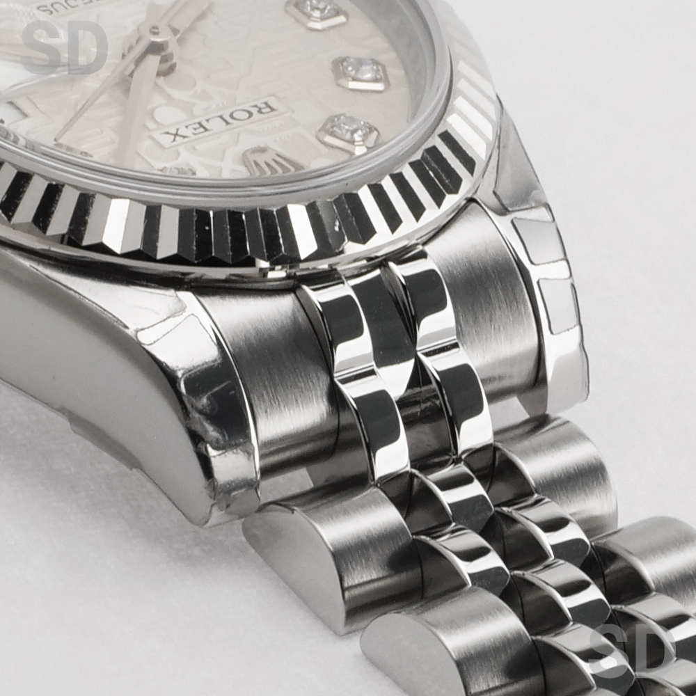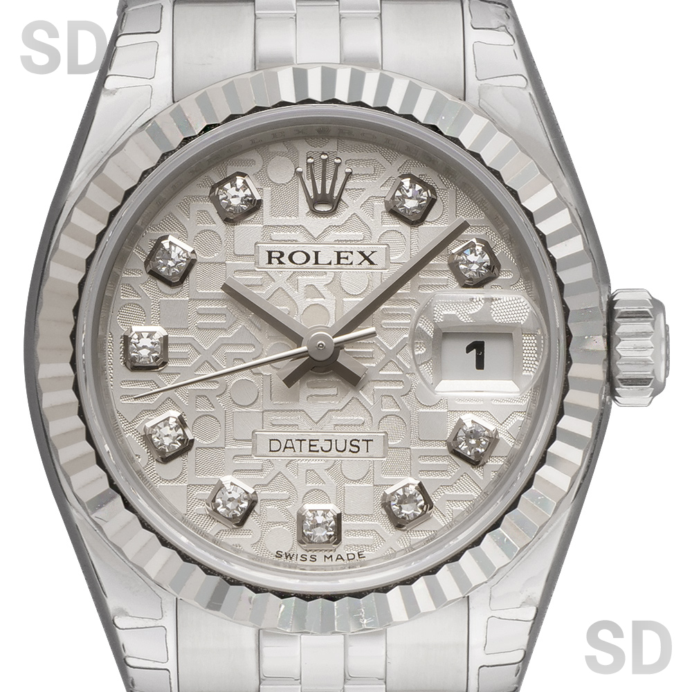 現在は生産終了となっている本モデルは、ケース径26mmのレディースサイズで、ホワイトゴールド製フルーテッドベゼルとステンレススチールを組み合わせたロレゾール(コンビ)仕様です。外観からバックルが目立たないコンシールドクラスプ付きジュビリーブレスレットを備え、文字盤にはROLEXのモチーフが繊細にあしらわれたシルバーのコンピューターダイヤルを配し、インデックスには上質なダイヤモンドをセッティング。華やかさの中に気品を感じさせる、洗練された佇まいが魅力の時計でございます。