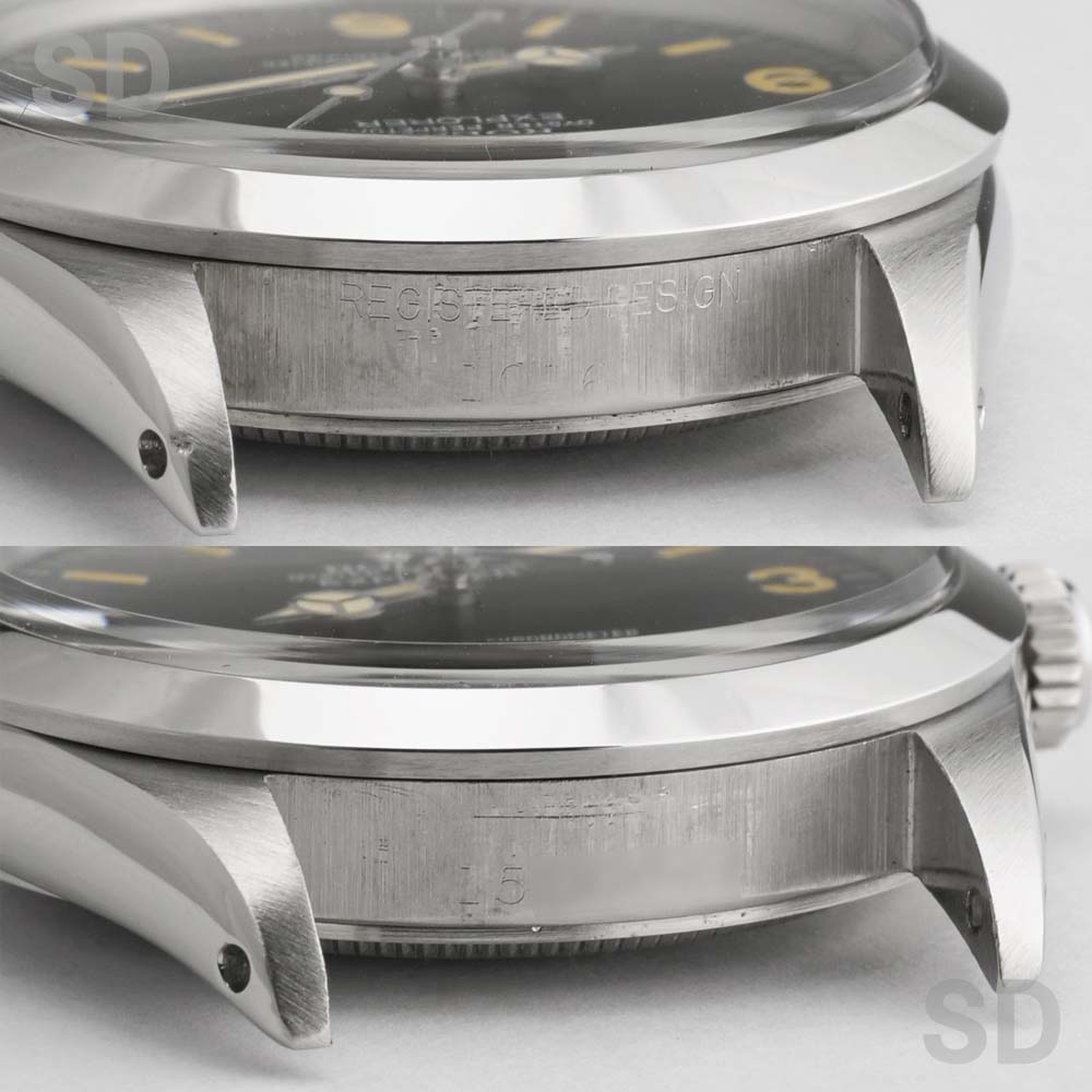 2時側ラグ角にへこみ(打痕)があり、またケースは長年の外装仕上げによって僅かに痩せと丸みがございます。