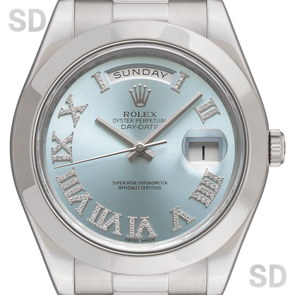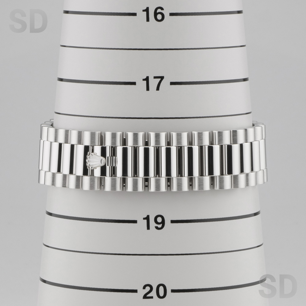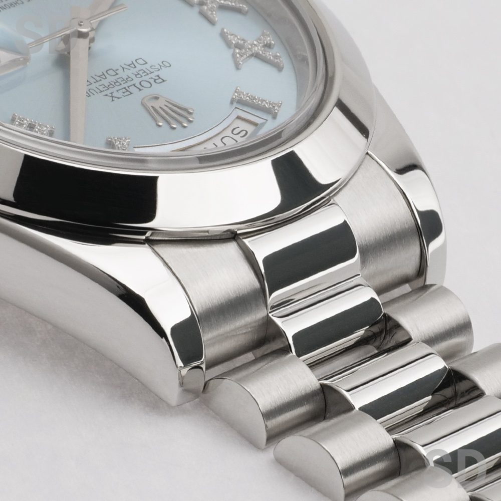 本個体は2008年頃から2015年頃にかけて製造されていた旧型リファレンスにあたり、ロレックスの最高峰ドレスラインに位置付けられるデイデイトの中でも、ひときわ存在感を放つ41mmケースのラージサイズモデルでございます。プラチナ無垢を採用した重厚な仕様に、同型の現行モデルにはないツルっとしたポリッシュベゼルが採用され、専用のプレジデントブレスレットを組み合わせることで、優れた装着感とともに格別な風格を備えた佇まいを演出しております。さらに、ダイヤモンド入りのローマンインデックスを配したダイアルが華やかさと気品を添え、全体としてラグジュアリーな魅力を一層引き立てております。