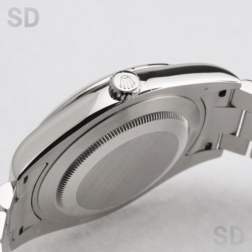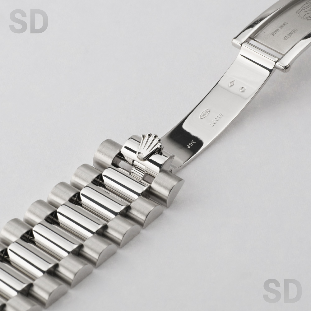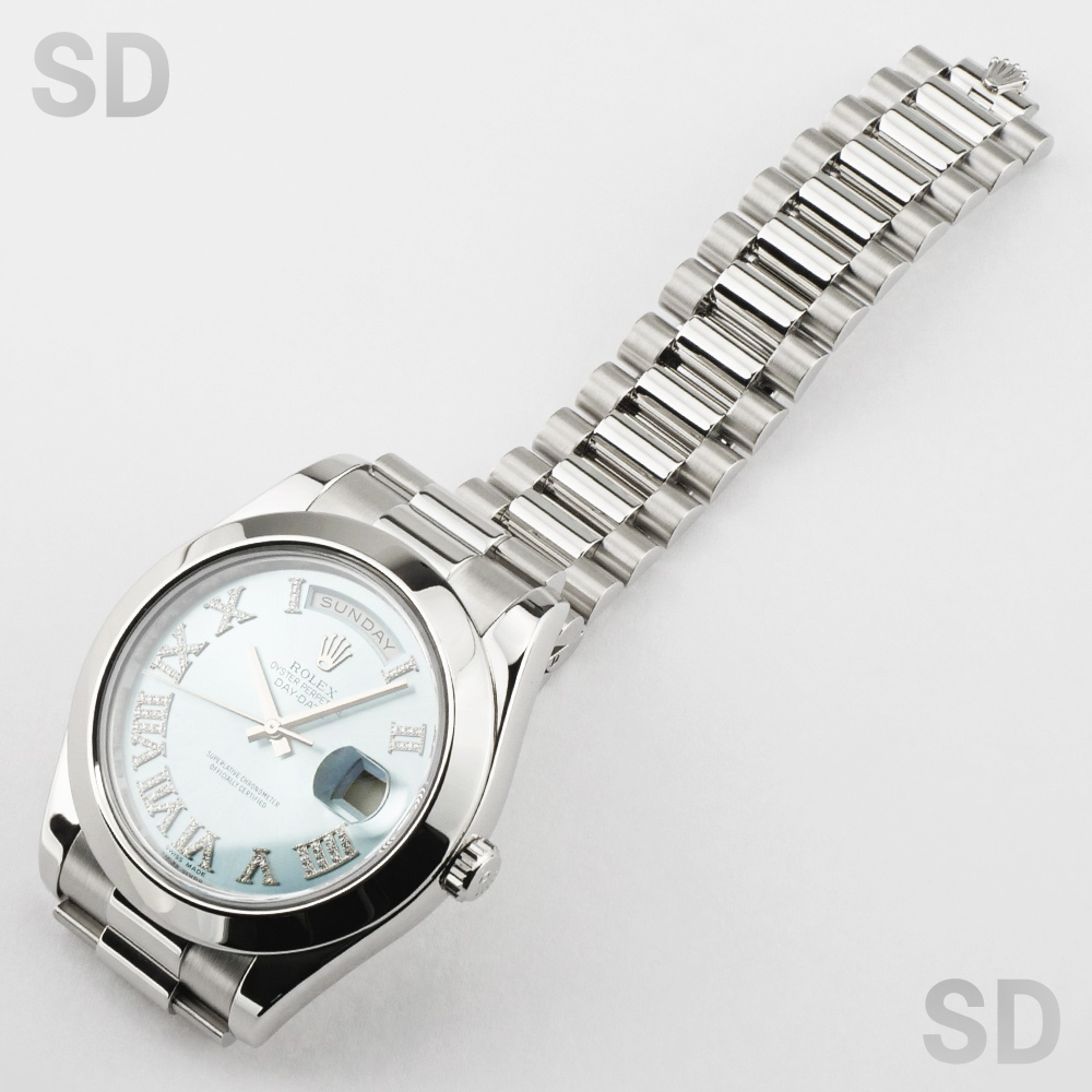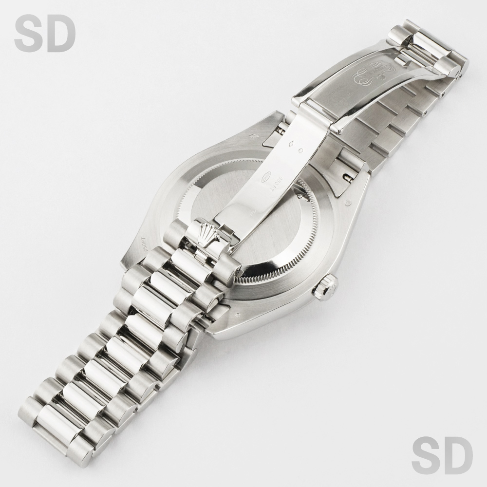 本個体は2008年頃から2015年頃にかけて製造されていた旧型リファレンスにあたり、ロレックスの最高峰ドレスラインに位置付けられるデイデイトの中でも、ひときわ存在感を放つ41mmケースのラージサイズモデルでございます。プラチナ無垢を採用した重厚な仕様に、同型の現行モデルにはないツルっとしたポリッシュベゼルが採用され、専用のプレジデントブレスレットを組み合わせることで、優れた装着感とともに格別な風格を備えた佇まいを演出しております。さらに、ダイヤモンド入りのローマンインデックスを配したダイアルが華やかさと気品を添え、全体としてラグジュアリーな魅力を一層引き立てております。