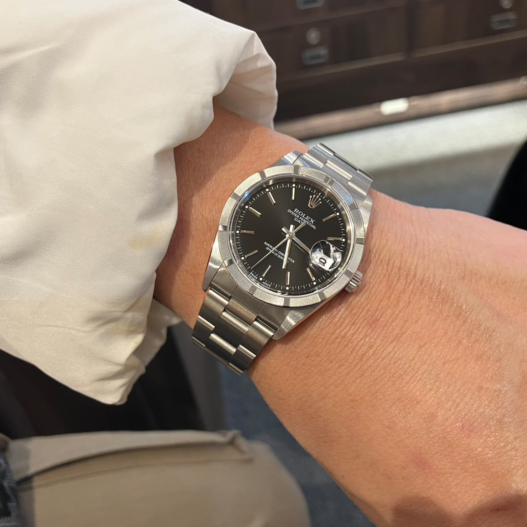 現行モデルから数え2世代前のモデルとなるデイトジャストシリーズ。この世代まで採用されていた「樹皮」を意味するバーク仕上げ仕様のこちらのモデルは、とても粗く不規則な彫り込み仕上げにより独創的な雰囲気を醸し出します。艶を抑えた仕上げによりヴィンテージチックでありますが、ロレックスの代表的な最高ムーブメントとされるCal.3135搭載で精度にも定評があり末永く愛用できるモデルです。