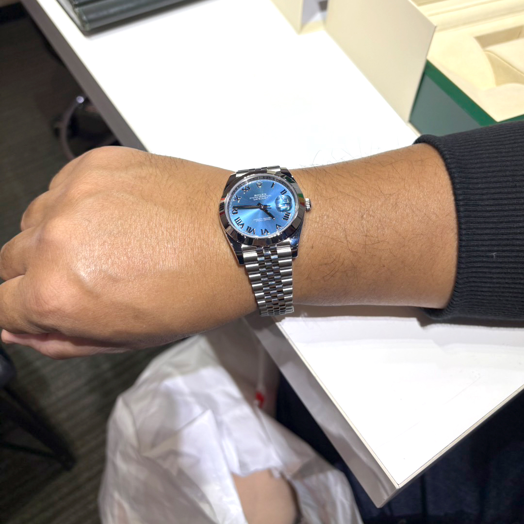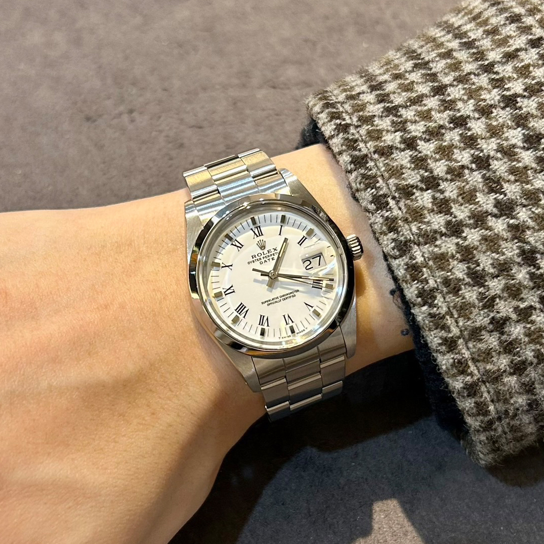 こちらの個体は2015年から2020年頃まで製造されていた旧型モデル。ロレックスの3大発明のうち「オイスターケース」と「パーペチュアル」の2つを搭載したオイスター パーペチュアル。無駄のない無い柔らかなフォルムで、バリエーション豊富なケースサイズが特徴的です。大型な39mmケースに、丸みを帯びたドーム型のポリッシュベゼルと、堅牢性の高いオイスターブレスが装着。ダイヤルはこのモデル特有の若干アイボリー色が入ったホワイトがセットされています。