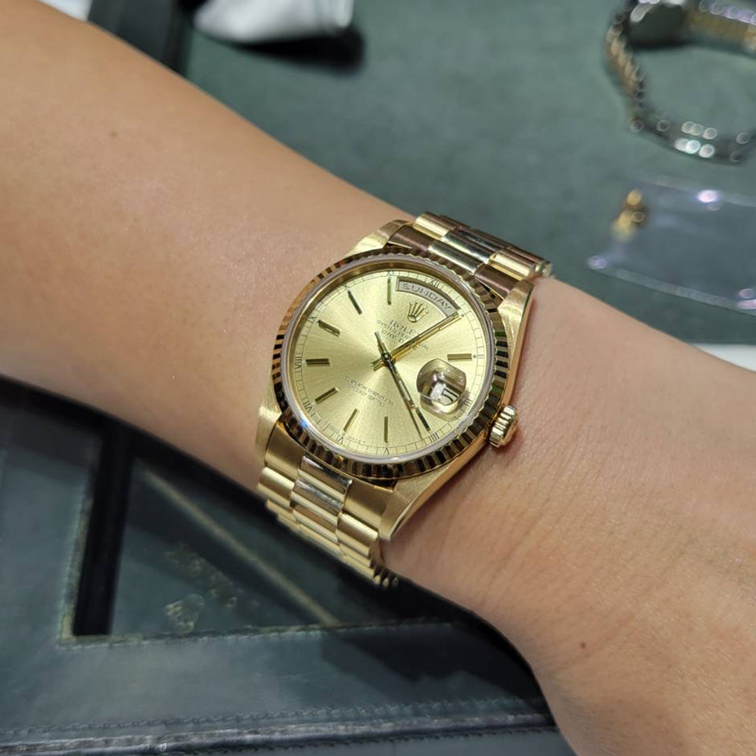 ポリッシュされたドームベゼルに大小合わせ24個のダイヤモンドが埋め込まれたこちらのベゼルはデイトジャスト31専用となる特別仕様ともされるデザイン。当初は男女兼用サイズとされた31mmケースですが、現在では少し大きめのサイズをお好みになる女性向けのラインナップとされているイメージです。ダイヤモンドがさり気なく輝きとても上品で腕元を華やかに彩るアクセサリーとしても最高のモデル。ファッションに合わせやすいブラック文字盤がセットされておりますので、飽きにくく末永くお使いいただけます。