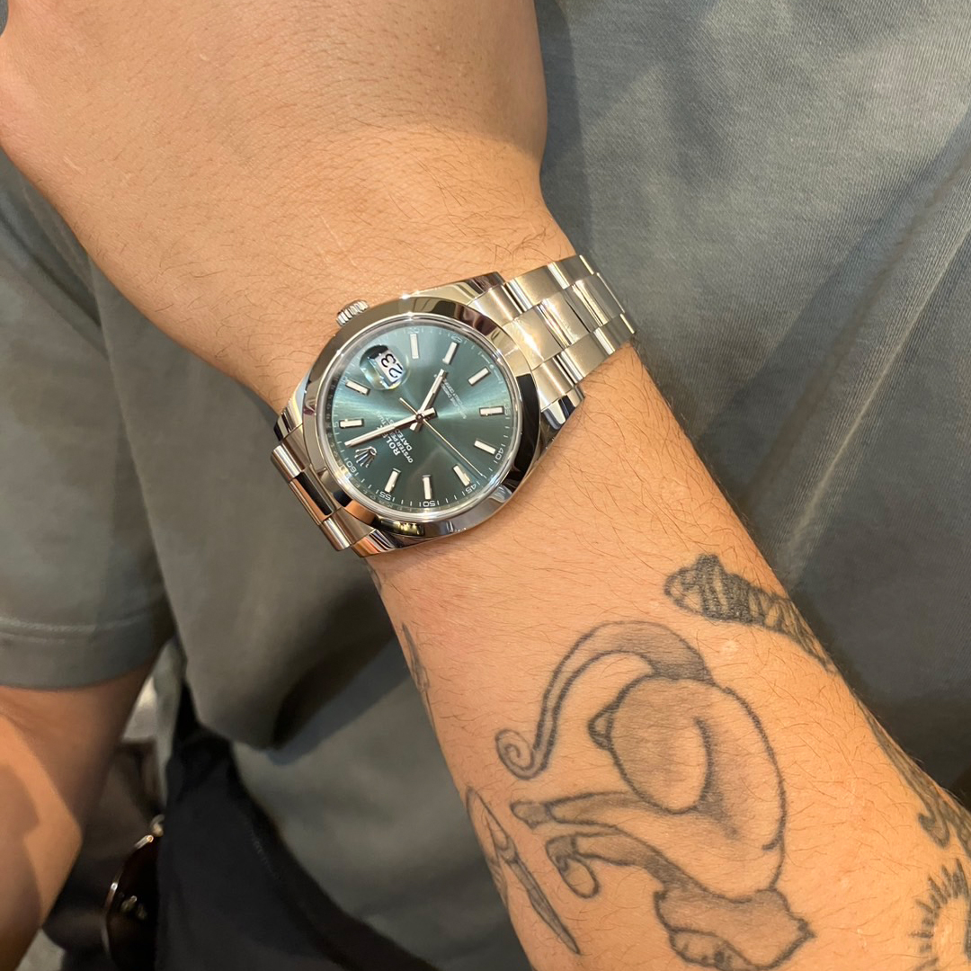 現行デイトジャスト41オールステンレスモデル Ref.126300、抜群な人気のミントグリーンダイヤルをお選び頂きました!