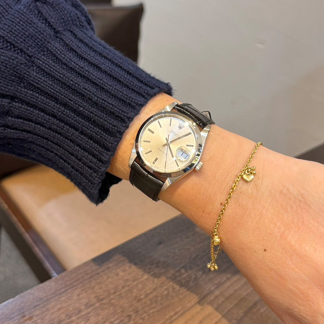 状態です。ベゼルはエッジの痩せを防ぐ目的であえて仕上げ(研磨)を施しておりません。そのため、細かな擦り傷や小傷、経年による変色が確認できますが、全体の雰囲気を損なうような大きなダメージは見受けられません。その他の外装部分につきましては、専門の修理工房にて丁寧に研磨を施しておりますが、リューズやバックル周辺など一部には取りきれない微細な傷が残っております。ブレスレットの伸びは少なめで、年式を考慮すれば全体的なコンディションは非常に良好でございます。