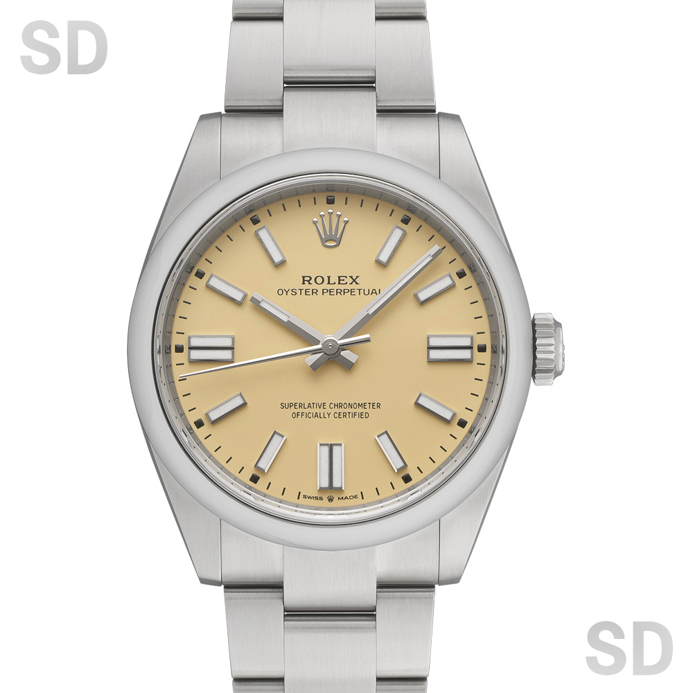 ダイアルには定番のシャンパンカラーが採用され、バーインデックスの近くには夜光塗料と小さなローマ数字がプリントされており、視認性とデザイン性が見事に両立されています。さらに、ケースとブレスレットにはイエローゴールドとステンレススチールのコンビネーションが施され、洗練された高級感を一層引き立てております。