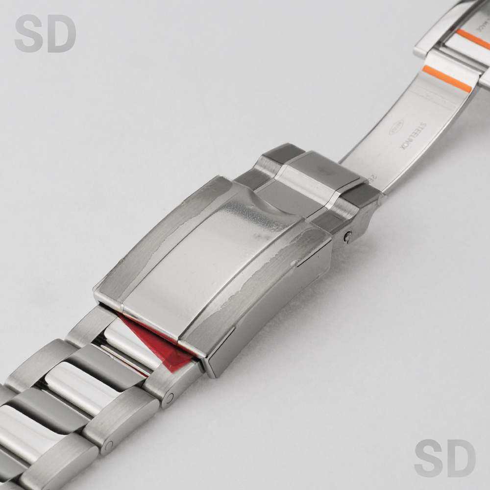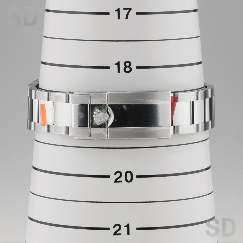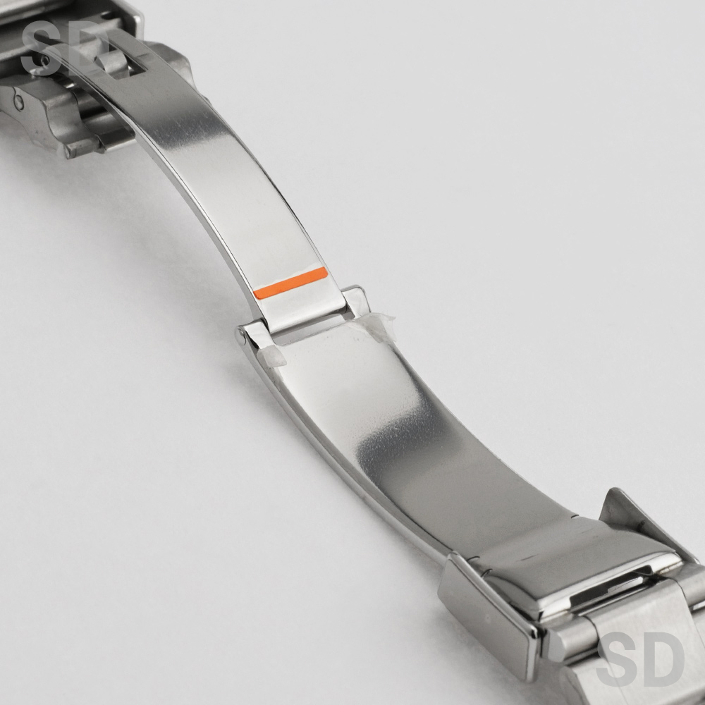状態です。サイズ調整の形跡こそ見受けられるものの、メーカー出荷時の新品保護シールがフラッシュフィット、ケースサイド、リューズガード、バックル、さらにはクラスプ部分に至るまでしっかりと残されており、保管や展示の過程で生じたと推測されるごく僅かな擦れ傷が確認できる程度にとどまっております。こうした点から鑑みても、全体的な印象は極めて良好であり、事実上「未使用品」に近い、いわゆるデッドストックと呼ぶに相応しい希少性の高い一本と評価できるのではないでしょうか。