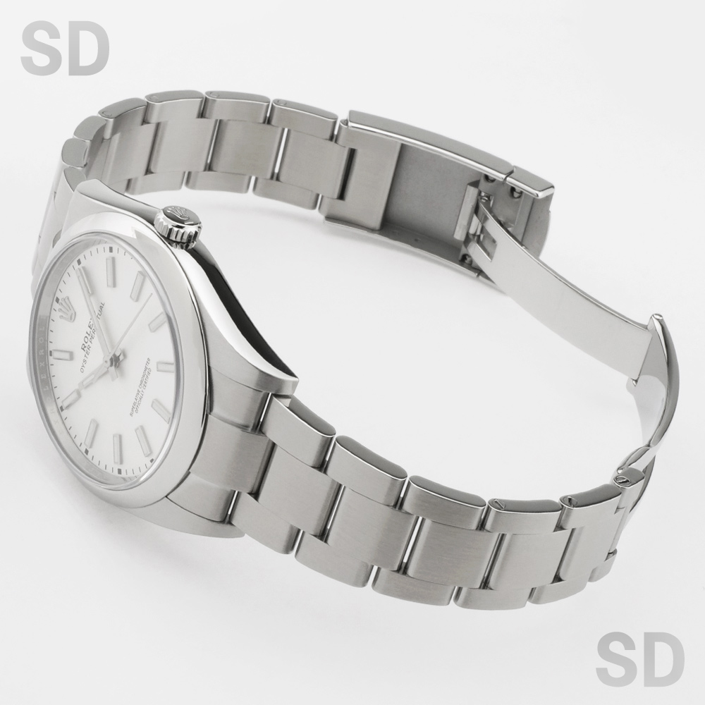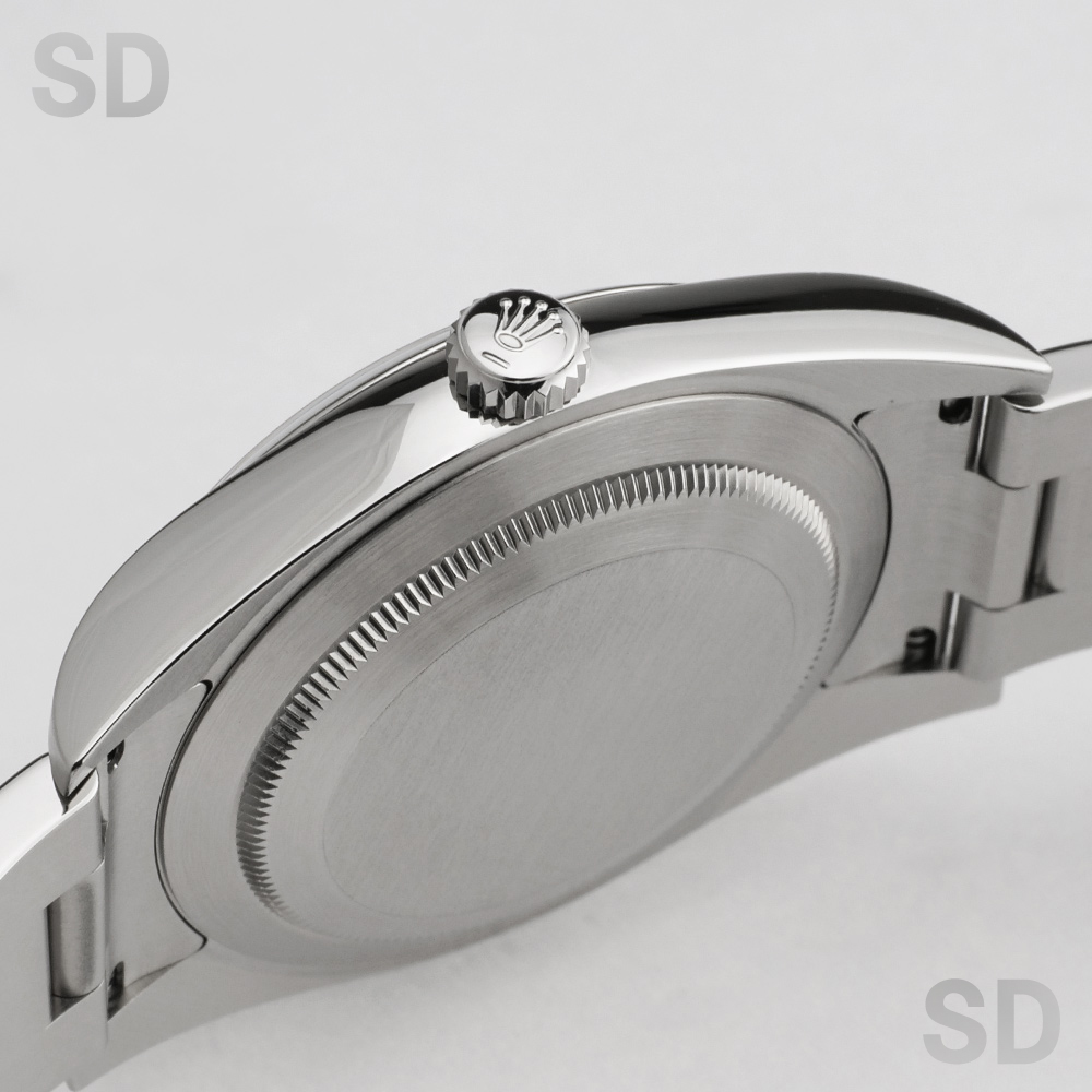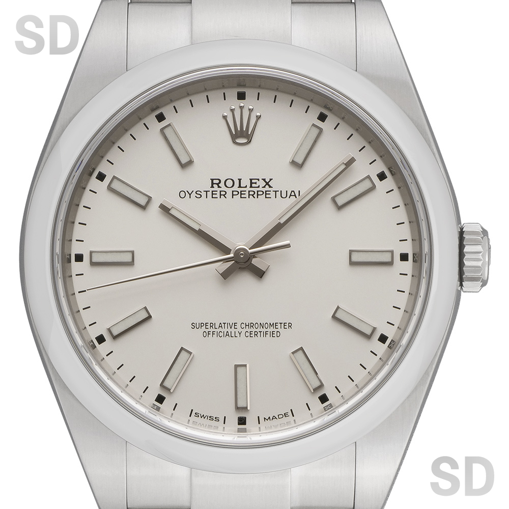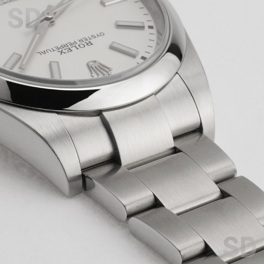 こちらの個体は2015年から2020年頃まで製造されていた旧型モデル。ロレックスの3大発明のうち「オイスターケース」と「パーペチュアル」の2つを搭載したオイスター パーペチュアル。無駄のない無い柔らかなフォルムで、バリエーション豊富なケースサイズが特徴的です。大型な39mmケースに、丸みを帯びたドーム型のポリッシュベゼルと、堅牢性の高いオイスターブレスが装着。ダイヤルはこのモデル特有の若干アイボリー色が入ったホワイトがセットされています。
