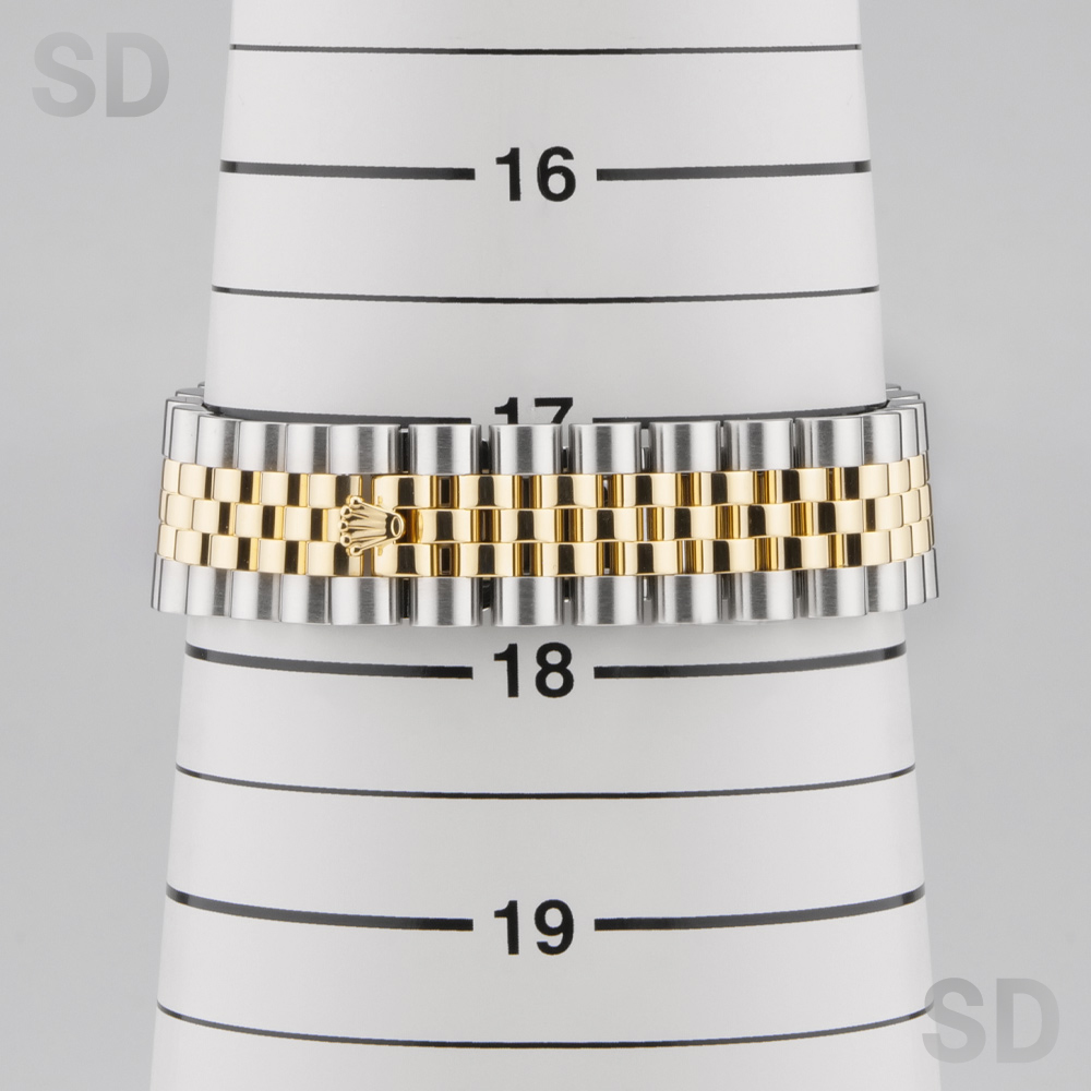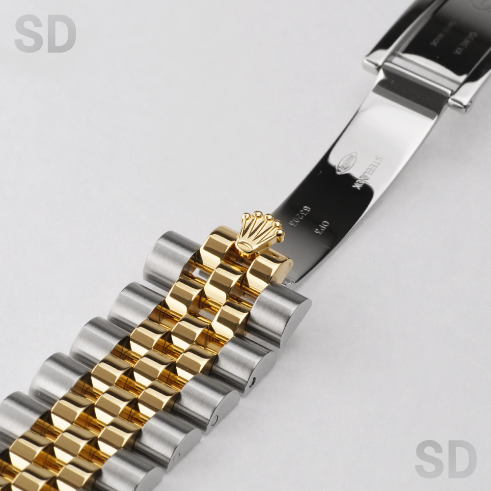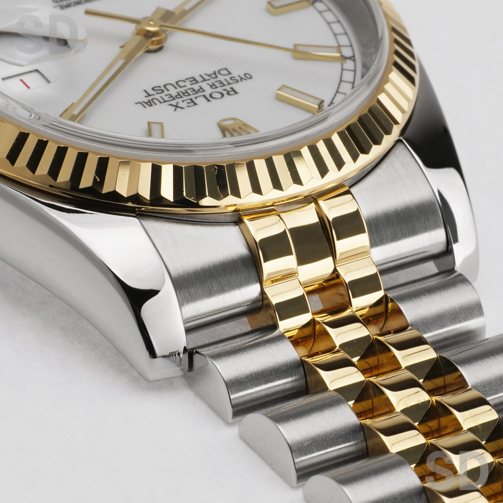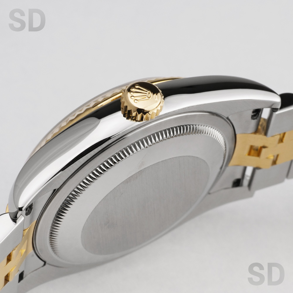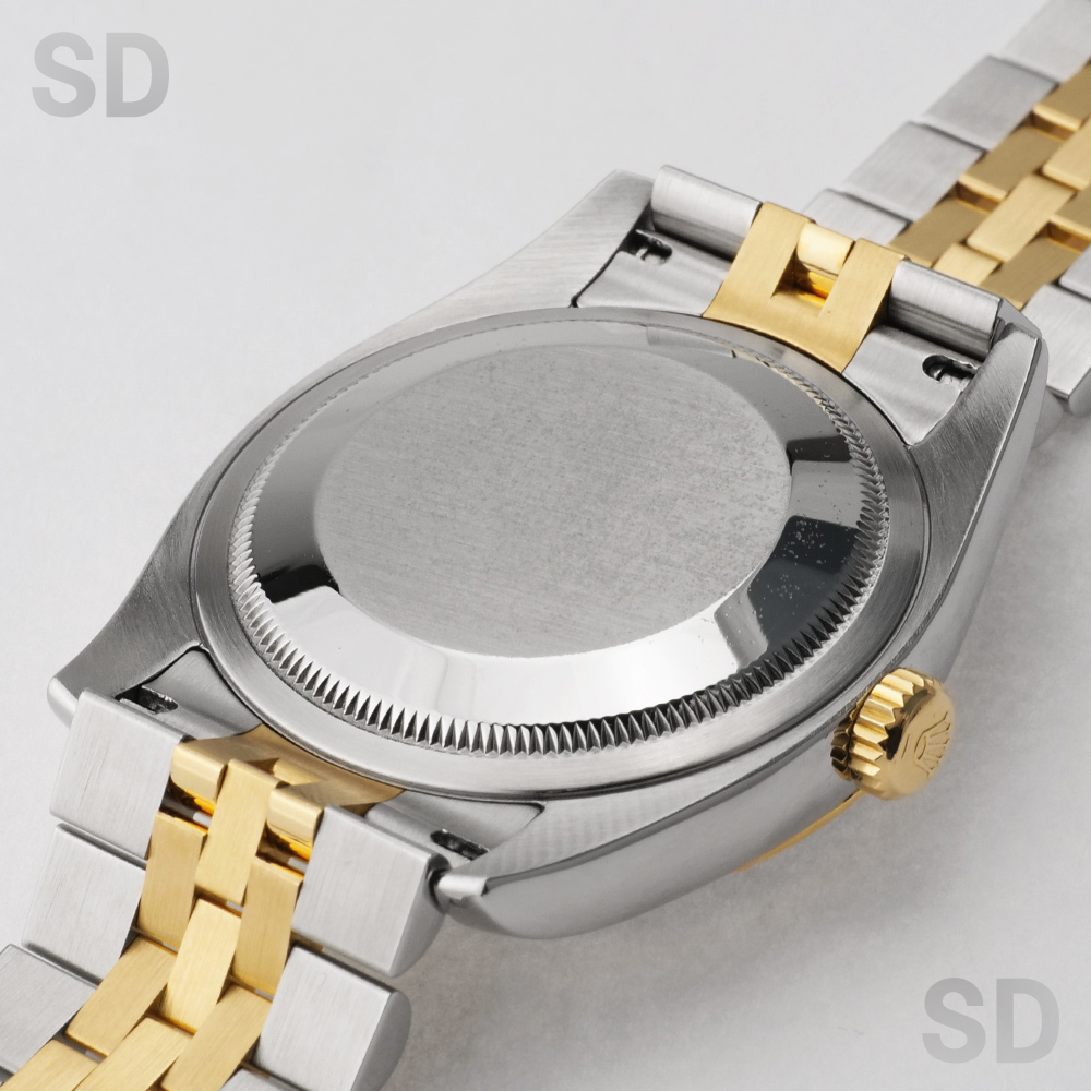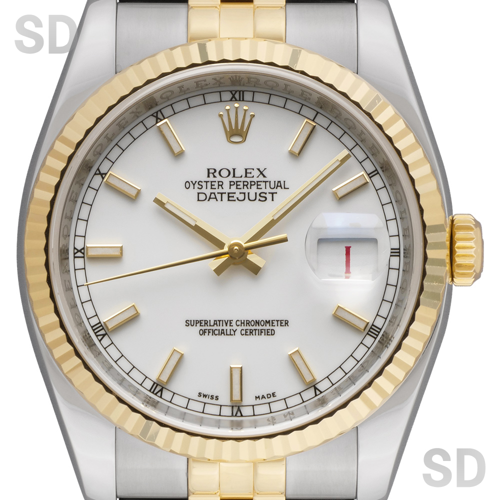こちらはステンレススチールと18Kイエローゴールドのコンビネーションが美しく調和した、華やかさと上品さを兼ね備えた一本でございます。ロレックスならではのフルーテッドベゼルが高級感を際立たせ、シーンを選ばず腕元をエレガントに演出いたします。ダイアルには清潔感と品格を併せ持つホワイトダイアルを採用しており、視認性にも優れたクラシカルなデザインが魅力です。また、本個体は赤黒交互の日付表示(通称:赤黒カレンダー) を搭載しており、希少な仕様となっております。